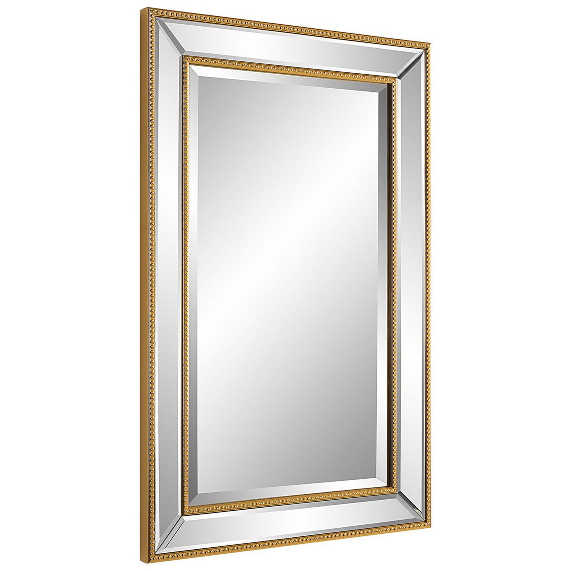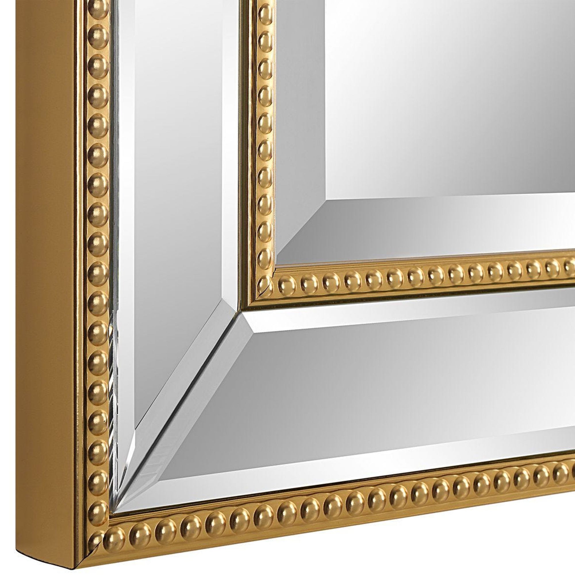 The Mary Mirror is an elegant piece featuring a frame crafted with beveled mirror panels, accented with fine gold beading that gracefully outlines both the inner and outer frames. The center mirror boasts a 1-inch bevel. This stunning mirror may be hung either vertically or horizontally for flexible placement.