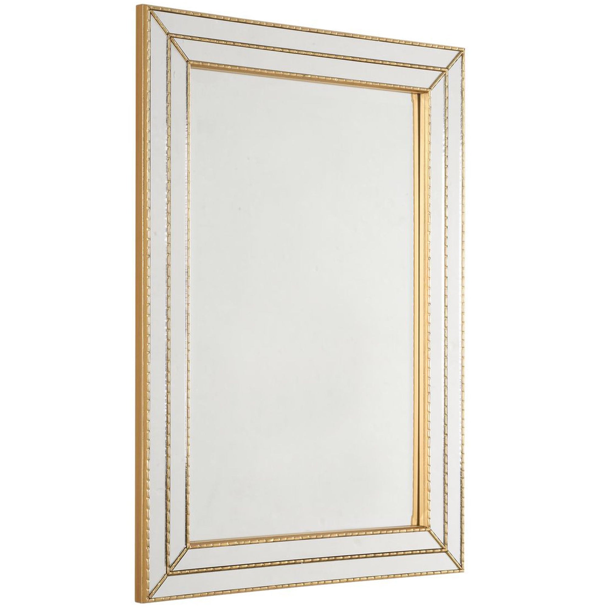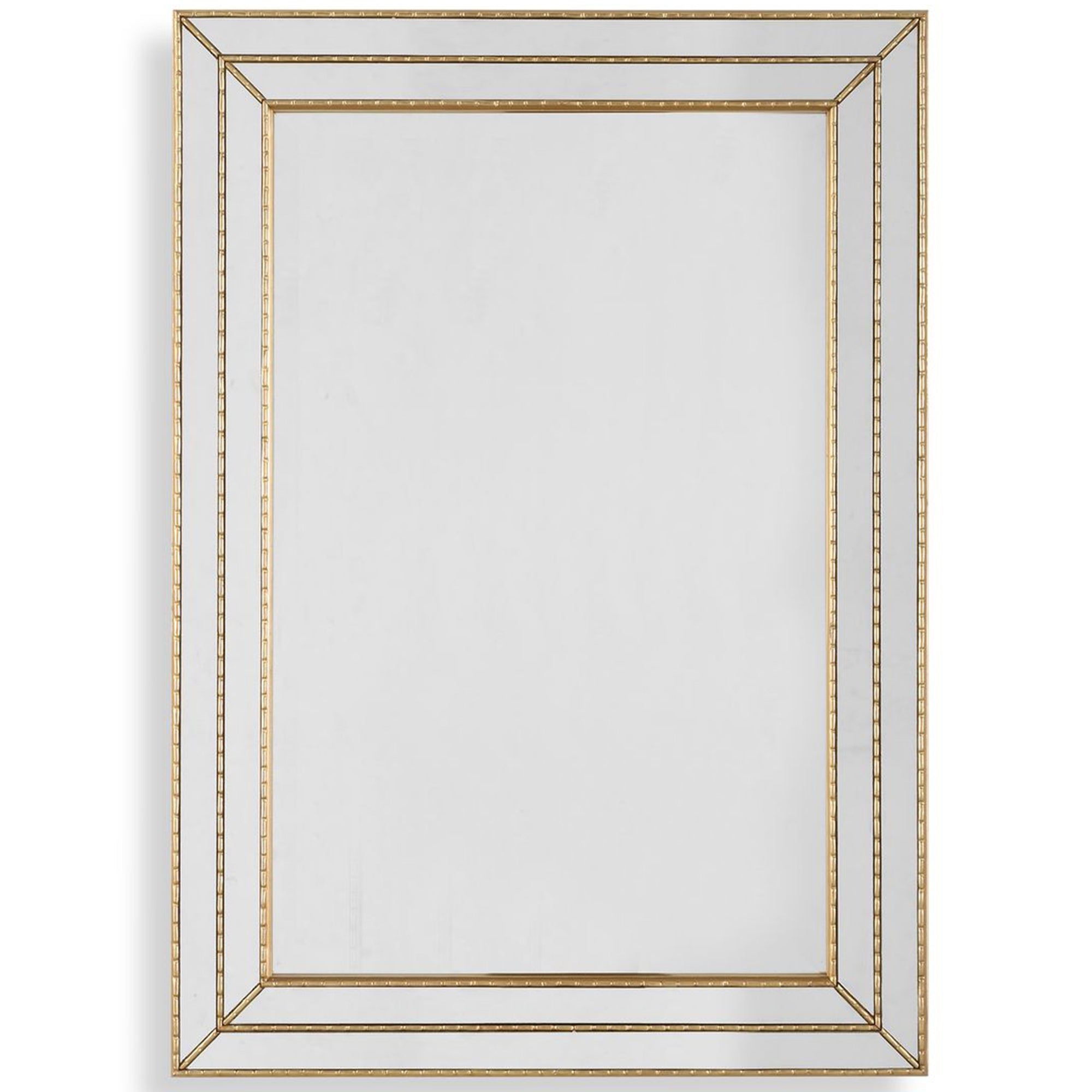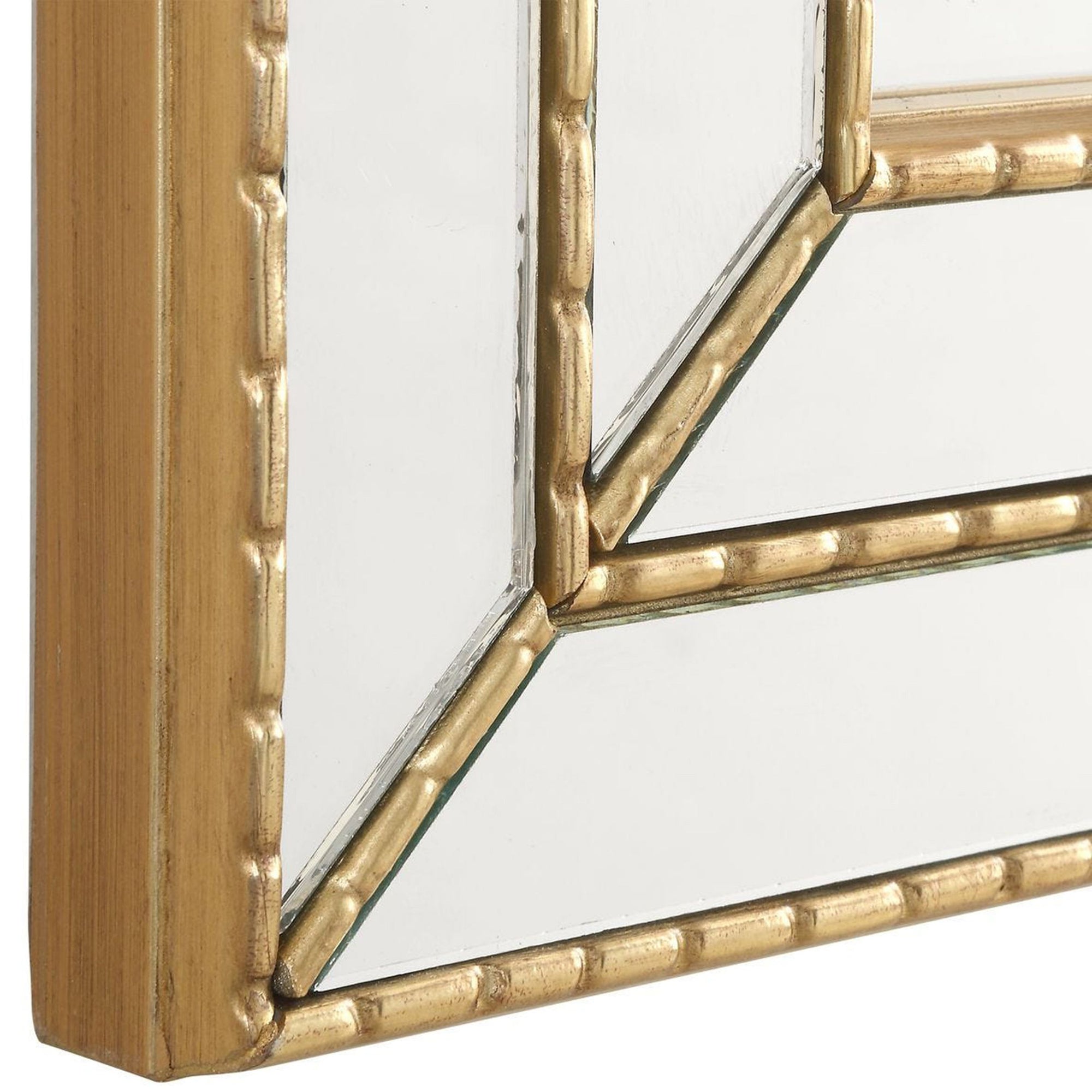 The Max Mirror features mirror inlays separated by thin, grooved framing strips, finished in a metallic bronze. The center mirror has a 1" bevel. This frame may be hung either vertically or horizontally.
