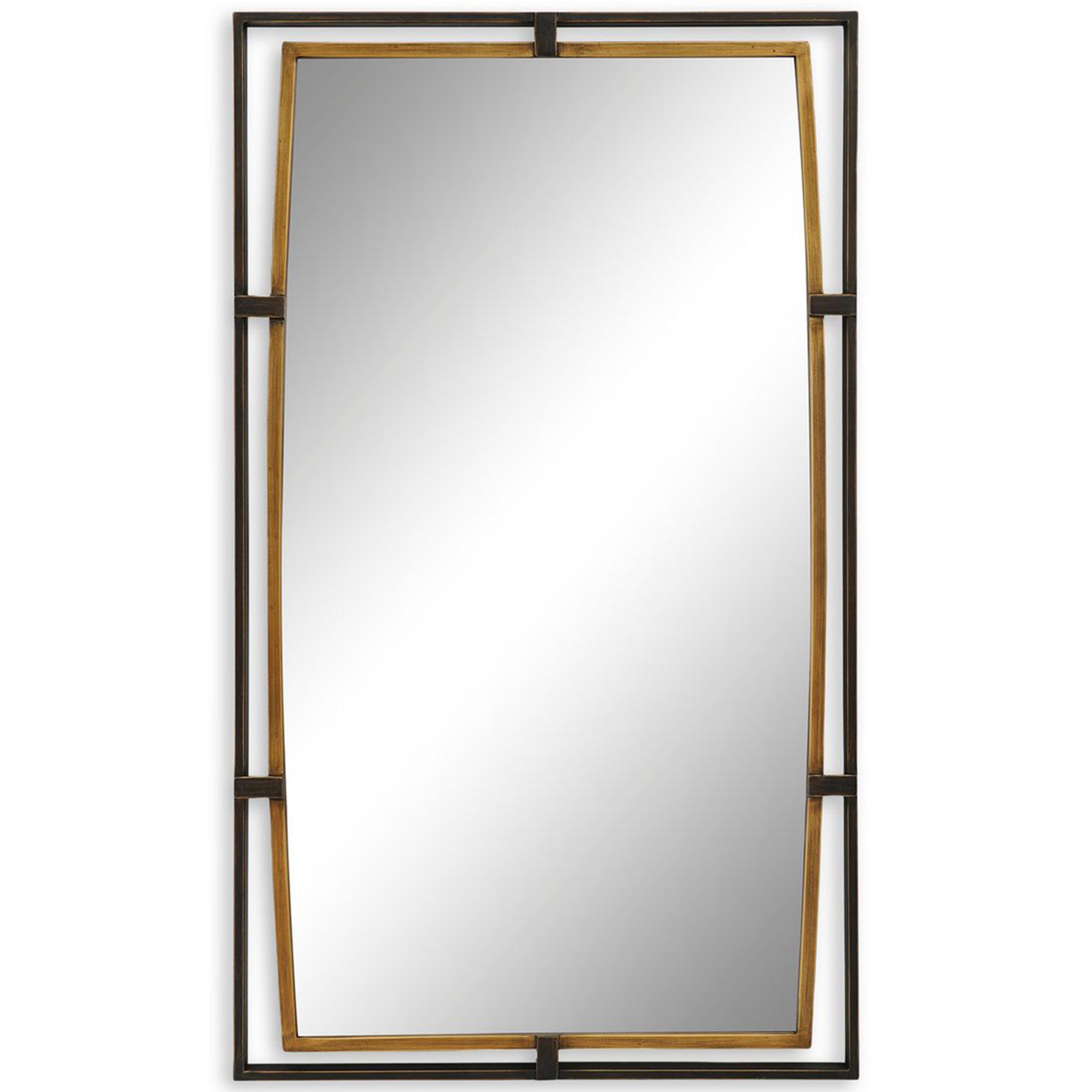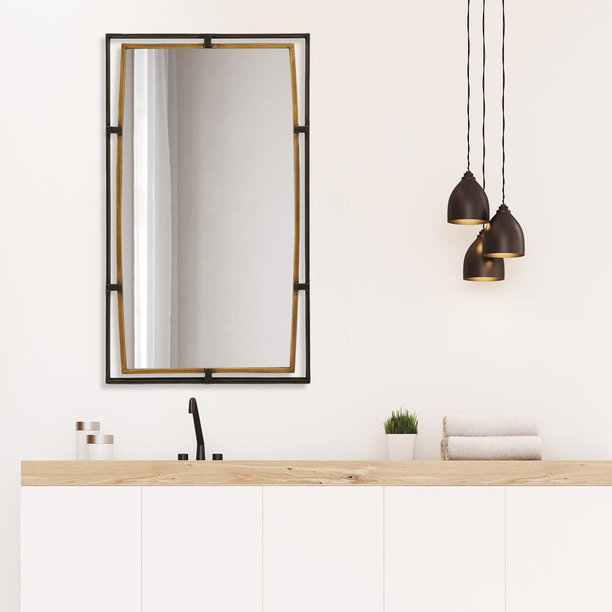 The Sabino Mirror features a dual-frame design with a rectangular outer frame in distressed rustic bronze and a unique inner frame finished in lightly antiqued gold. Can be hung vertically or horizontally to enhance any room with layered visual interest.