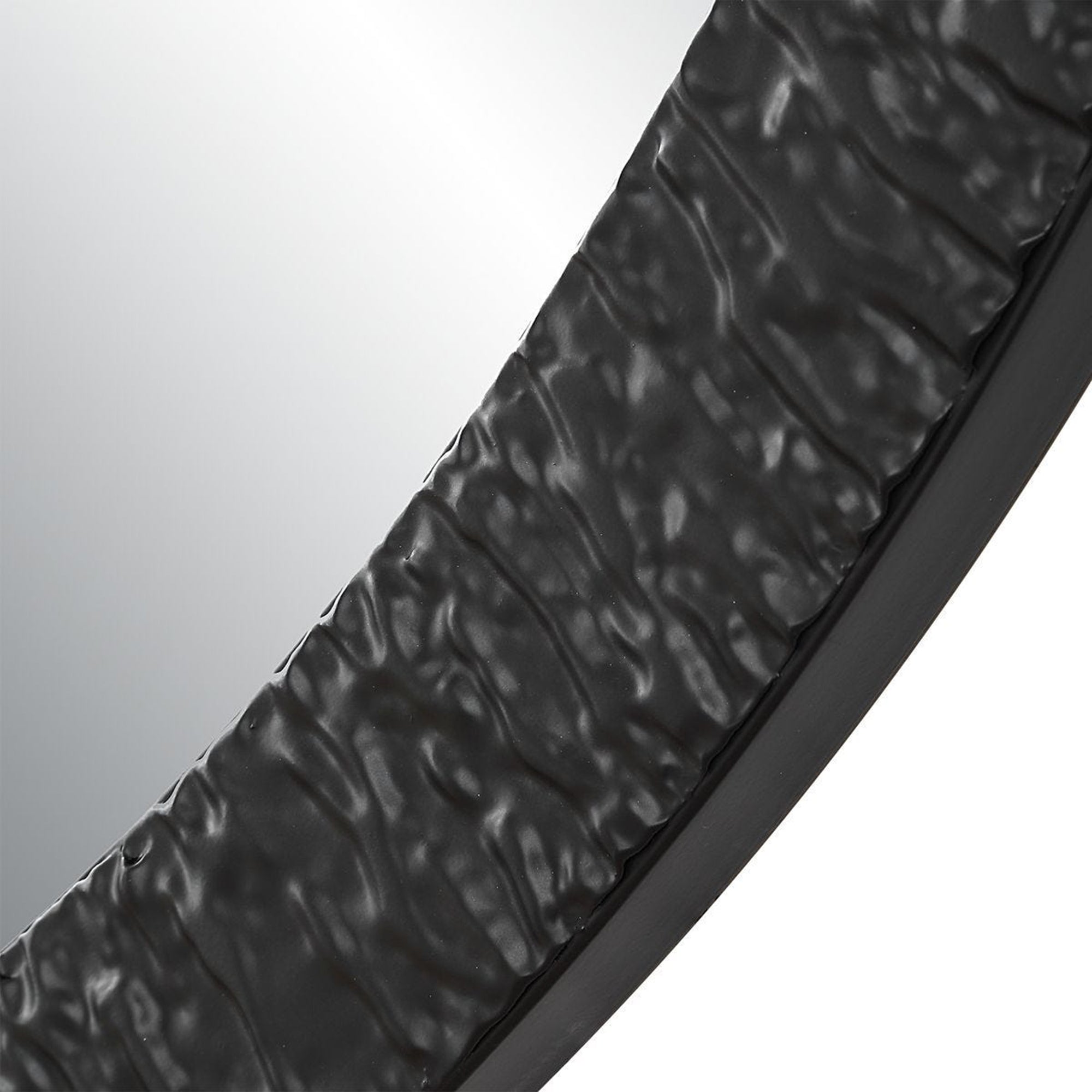 The Selene Mirror is a 34" round mirror that blends functionality with artistic design. Its plain mirror is surrounded by a uniquely textured iron frame featuring raised, wavy lines for added depth and visual interest. Finished in satin black, it complements contemporary spaces effortlessly. Can be hung either vertically or horizontally.