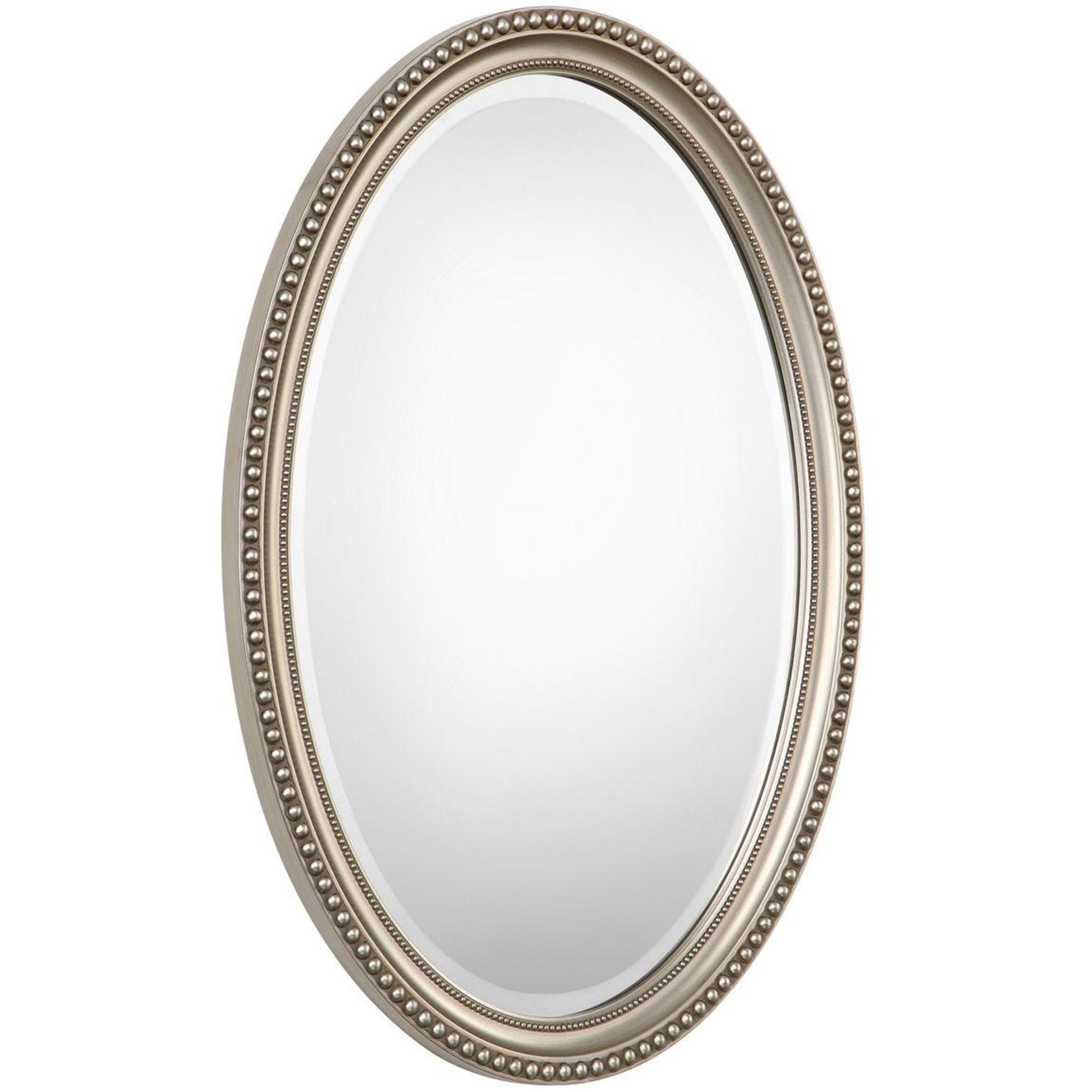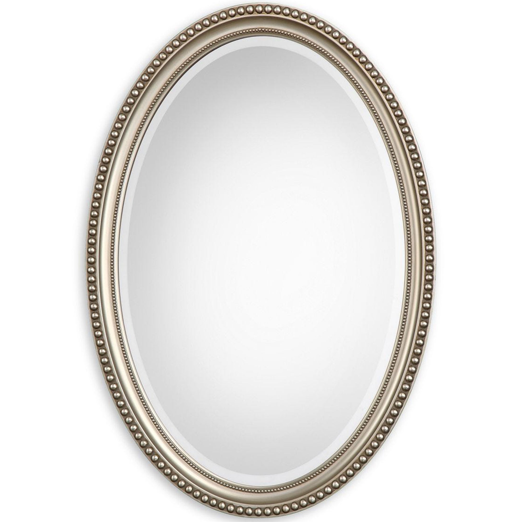 The Thu Mirror features a beaded oval frame with a metallic silver finish and subtle brown antiquing. The 1" beveled mirror adds depth and elegance, perfect for any room. Can be hung either vertically or horizontally.