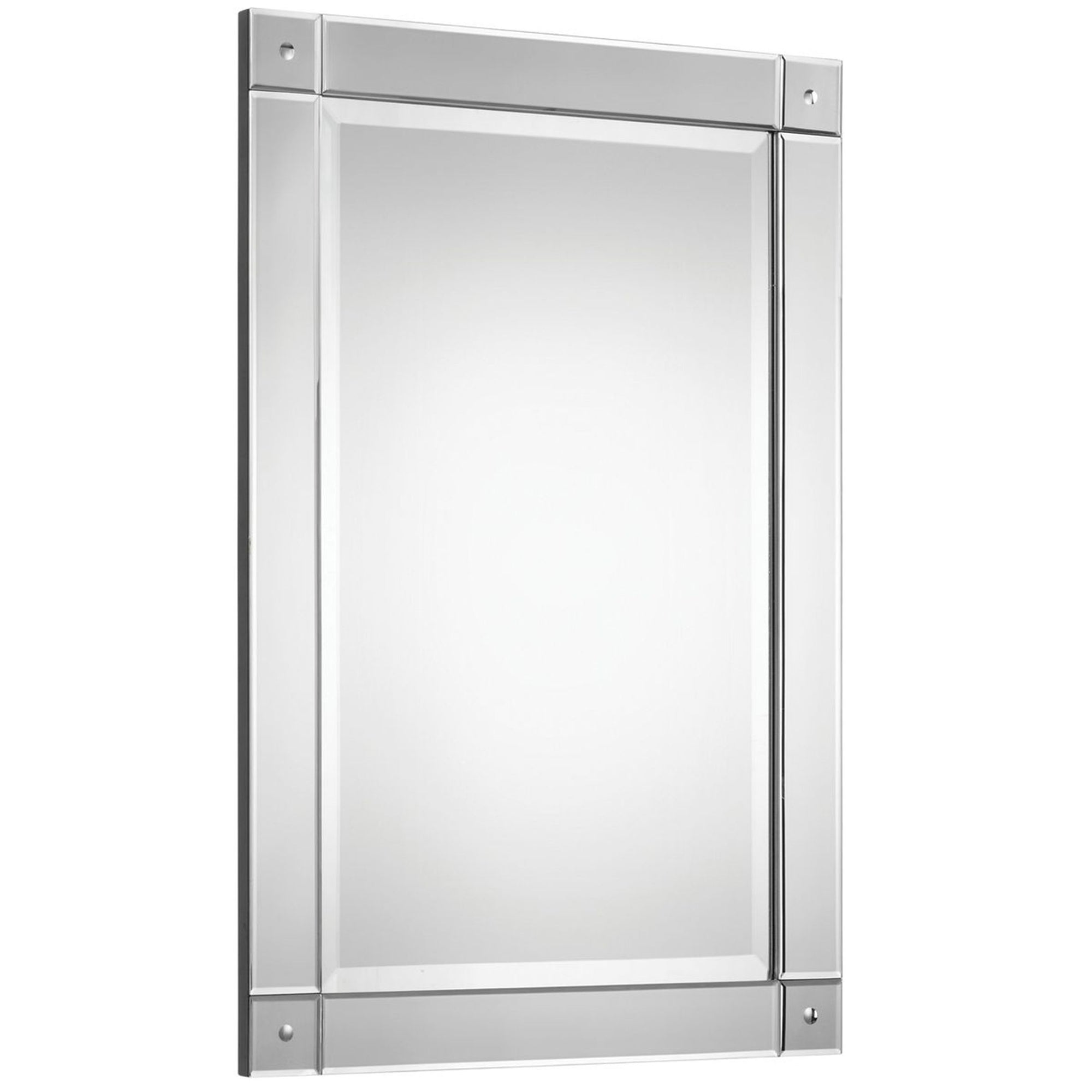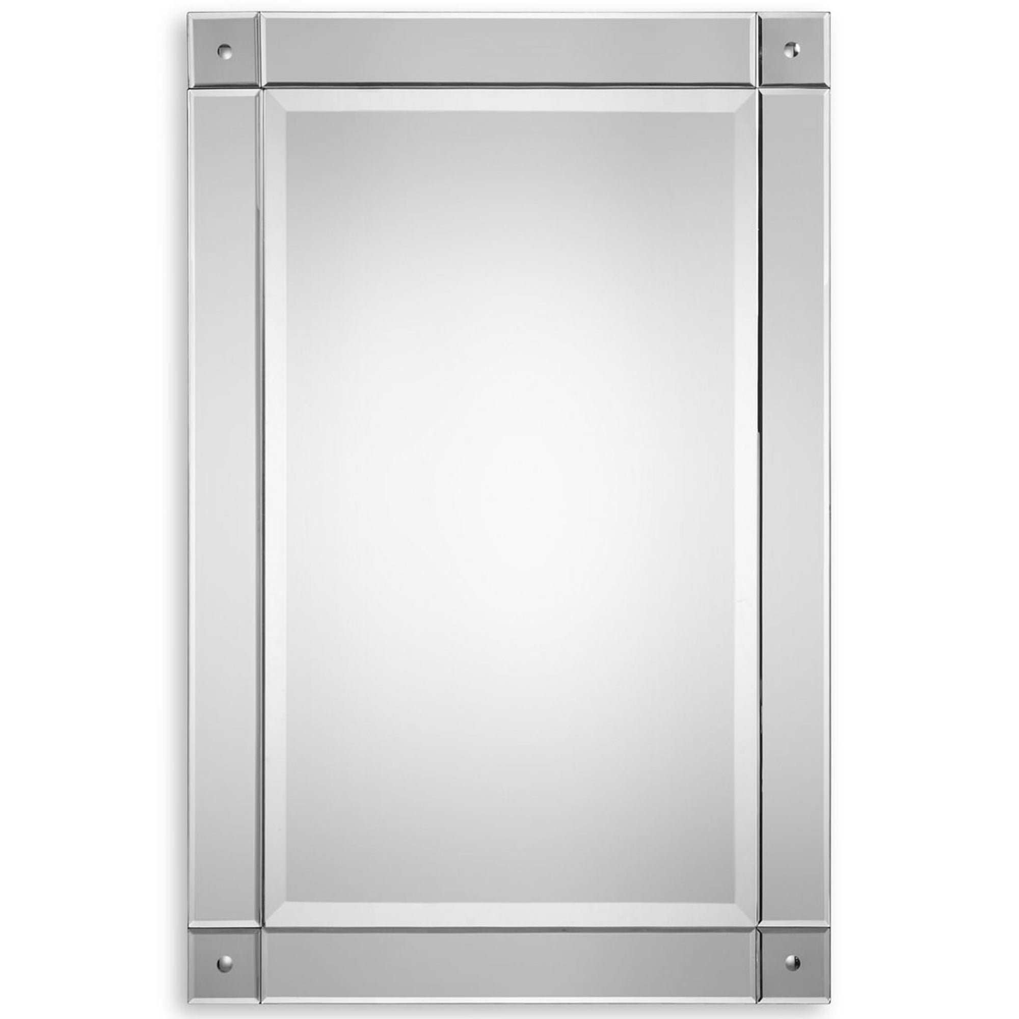 The simplicity of this frameless mirror is accented with decorative corner details. The center mirror features a 1" bevel and may be hung vertically or horizontally.