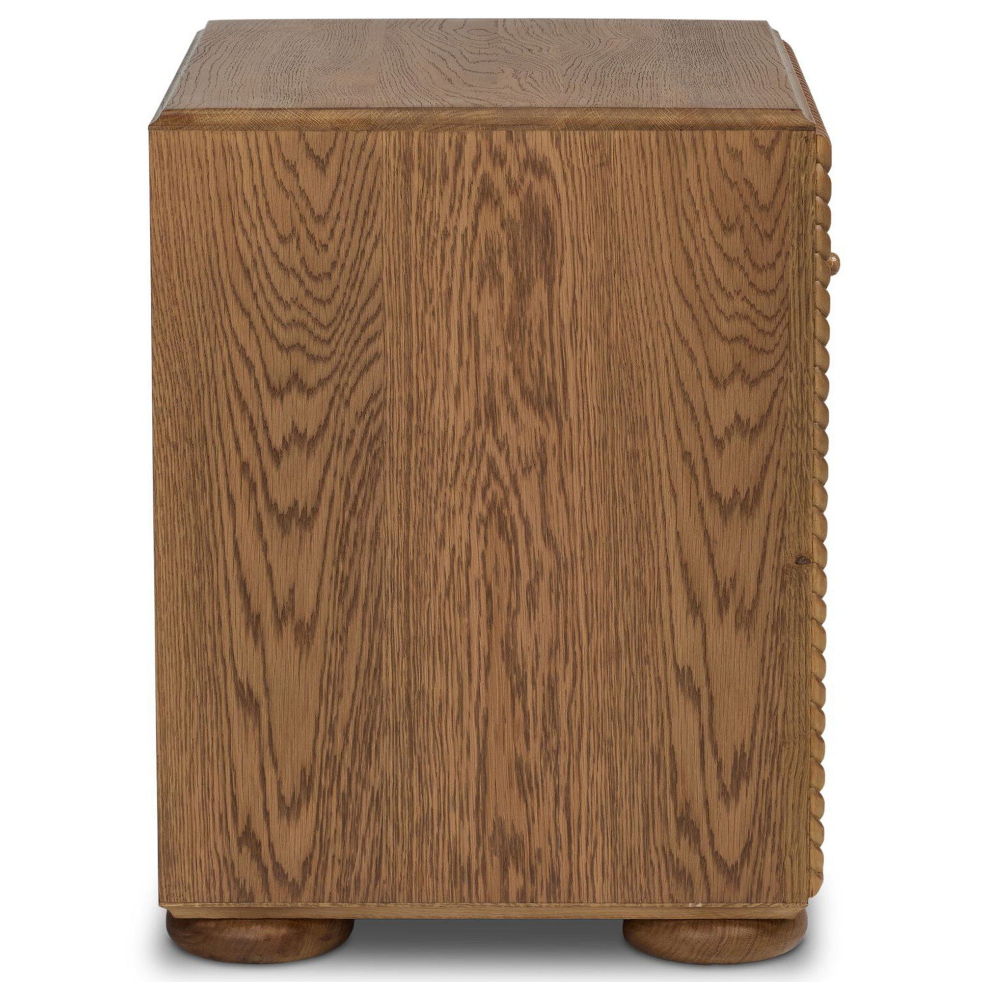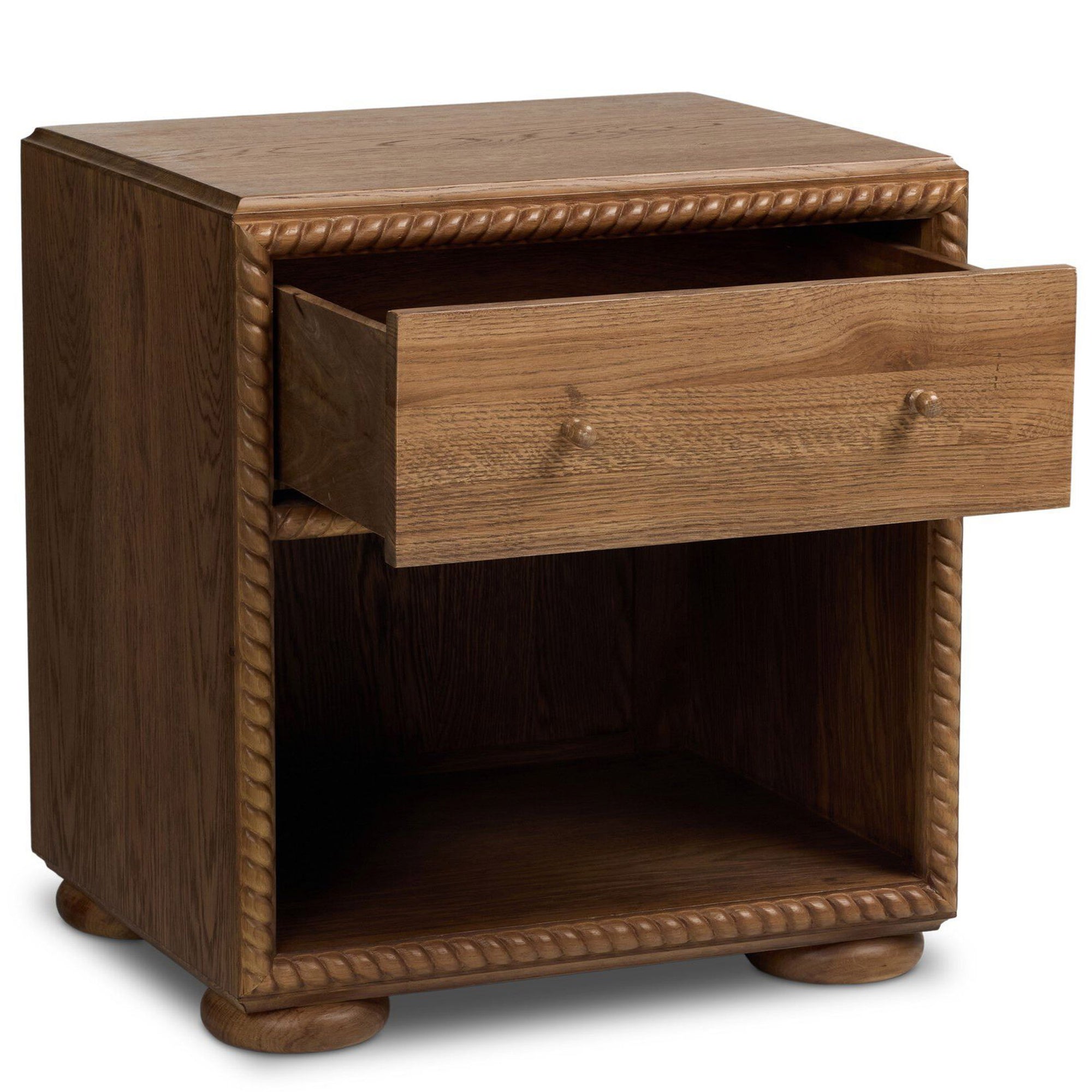 The Cormack Nightstand combines practical storage with refined design. Featuring a spacious drawer and open cubby, it offers bedside essentials within easy reach. Rope detailing around the front adds subtle texture, while a durable solid oak frame ensures lasting quality.