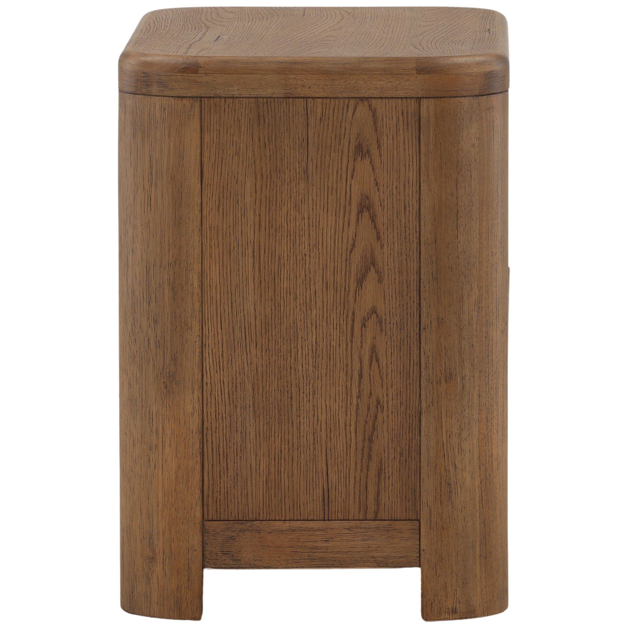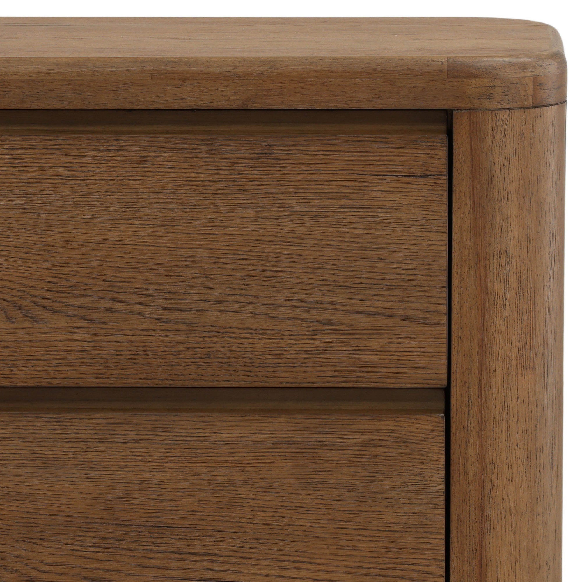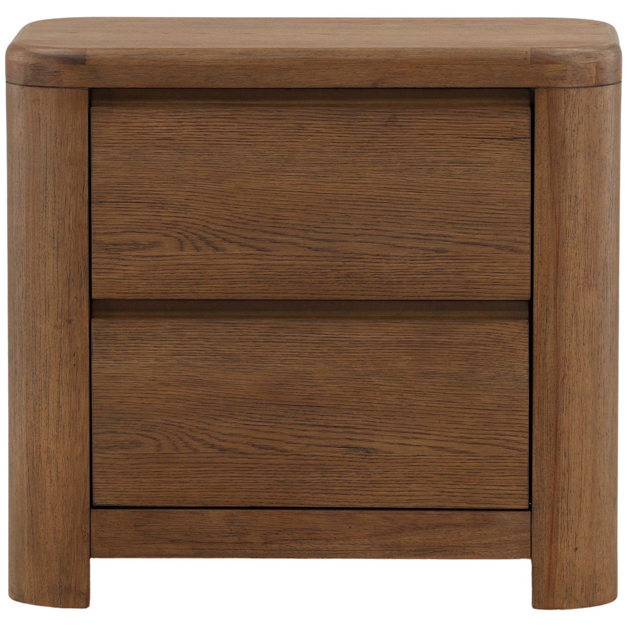 The Julis Nightstand is a compact bedside storage piece defined by its smooth, rounded corners and modern profile. It features two spacious drawers for essential bedroom storage, accented by subtle recessed drawer pulls. The entire piece rests on a low plinth base with curved edges, integrating the base seamlessly into the design. The Julis Nightstand combines functional storage with a sophisticated, contemporary aesthetic.