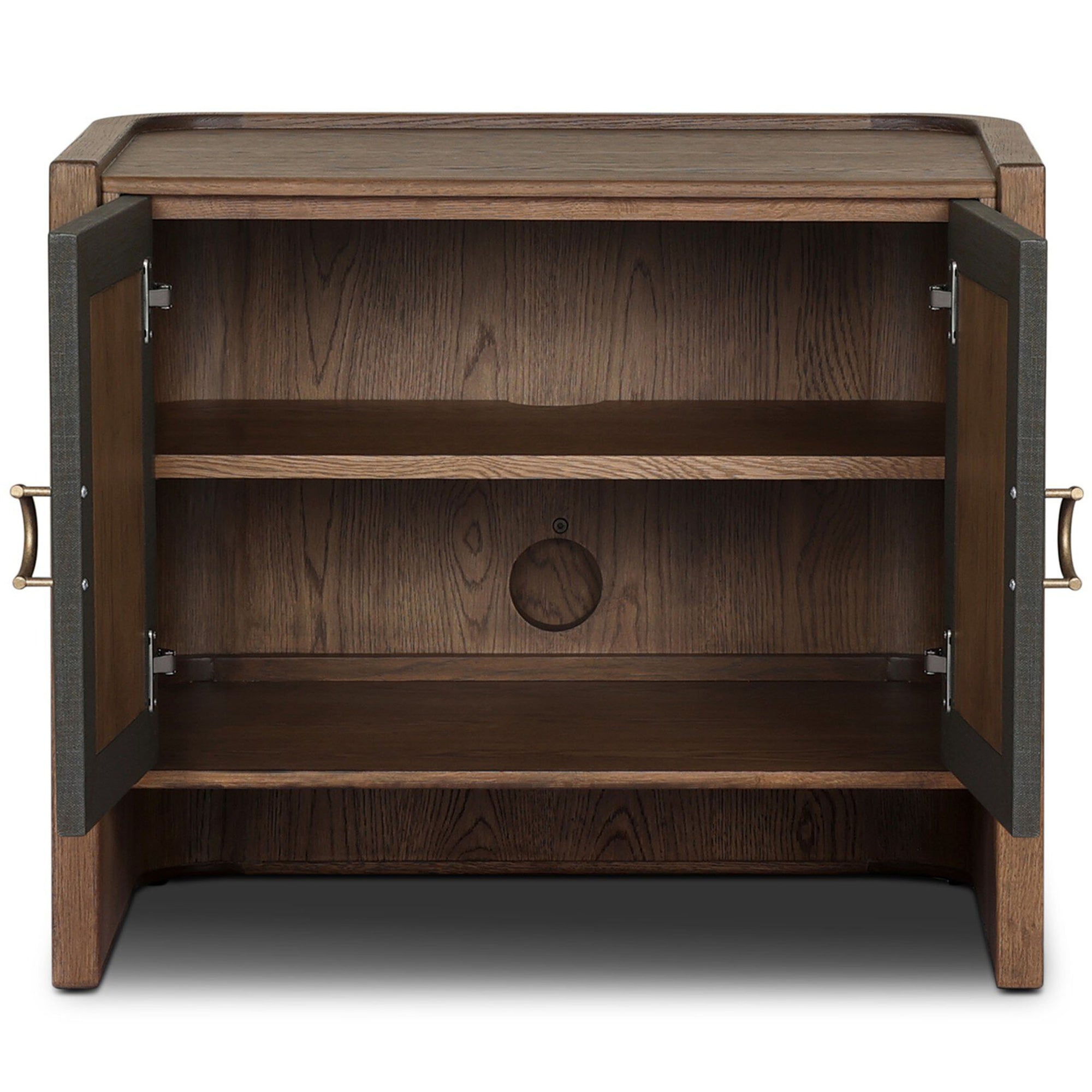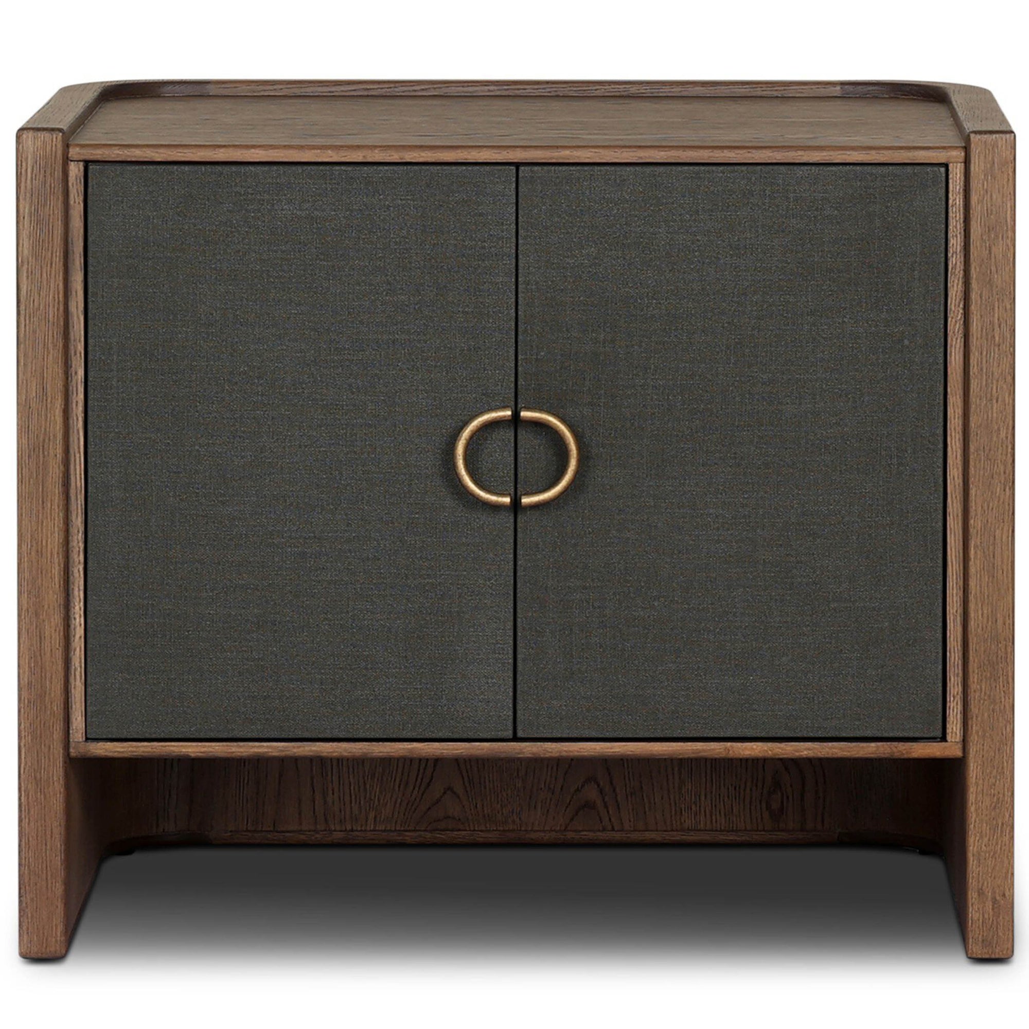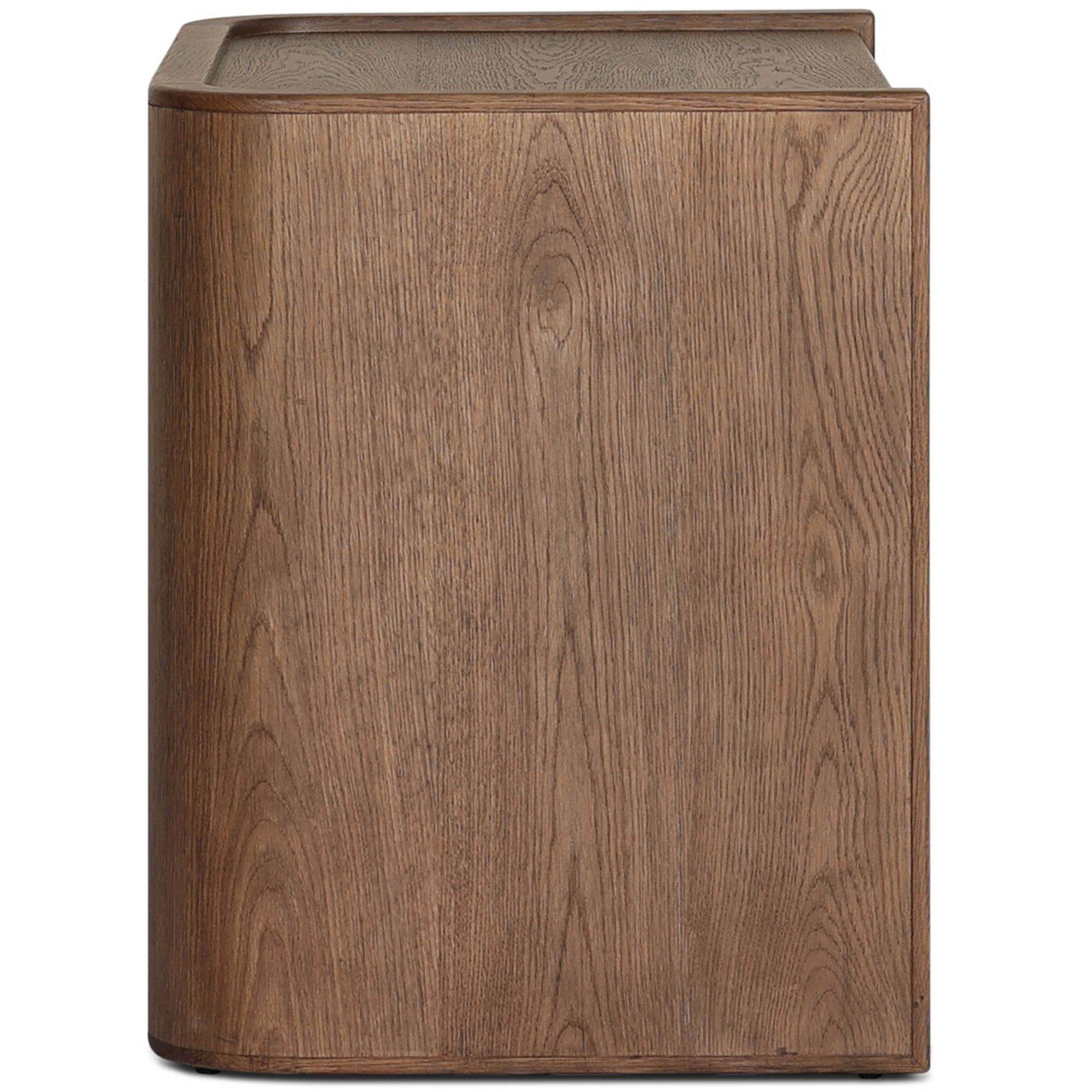 The Kiran Nightstand offers functional storage with a sleek rectangular design. Crafted from oak veneer and steel, it features soft-close doors, an adjustable shelf, and generous interior space, making it a practical and stylish addition to any bedroom.
