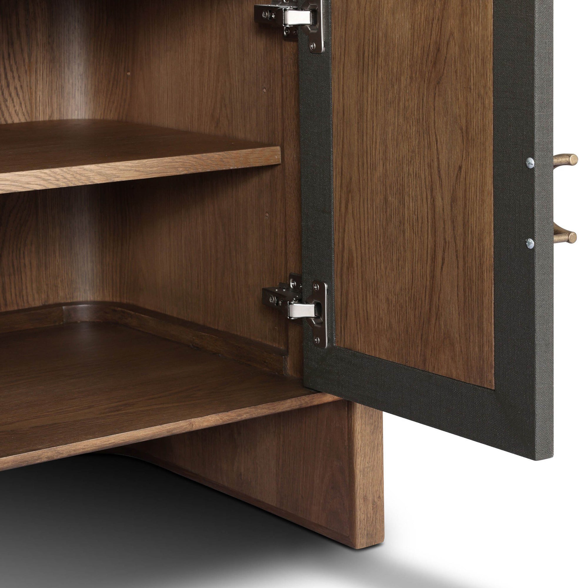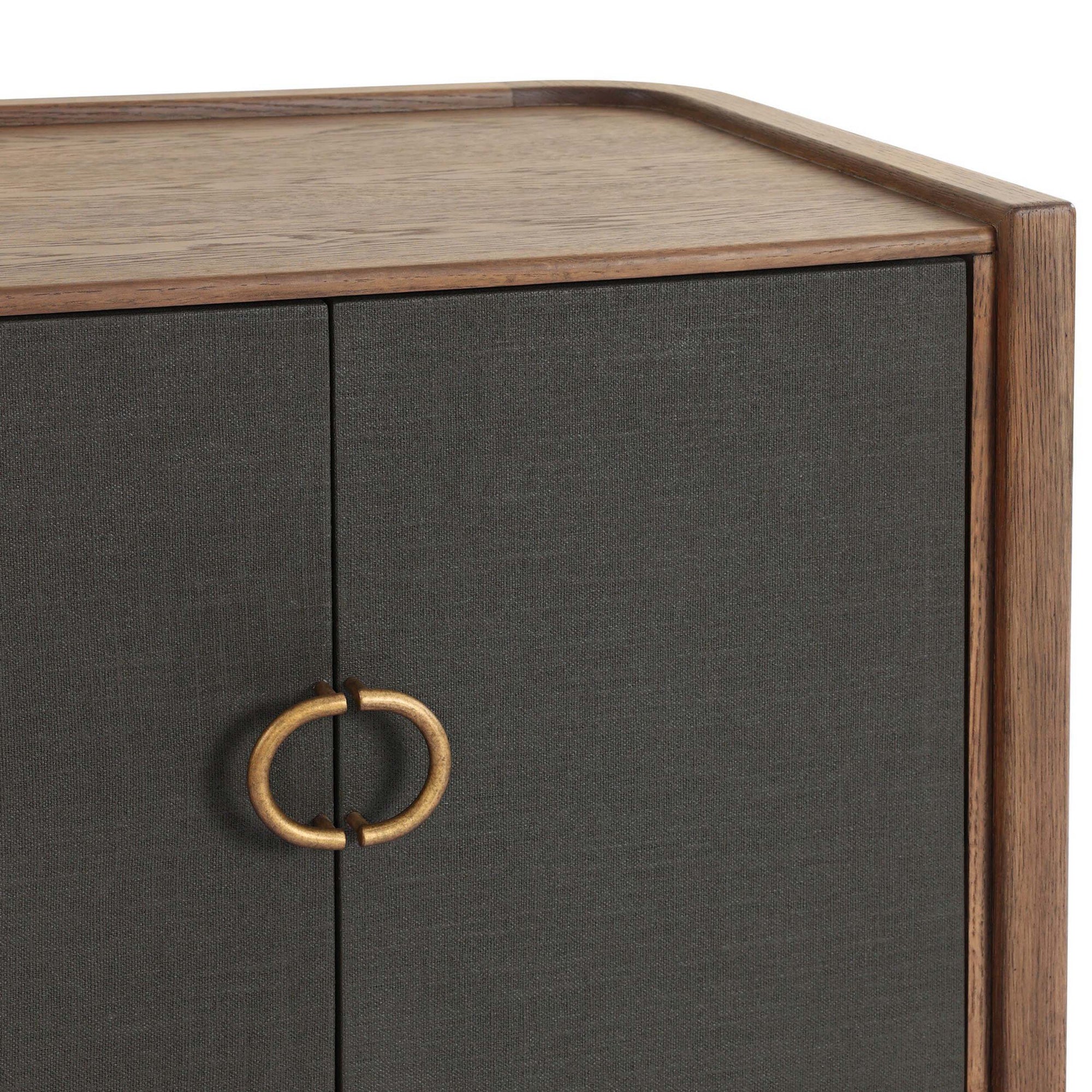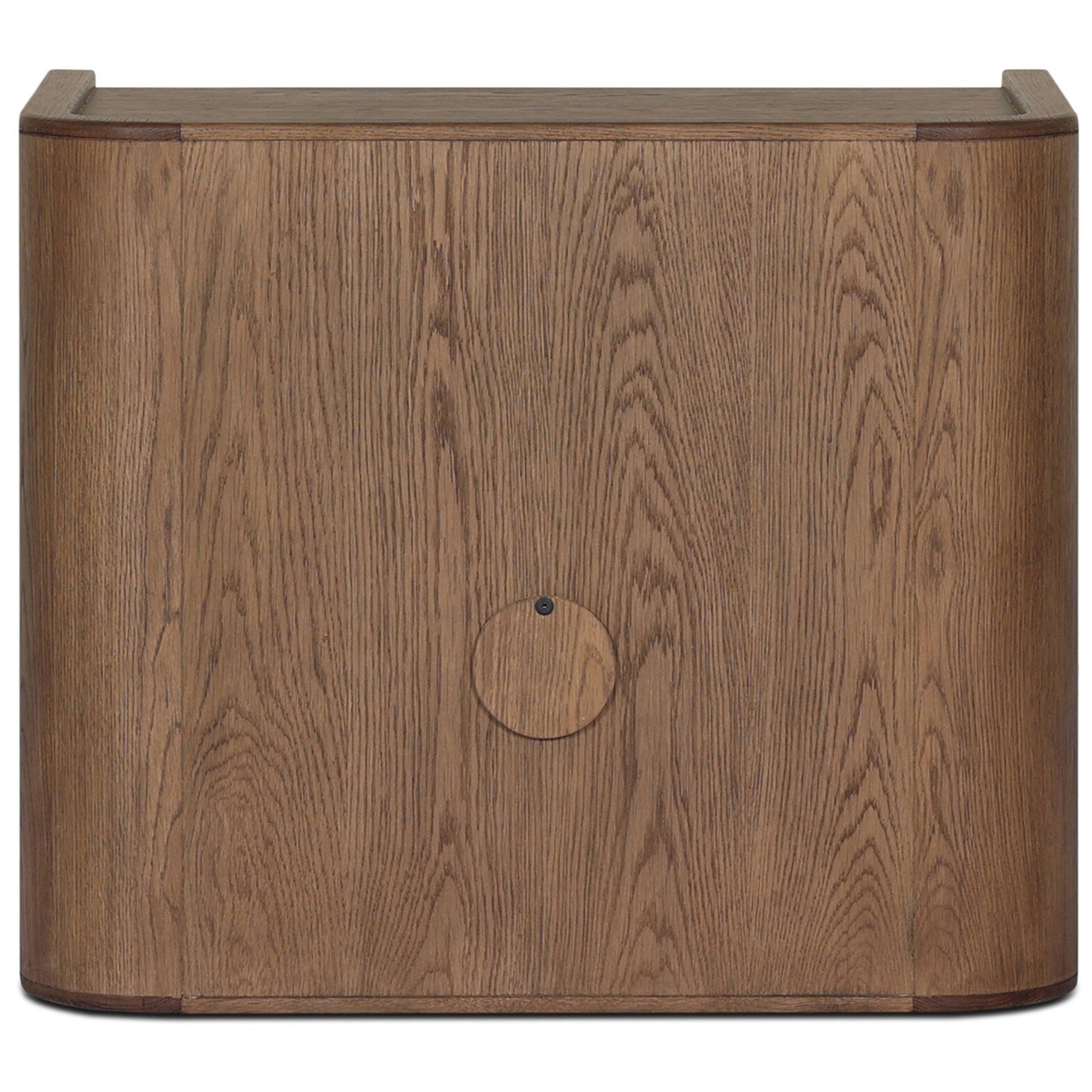 The Kiran Nightstand offers functional storage with a sleek rectangular design. Crafted from oak veneer and steel, it features soft-close doors, an adjustable shelf, and generous interior space, making it a practical and stylish addition to any bedroom.