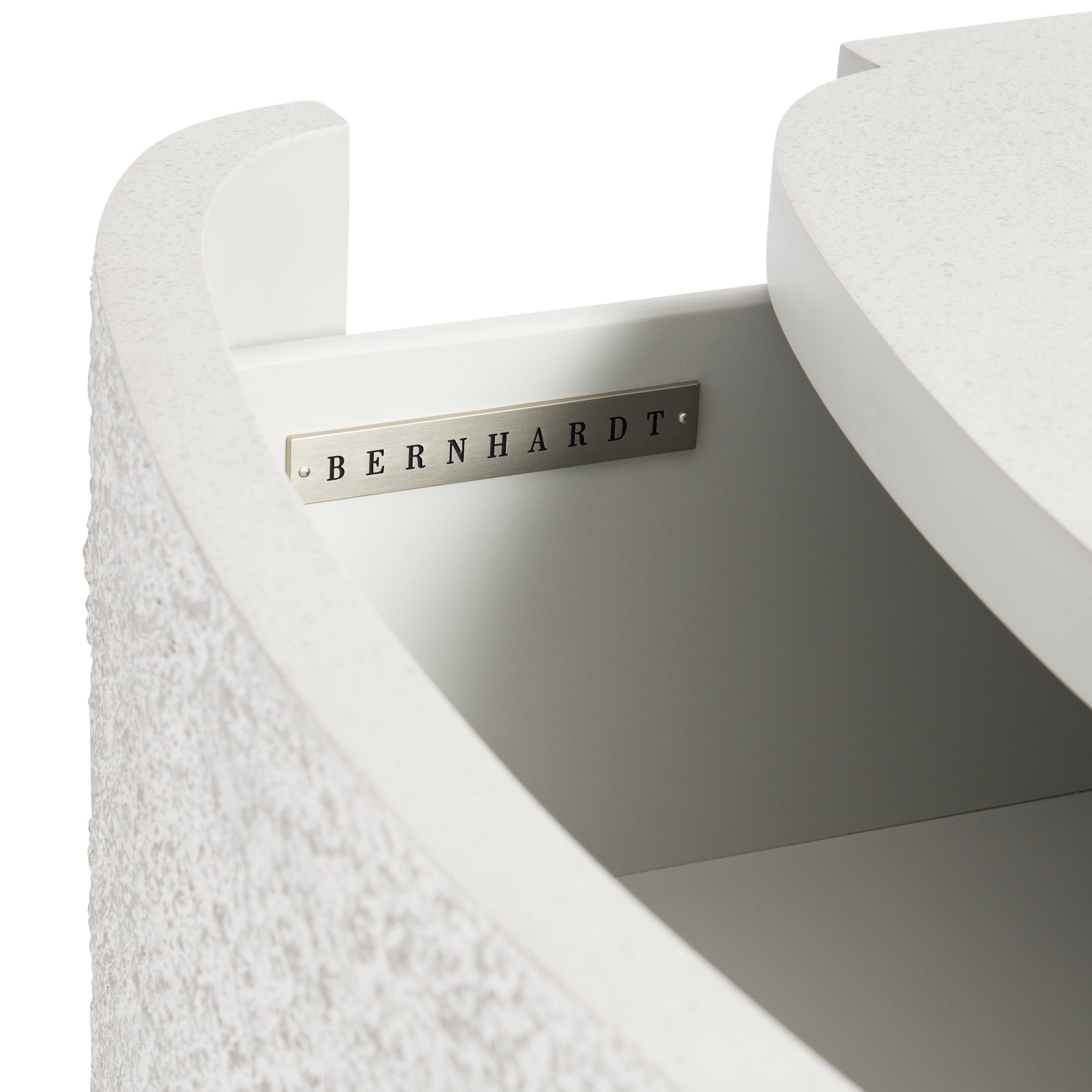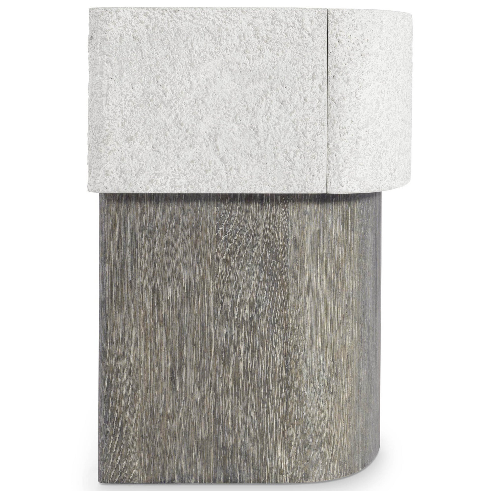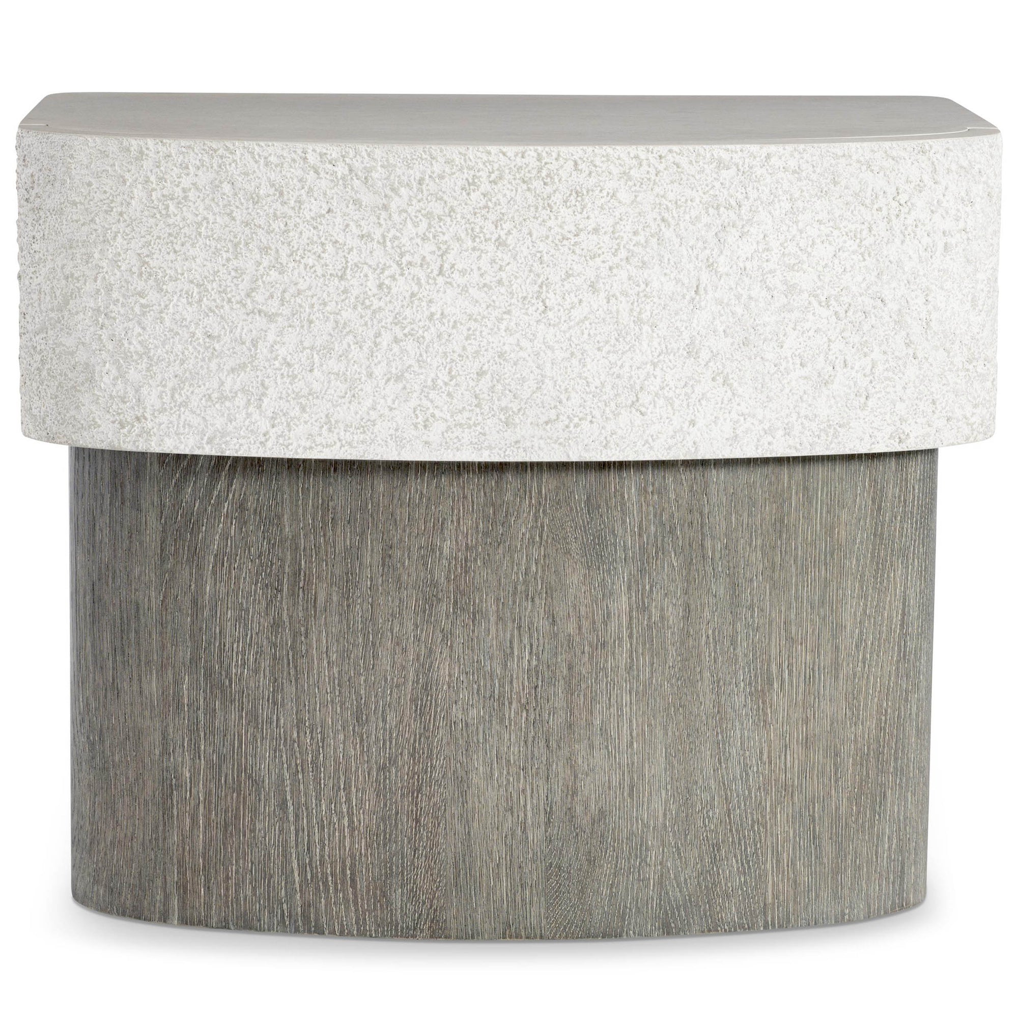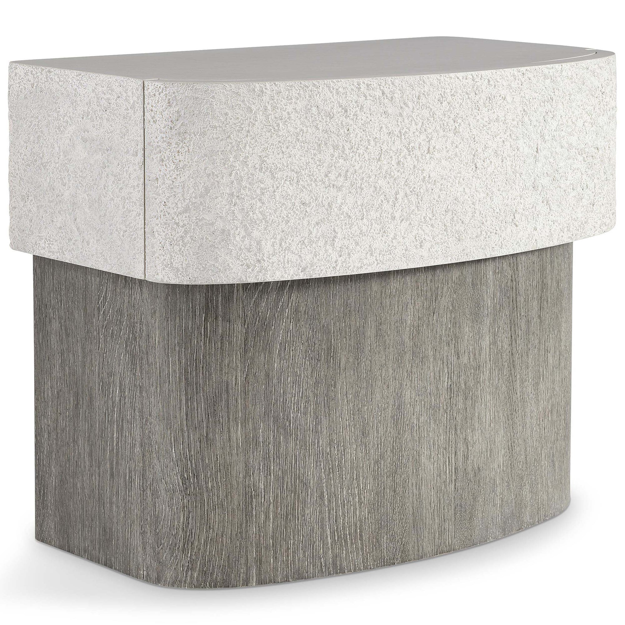 The Monolith Nightstand showcases a bold yet softened silhouette with rounded corners and organic detailing. A smooth faux stone top in Millstone finish pairs with textured sides and a wirebrushed oak base in Puma finish. One soft-close drawer with a hidden finger pull offers discreet storage while adding sculptural elegance to any bedroom.