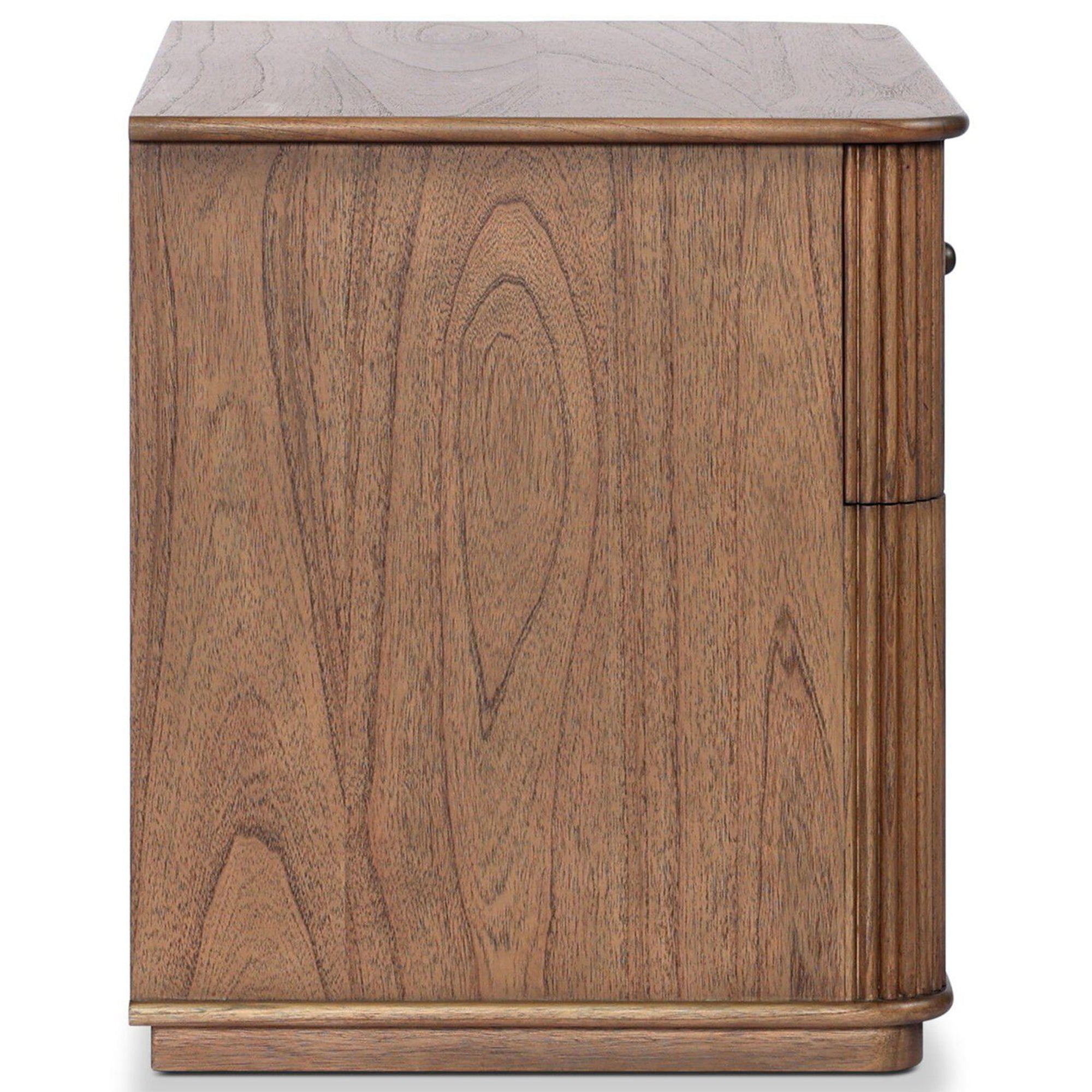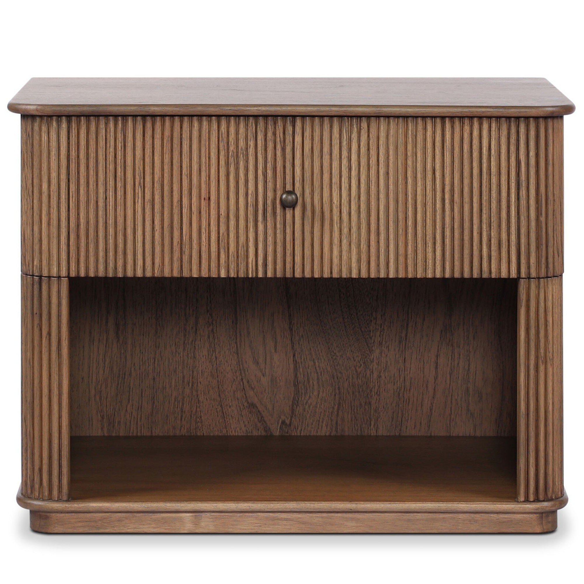 The Ona Nightstand showcases refined craftsmanship and texture. Crafted from mindi wood with a distinctive plinth-style base, a beautiful reeding pattern is expertly carved into the surface, keeping this bedside piece looking fresh and approachable. A spacious drawer, open cubby, and amber finish complete the striking sculptural form.