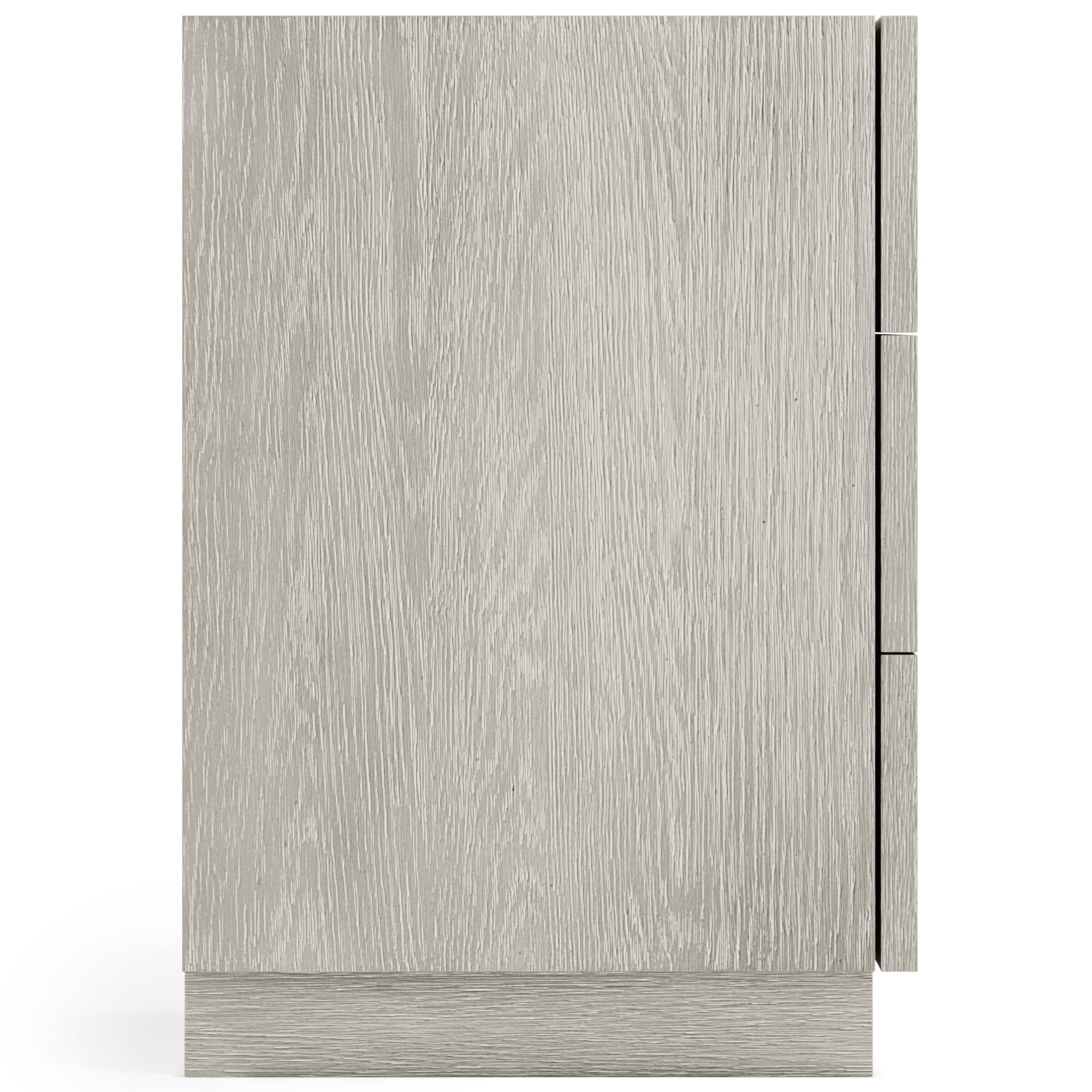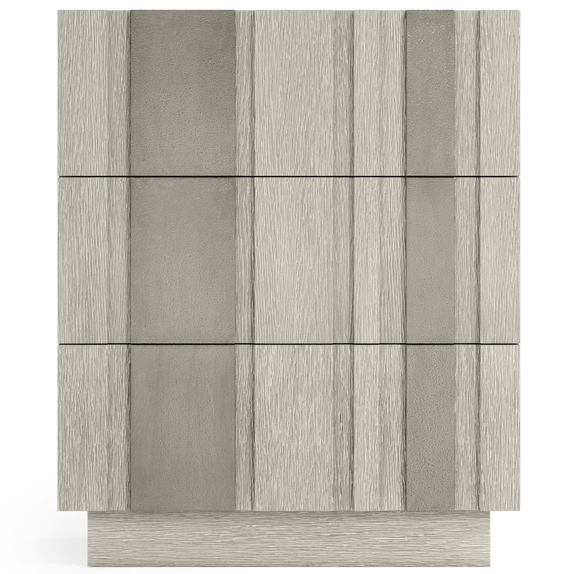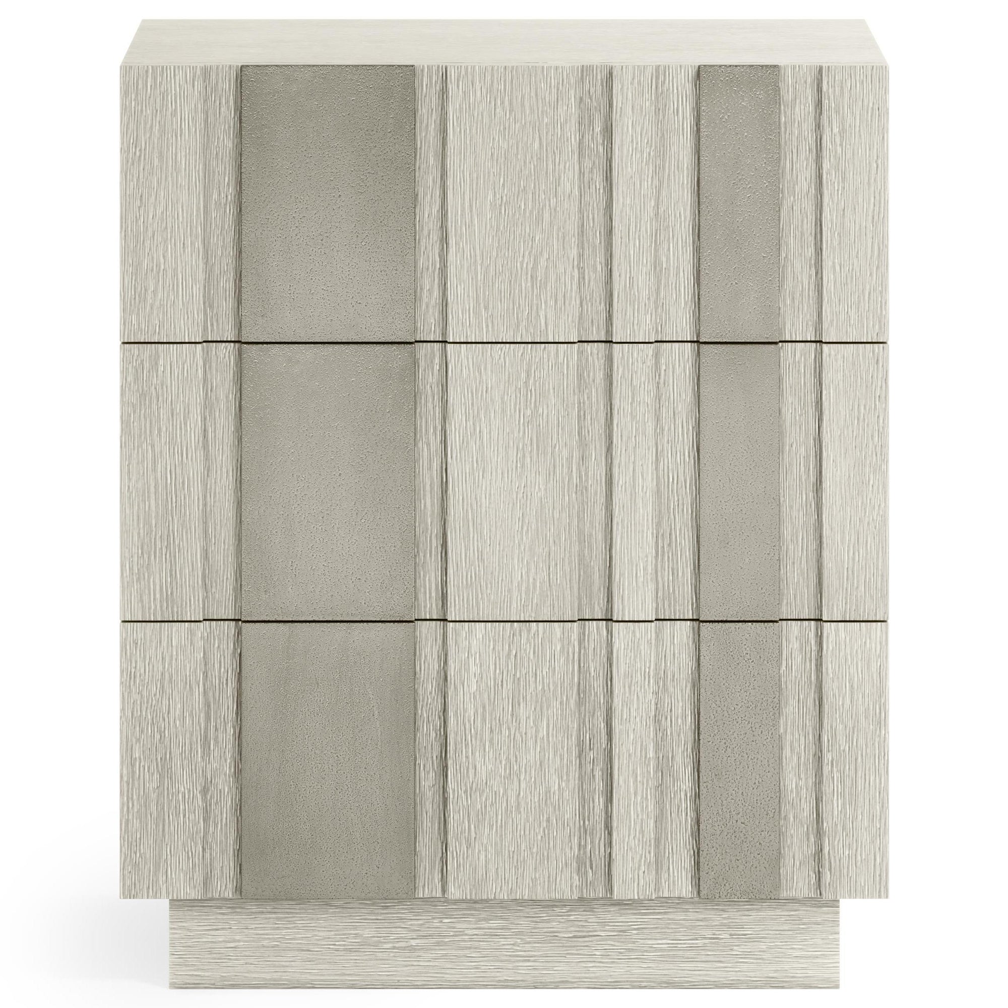 The Tempo 3 Drawer Nightstand with Metal Overlay, brings striking contrast through a layered blend of texture and geometry. Raised wood panels in a wirebrushed oak finish meet sandblasted aluminum overlays in Satin Nickel, creating a dynamic play of light and shadow. A plinth base and hidden tech features complete its modern, sculptural appeal.