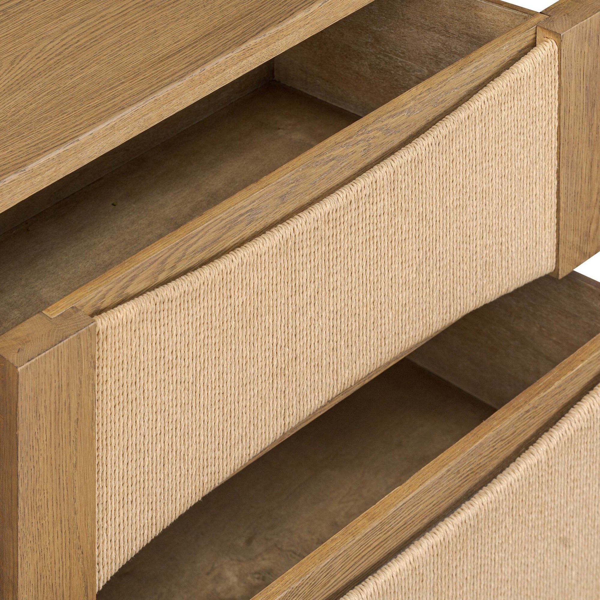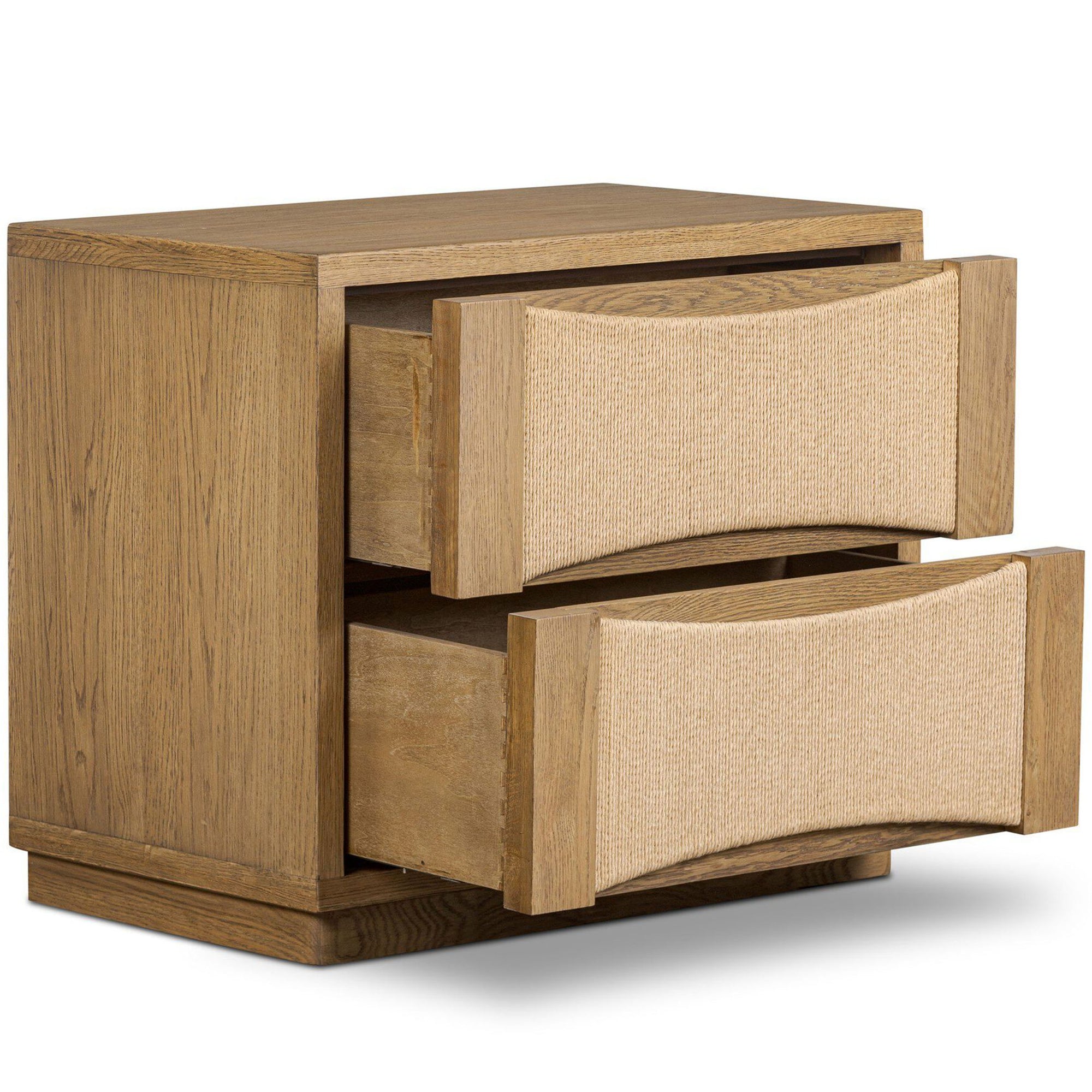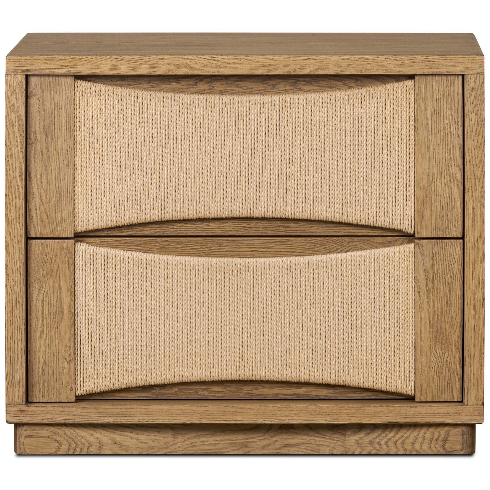 The Wilmina Nightstand combines modern design with natural textures. Featuring scooped panels, integrated hardware, and woven paper cord drawers, this two-drawer nightstand provides functional storage while maintaining a clean, seamless silhouette.