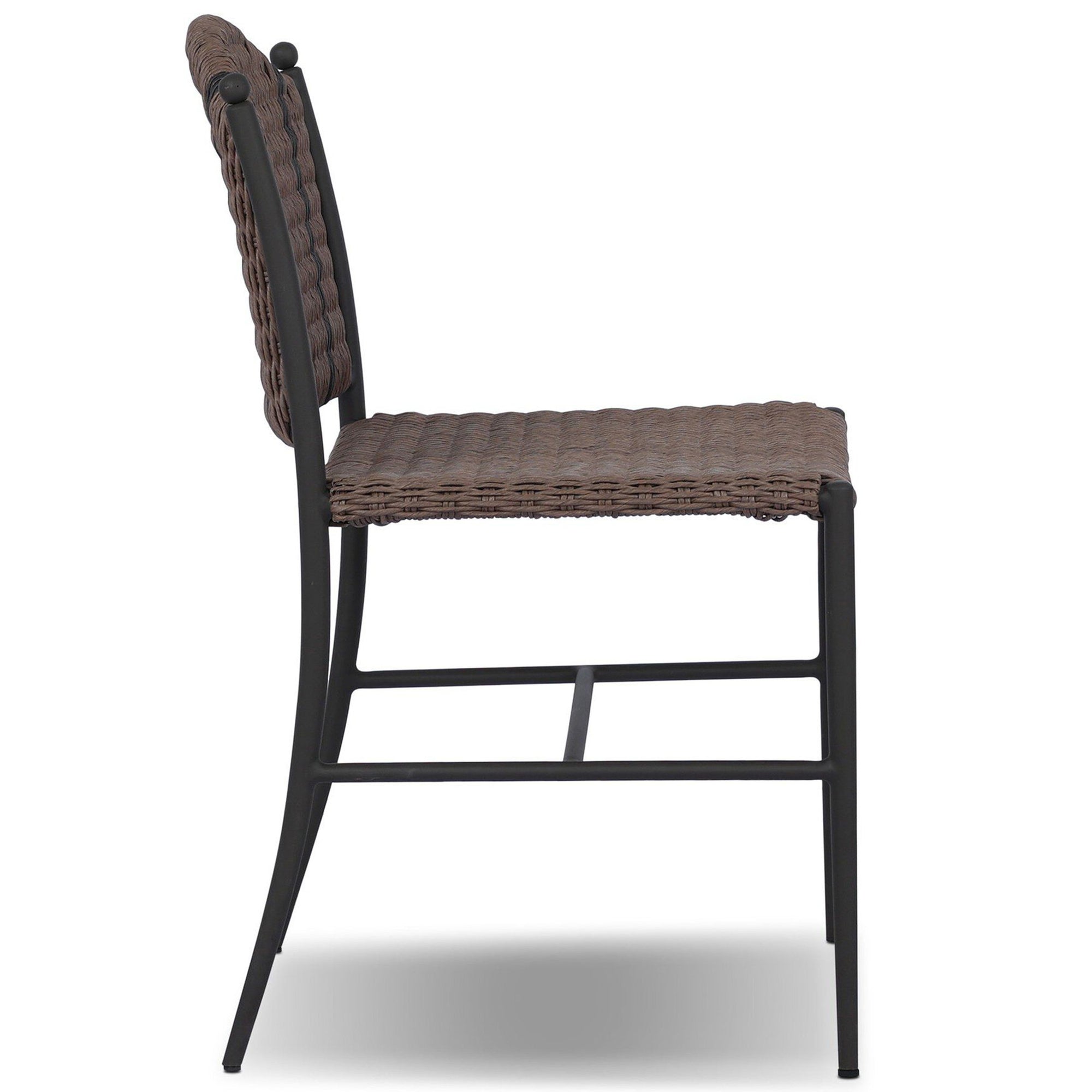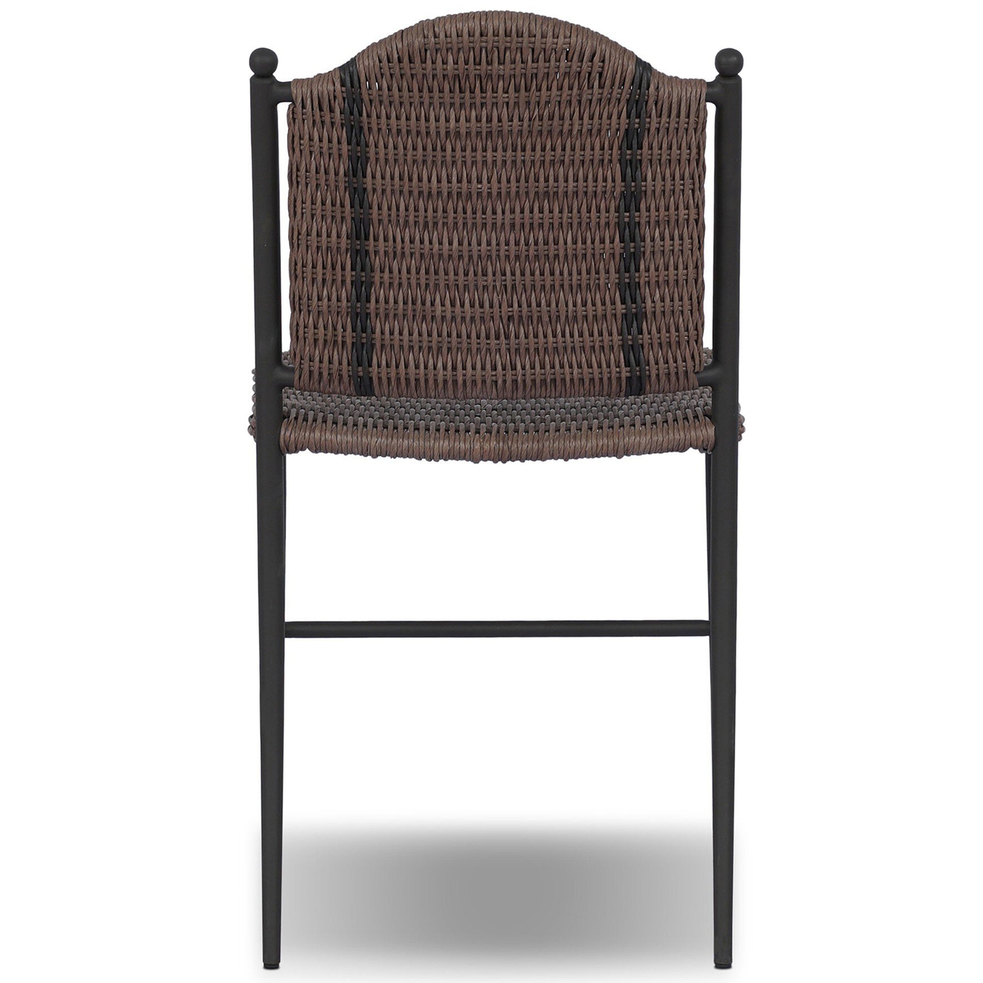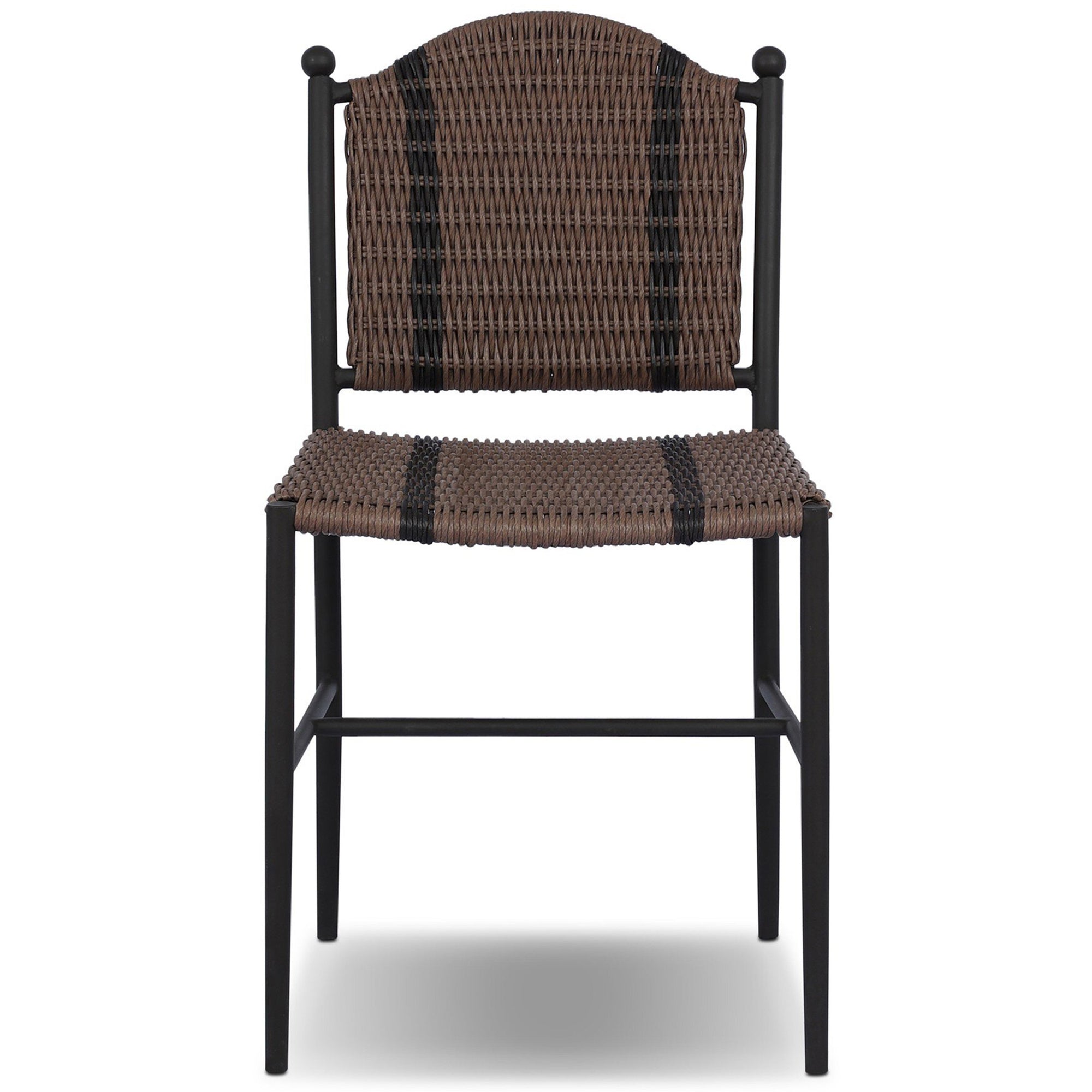 The Abel Outdoor Dining Chair features a bistro-style design that merges a timeless profile with unique stripe detailing woven into the back. Finial accents complete the dark frame for a sophisticated look. Designed for outdoor use, it is recommended to cover or store indoors during inclement weather and when not in use.