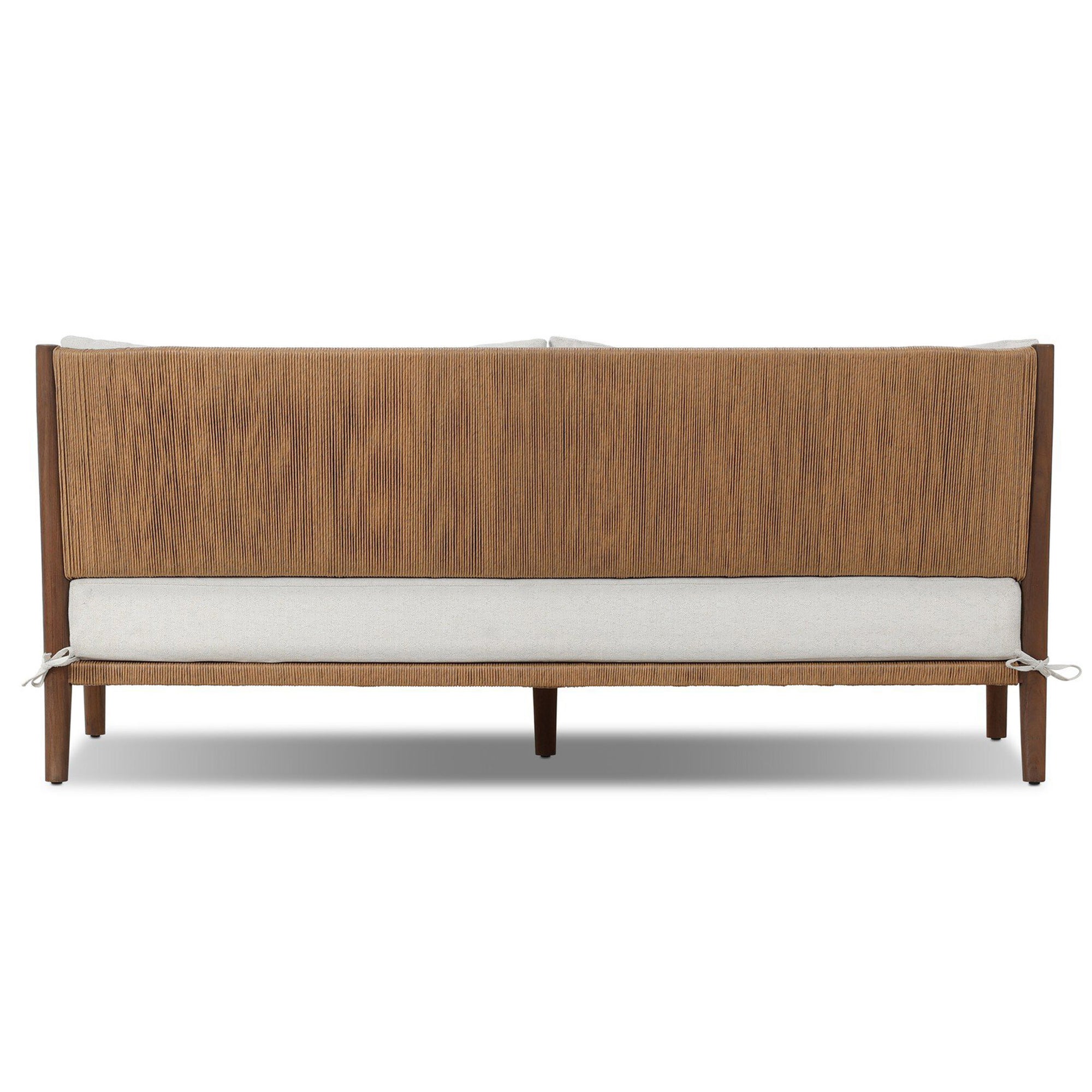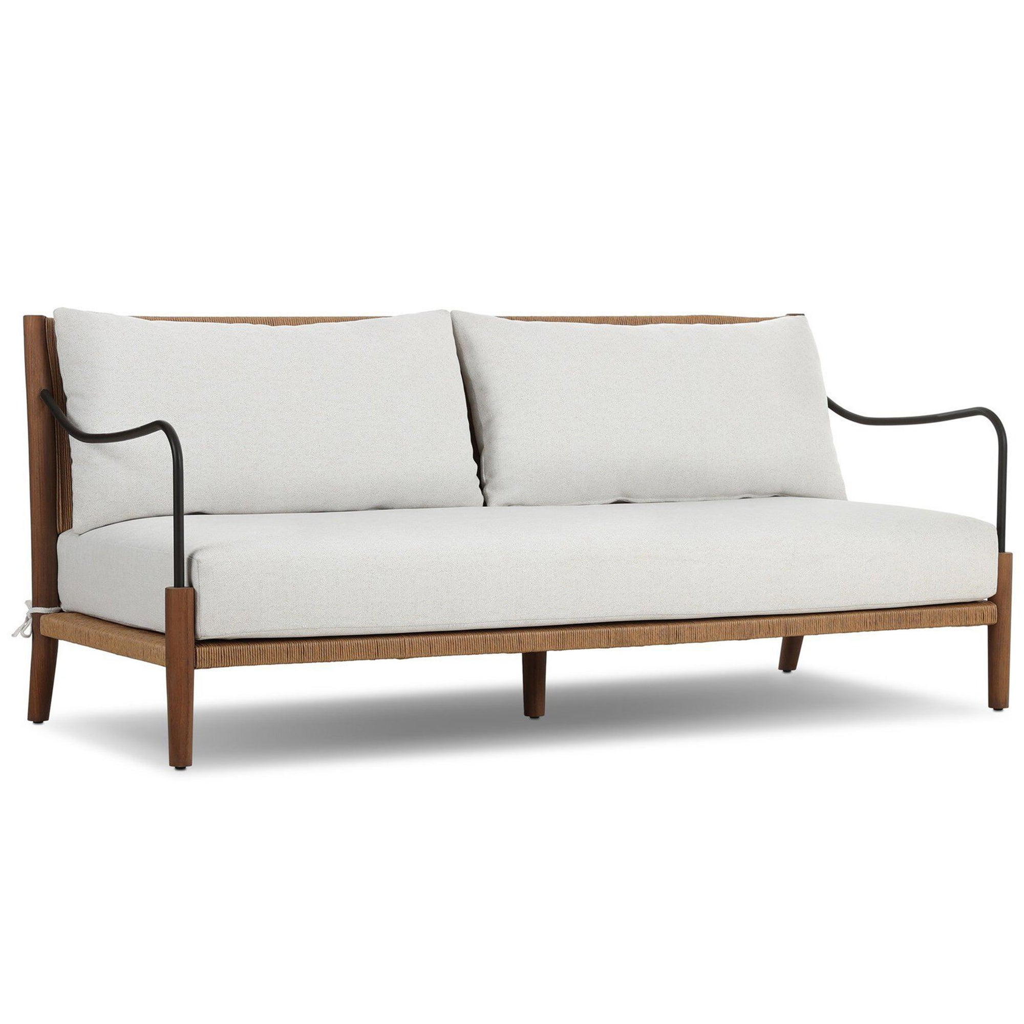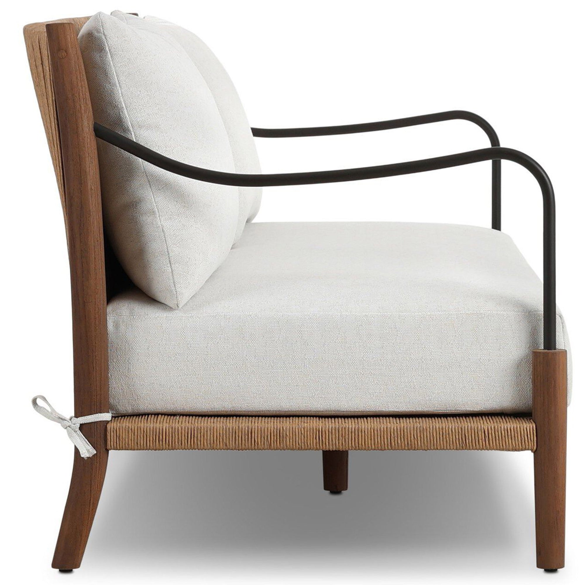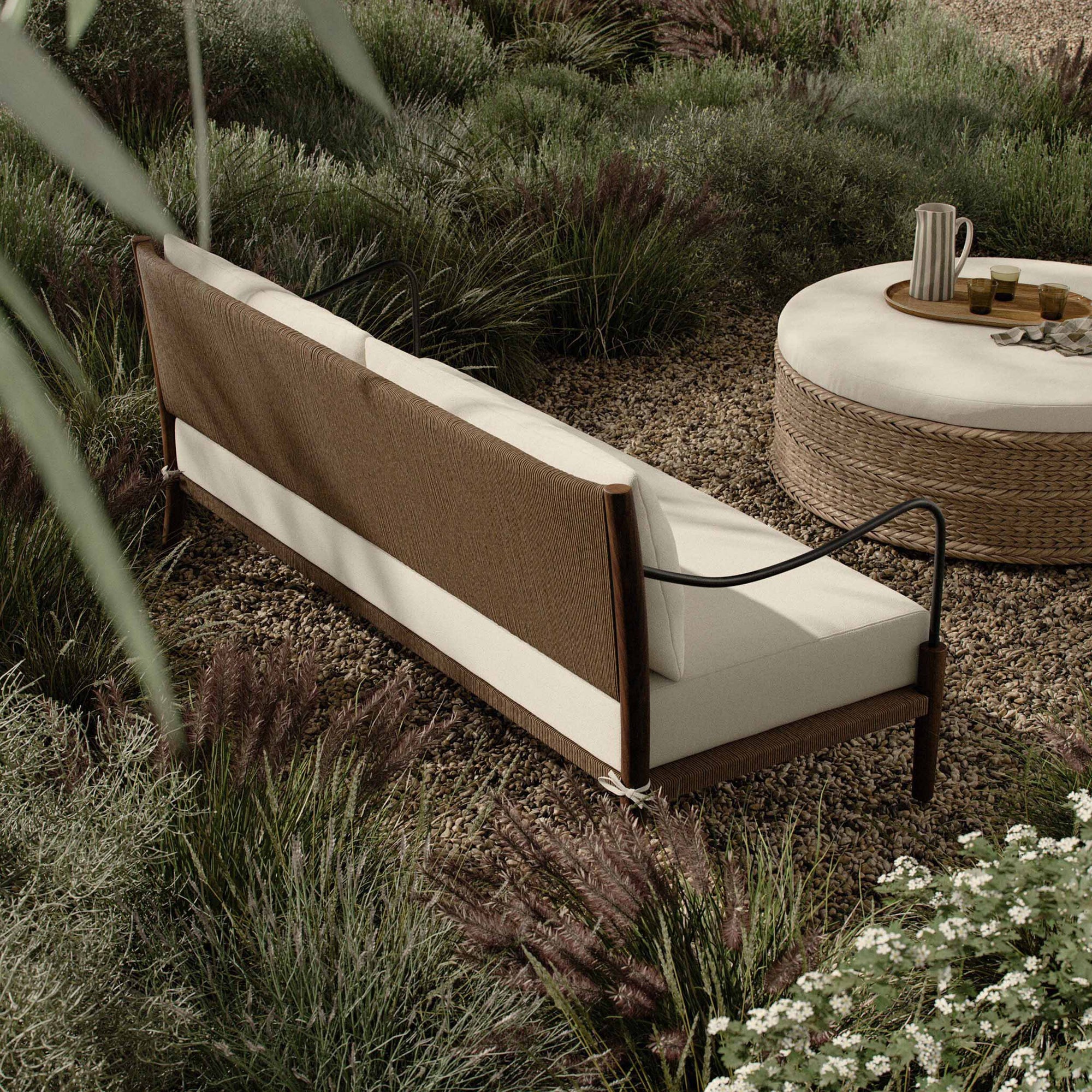 The Andover Outdoor Sofa is characterized by its blend of mixed materials. Subtly wavy metal arms flow into the FSC®-certified teak frame, contrasted by a wrapped twine detailing on the seatback. Sustainably made with zero waste, the luxurious Italian upholstery offers a new spin on indoor/outdoor seating, providing soft, durable fabric that is highly resistant to sun, stains, mold, and abrasion. Cover or store inside during inclement weather and when not in use. This piece is a design collaboration by Amber Lewis and Four Hands.