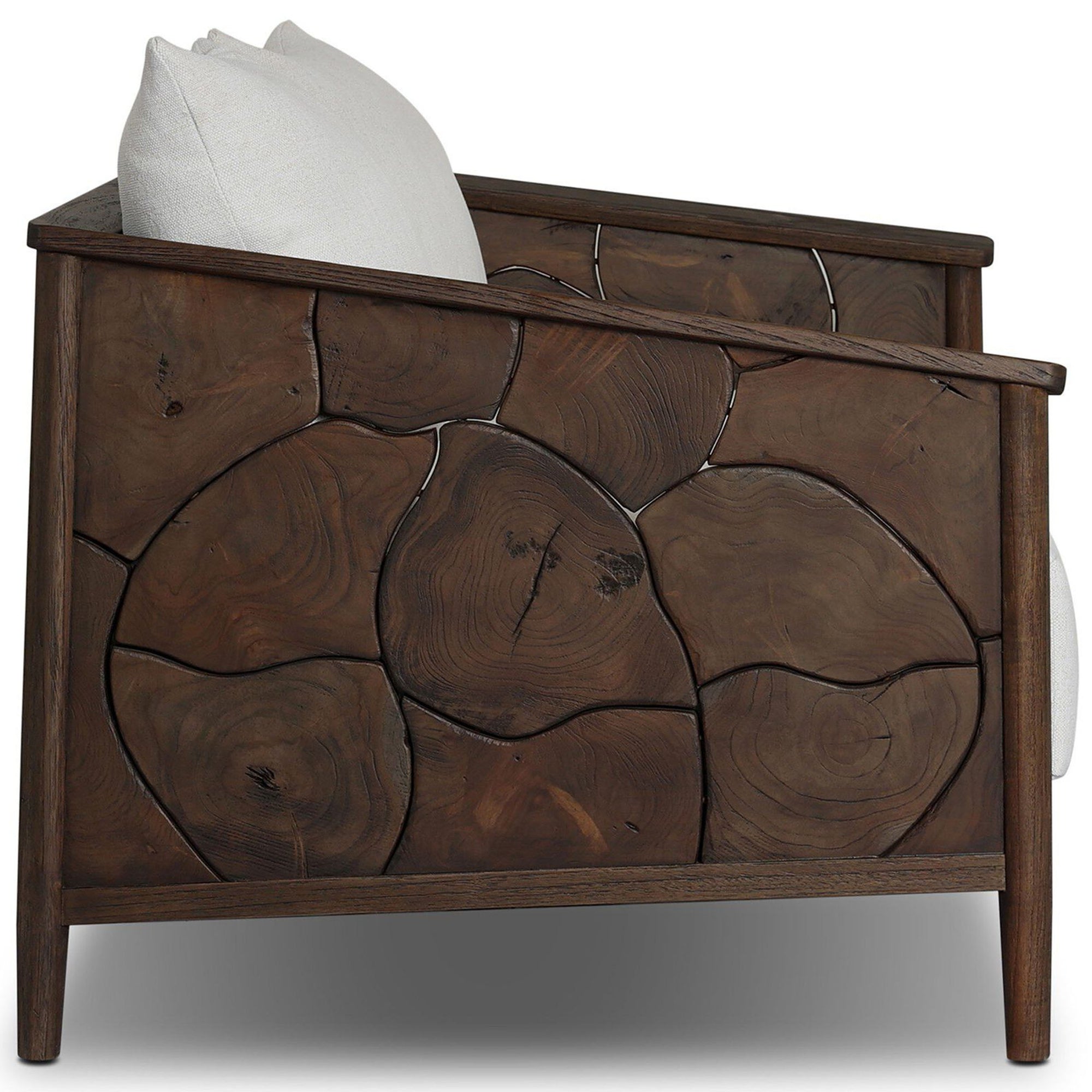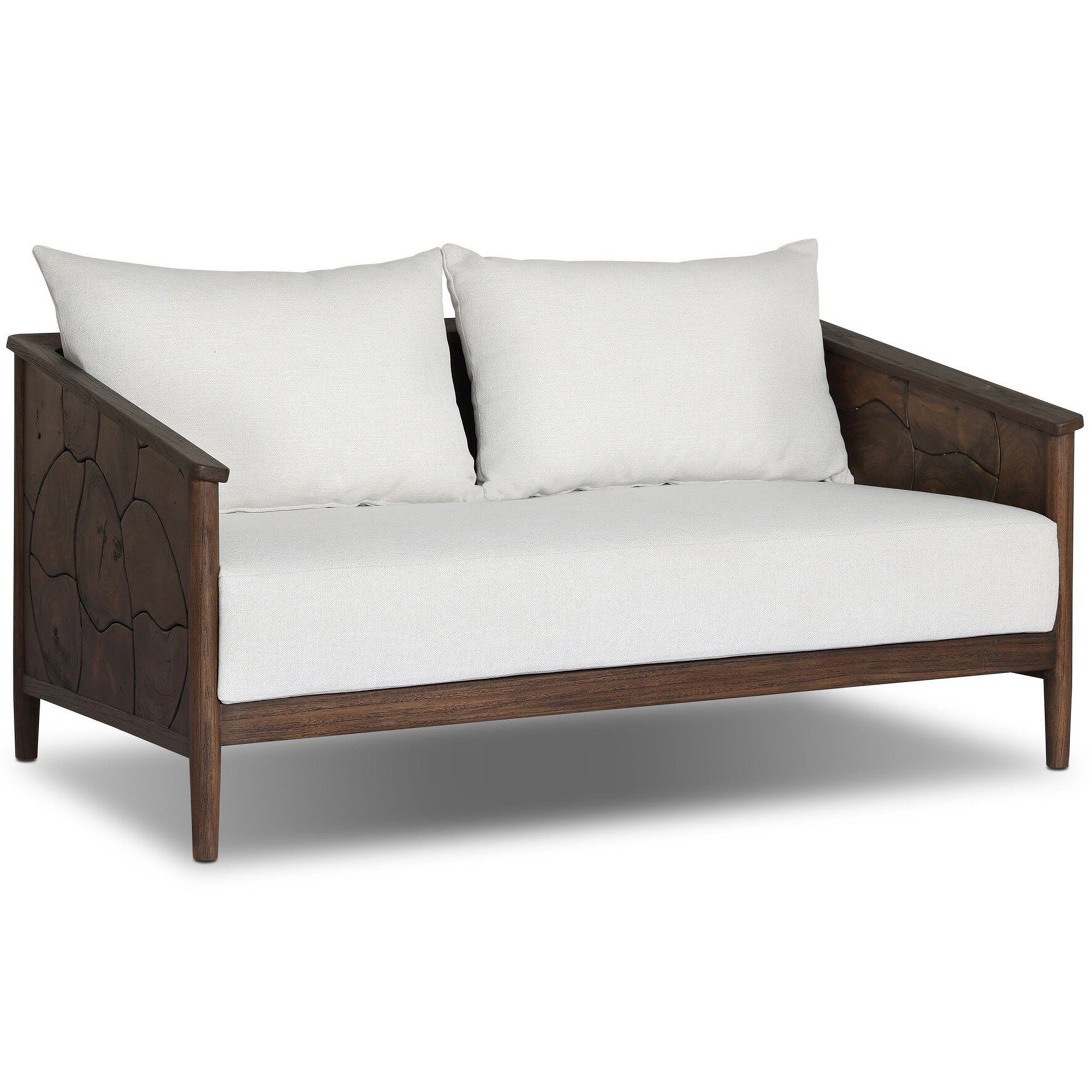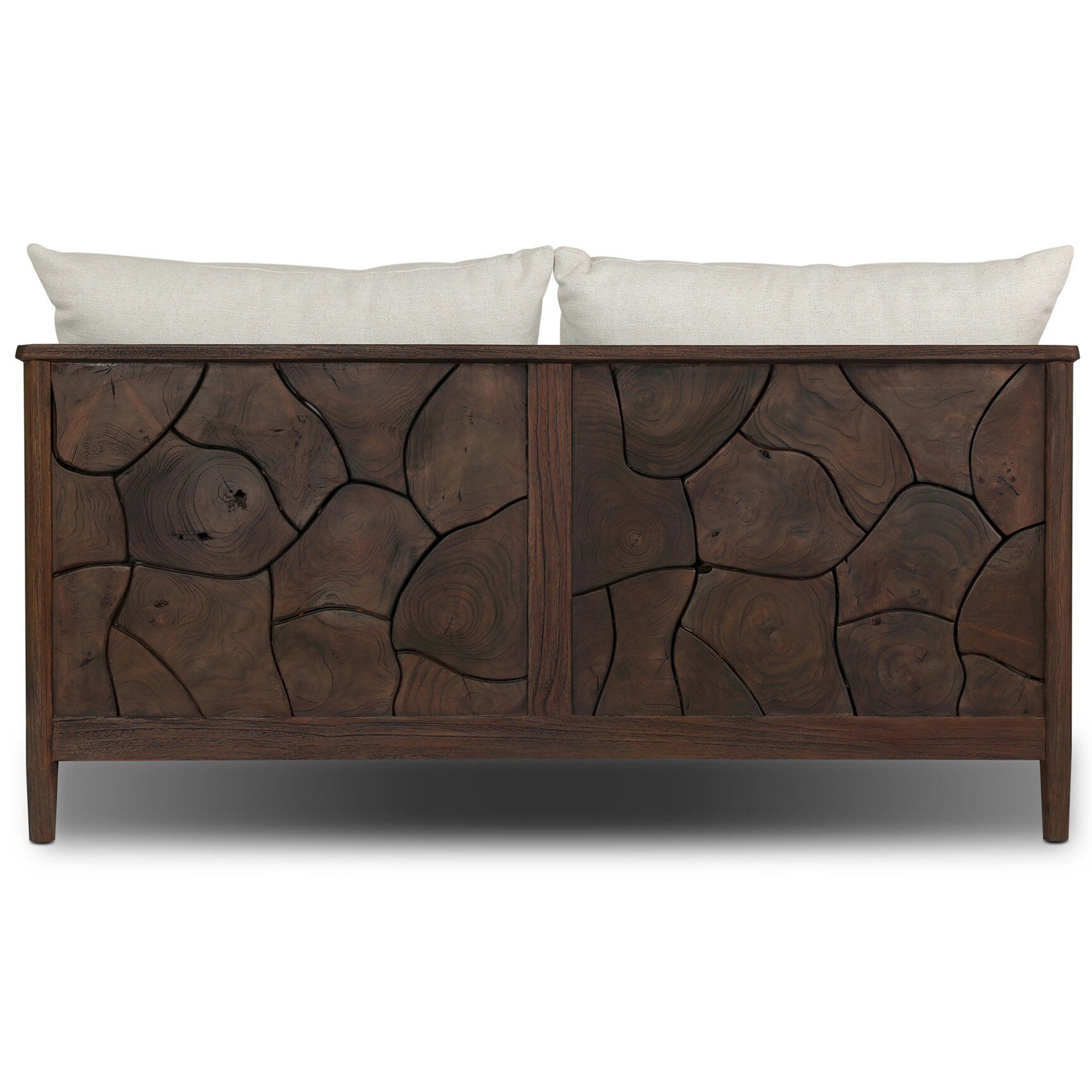 The Ridge 58" Outdoor Sofa features inset panels of solid teak root laminated to create a mosaic look against beautiful natural graining. Sustainably made with zero waste, the luxurious Italian upholstery places a unique spin on outdoor seating with soft, durable fabric resistant to sun, stains, mold, and abrasion. Designed for outdoor use, it is recommended to cover or store indoors during inclement weather and when not in use.