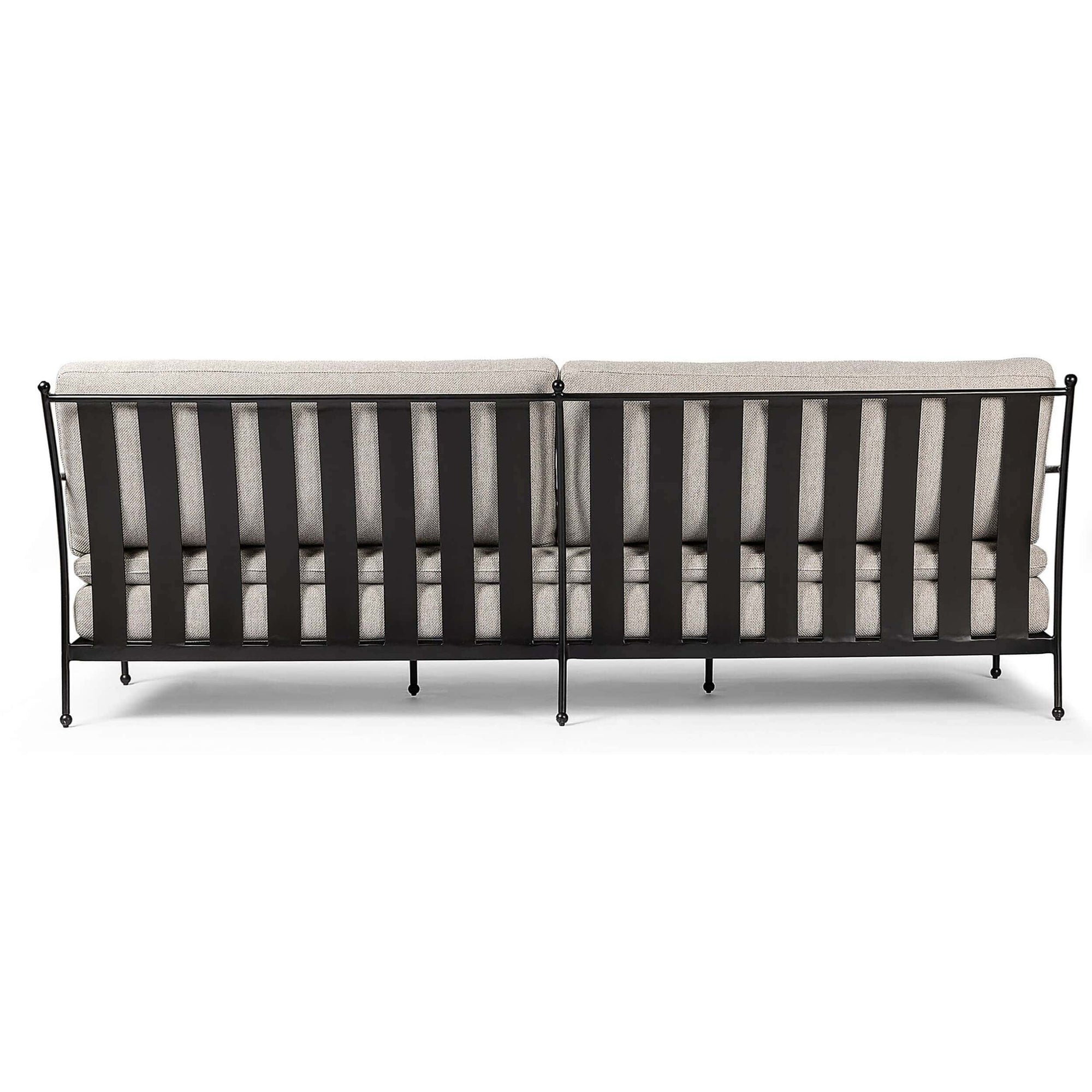 The Tally Outdoor Sofa features movement-driven shaping with double seat cushioning for ultimate comfort. Its modern, French Deco-inspired design combines traditional vertical slats on the back with small finial details on the feet, offering a fresh take on classic outdoor style. Perfect for adding elegance and relaxation to your patio.