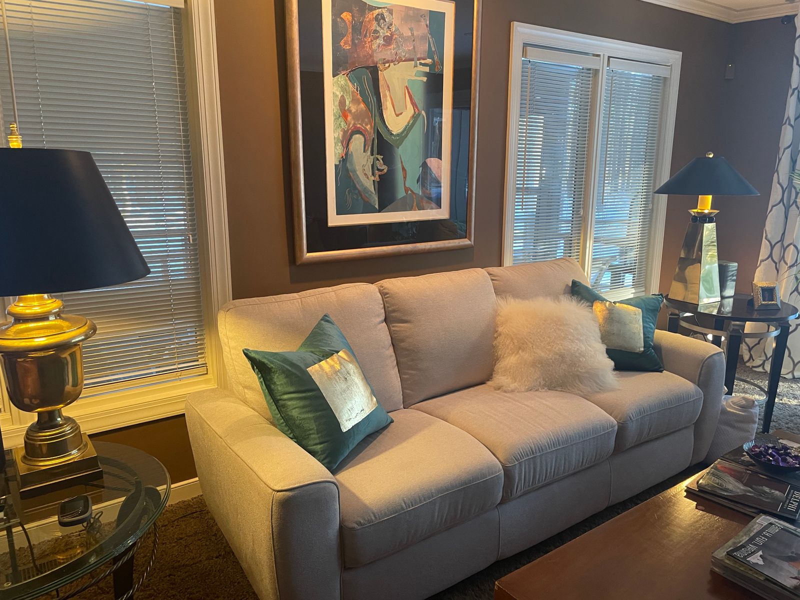 A teal velvet pillow with distressed gold leaf in the center.
