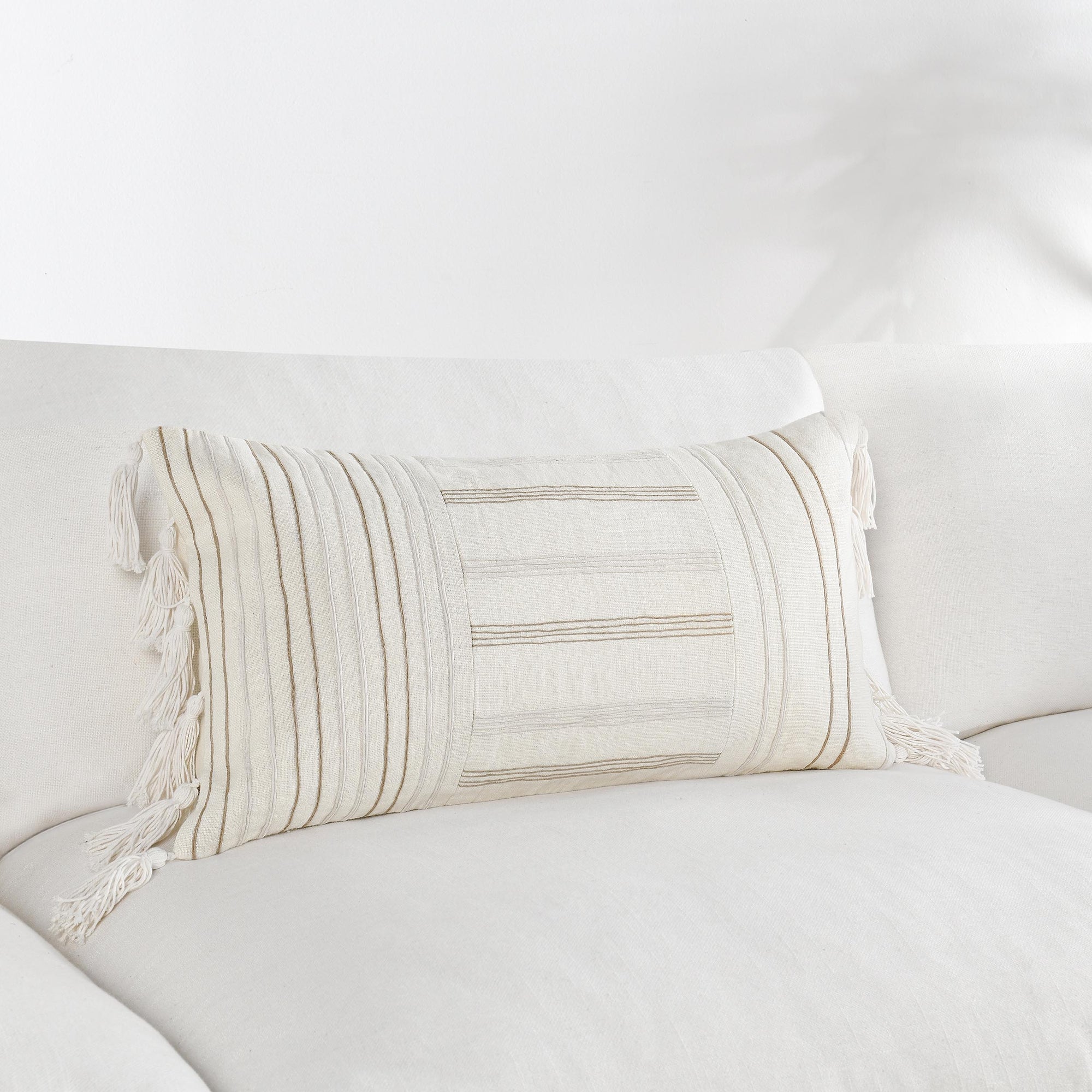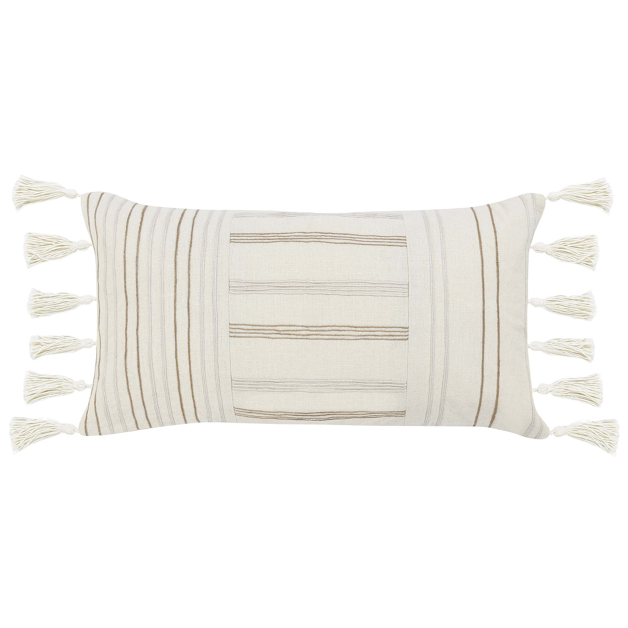 The Apana Lumbar Pillow, Ivory/Natural, infuses your space with fresh style and understated boho charm. Made from classic linen and detailed with jute embellishments, its striped, airy design adds relaxed texture and a handcrafted touch to beds, benches, or accent chairs.
