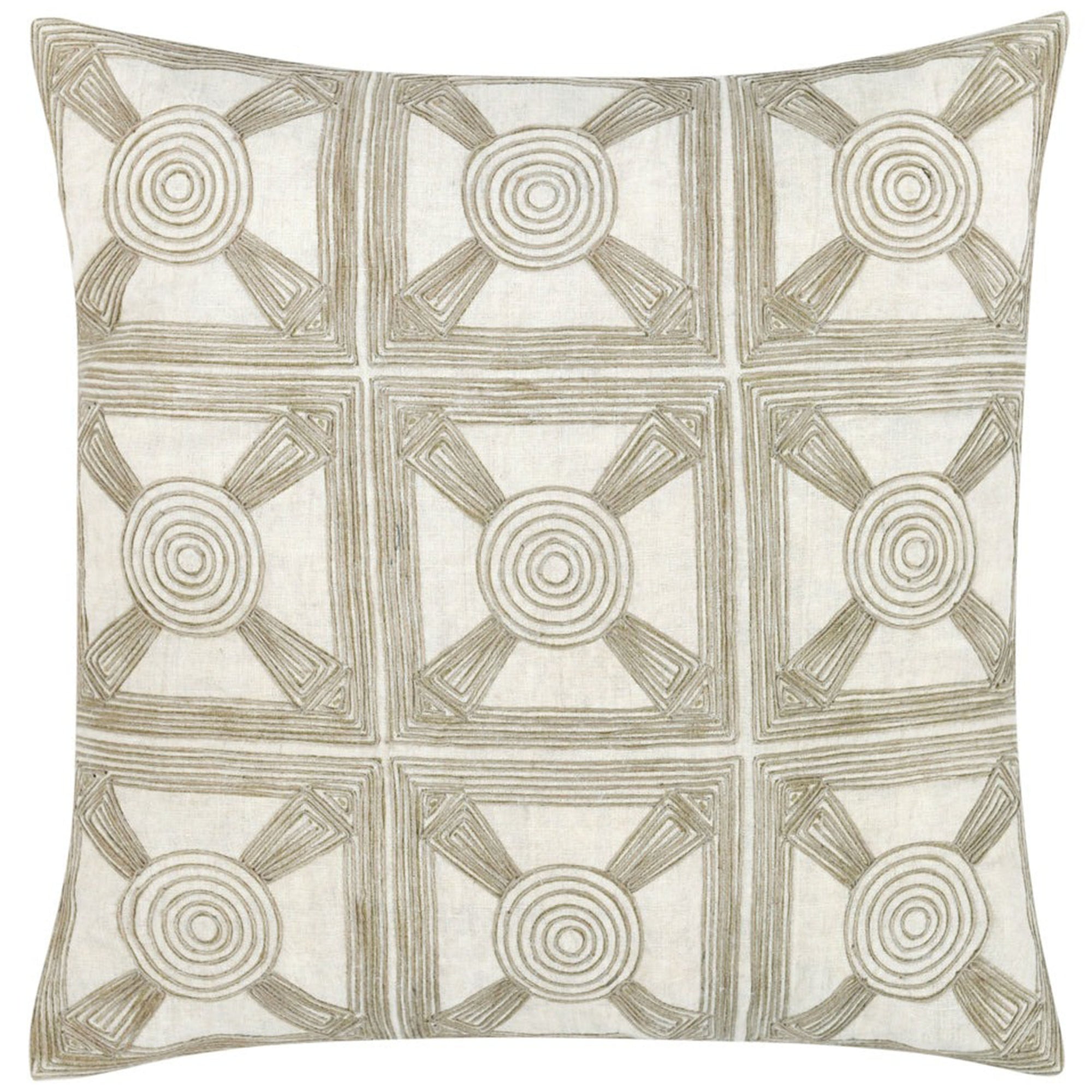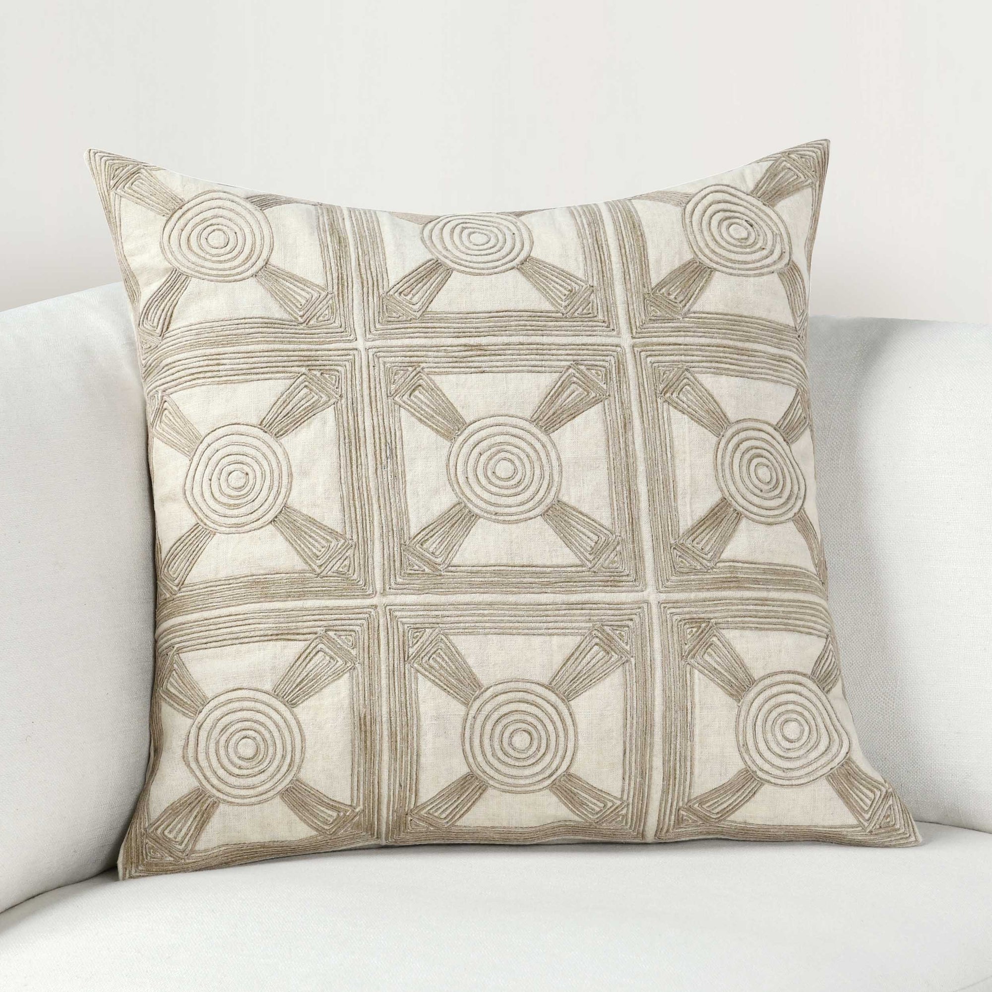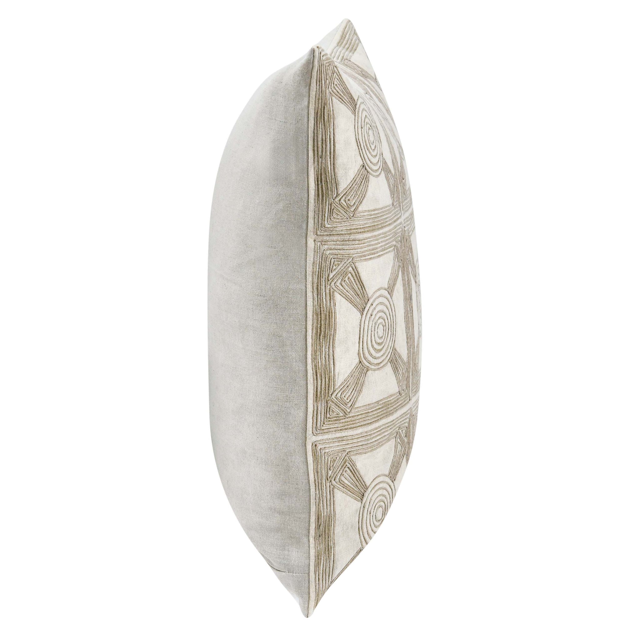The Baia Pillow features hand-applied jute embroidery that creates a sophisticated, tile-like pattern, adding timeless elegance to any space. Stonewashed Belgian flax linen provides subtle color variations and classic texture, while a plump feather blend insert ensures premium comfort for sofas, beds, or chairs.