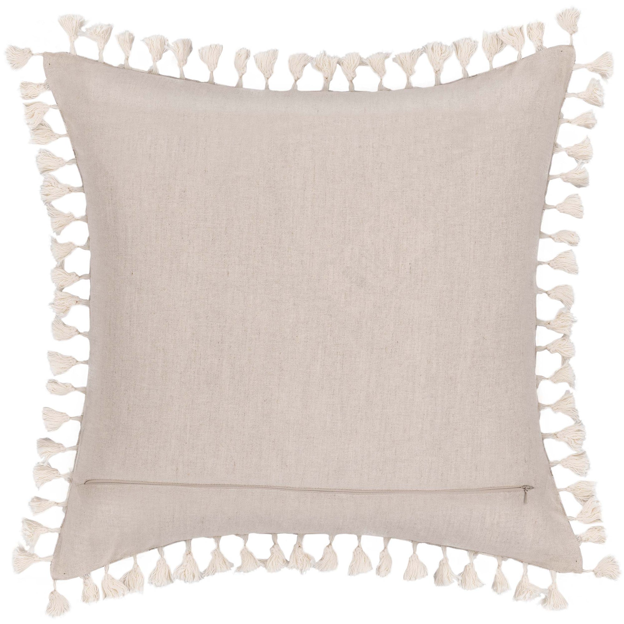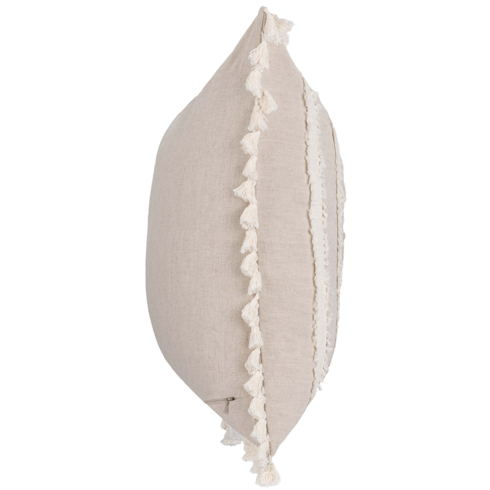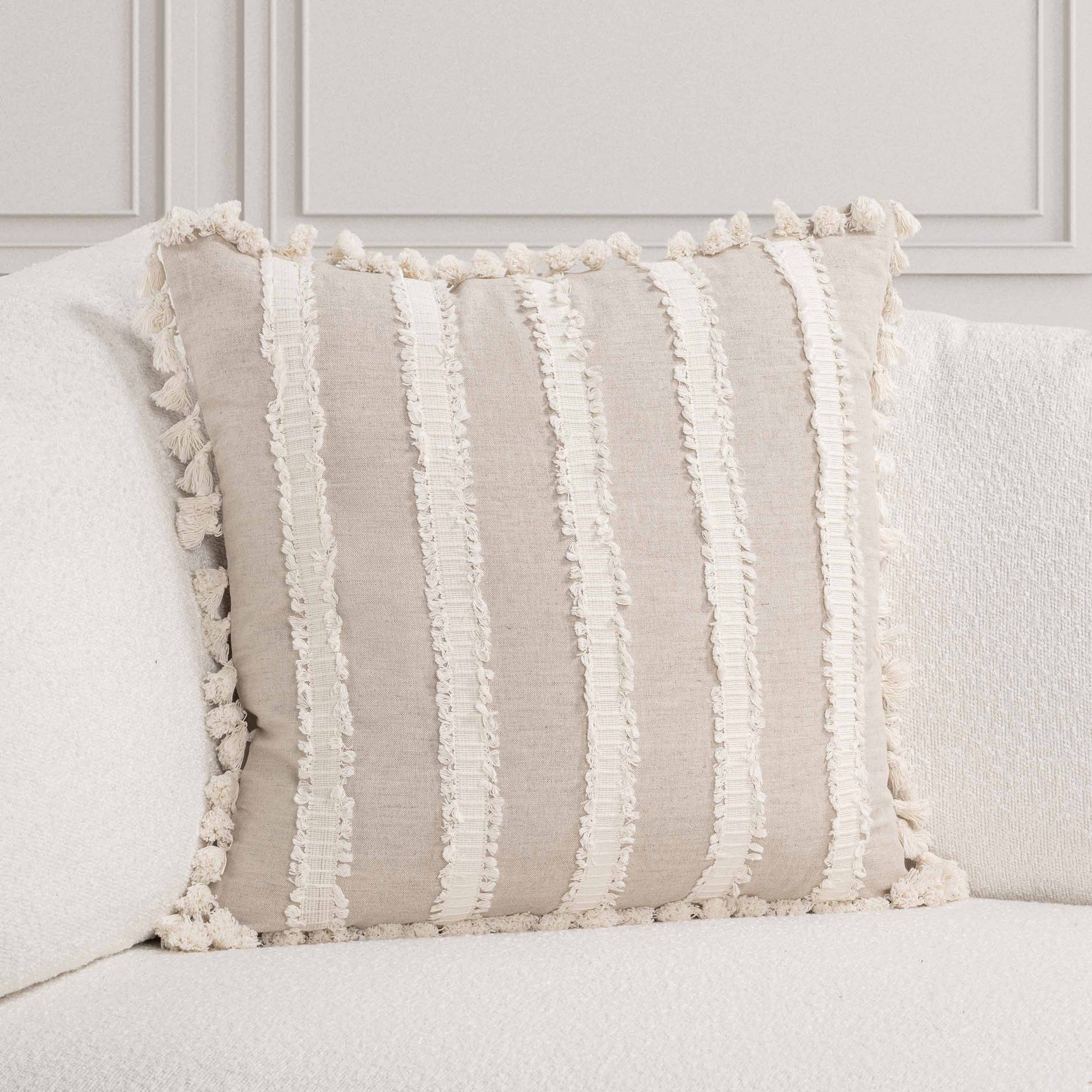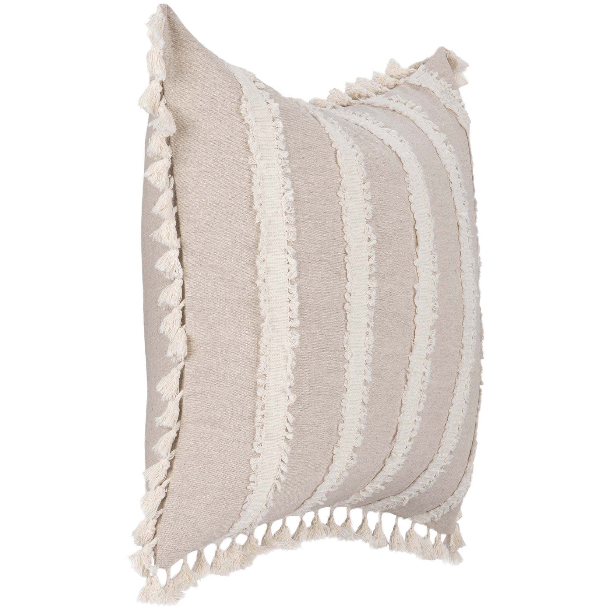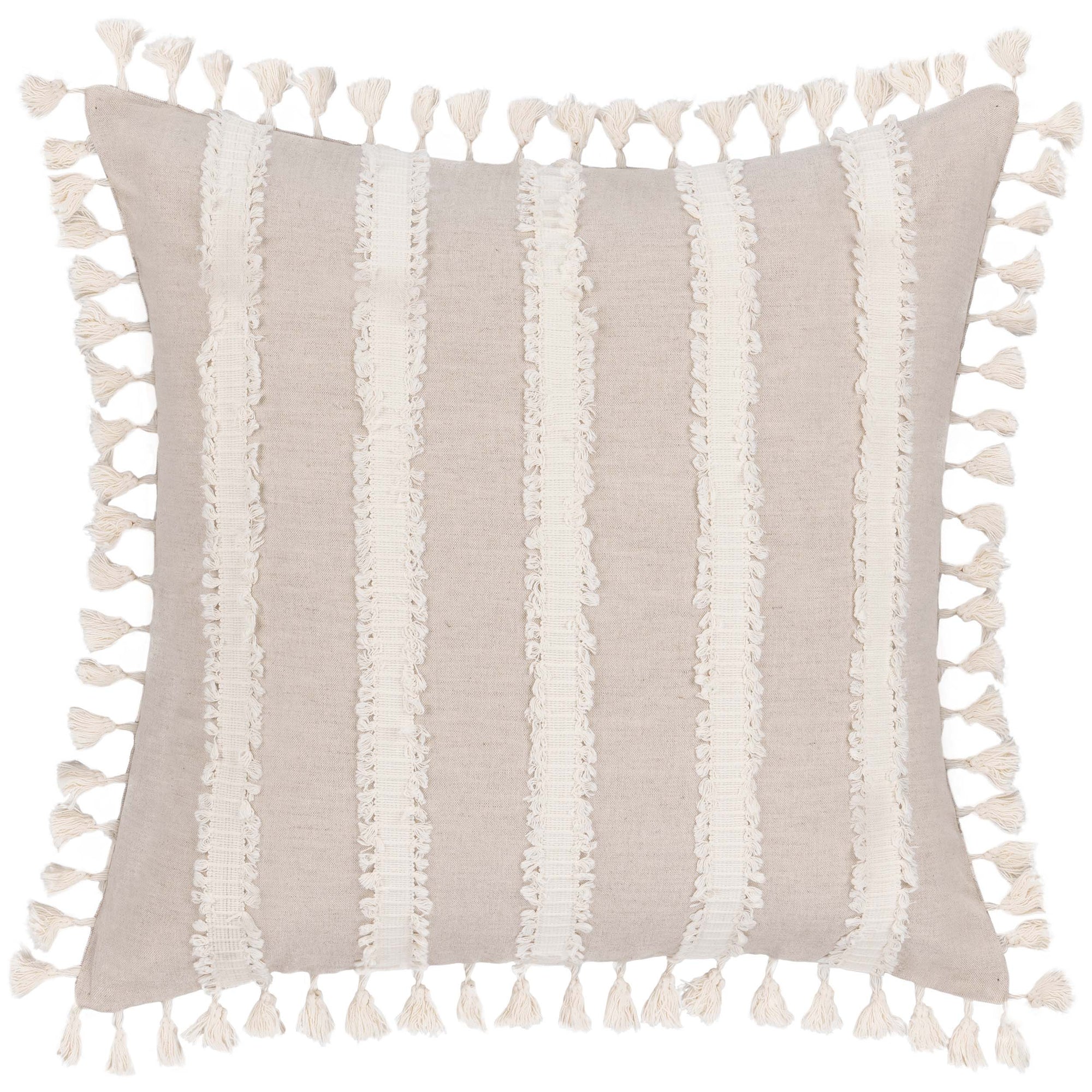 The Edisto Pillow features a versatile stripe design in a neutral palette, accented with hand-applied trim and tassels for casual warmth. A seamless back zipper and feather-and-down fill offer both style and comfort.