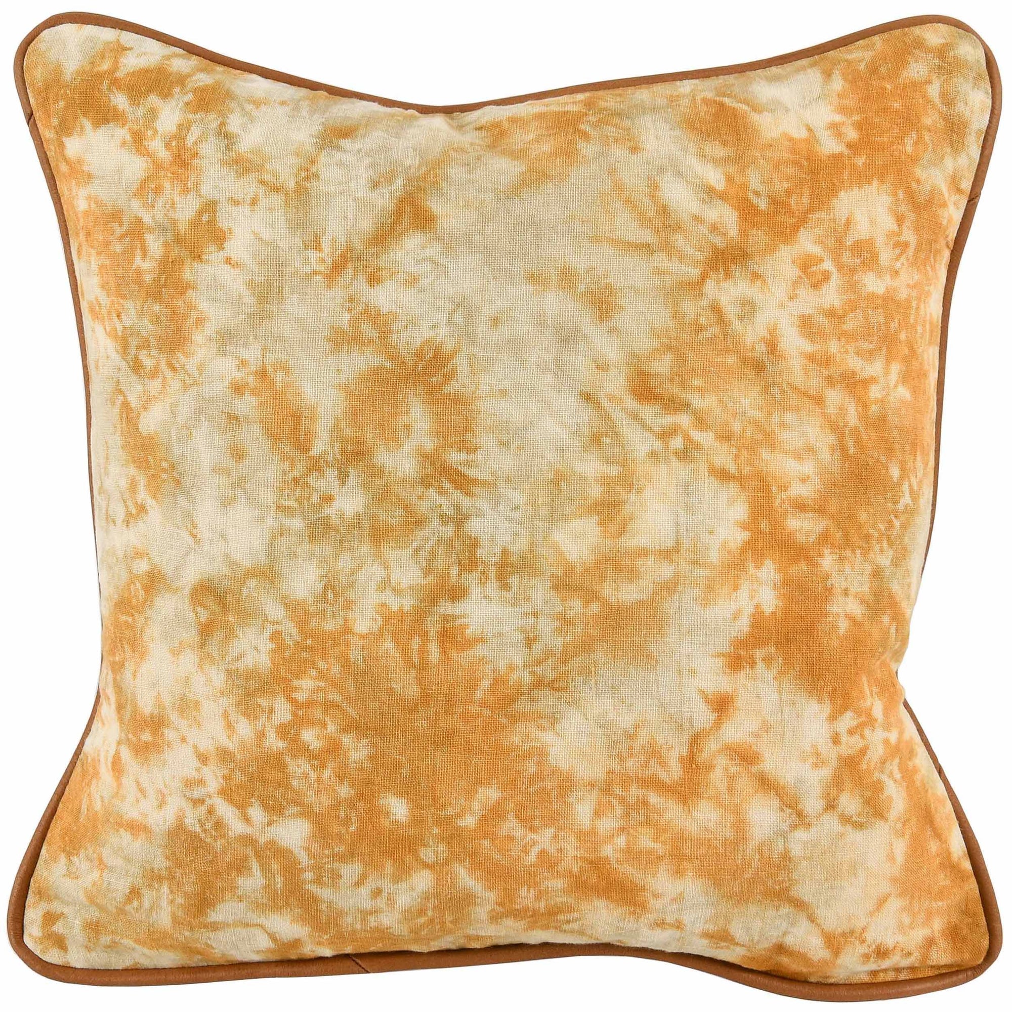 The Jasper Pillow features an abstract tie-dye design that delivers a bold wave of color. Leather piping and a solid back frame the design perfectly for any space. A soft feather blend insert offers luxurious support and comfort.