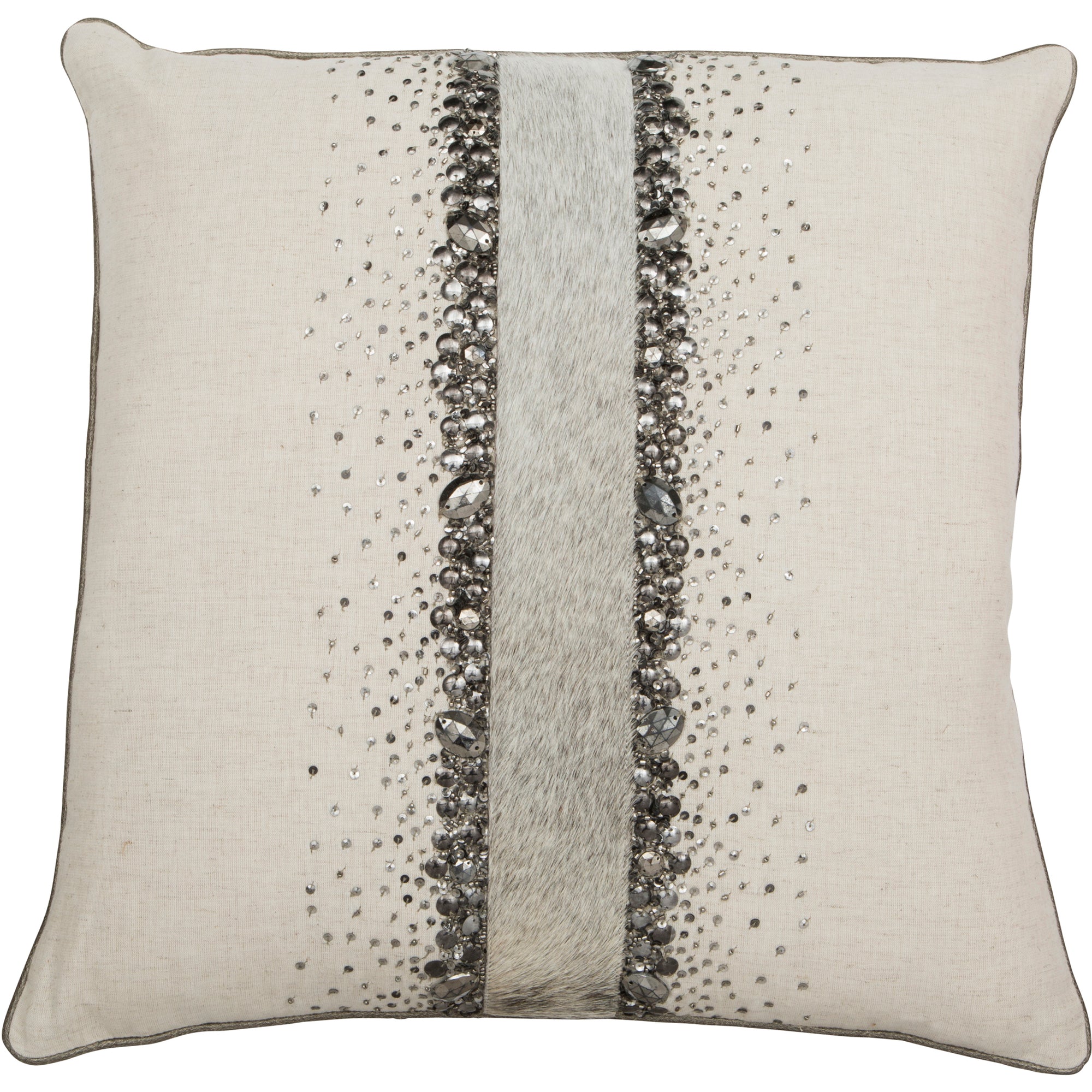 The Karia pillow has a linen base with a cowhide stripe down the middle. Its finished off by beads on either side.