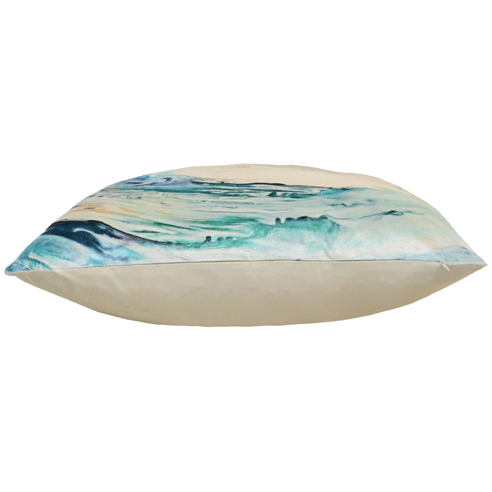 The Lapis Wave Pillow features an abstract wave print in vibrant hues on a plush velvet-like surface. A colorful statement piece that adds depth, texture, and a tranquil energy to any interior.