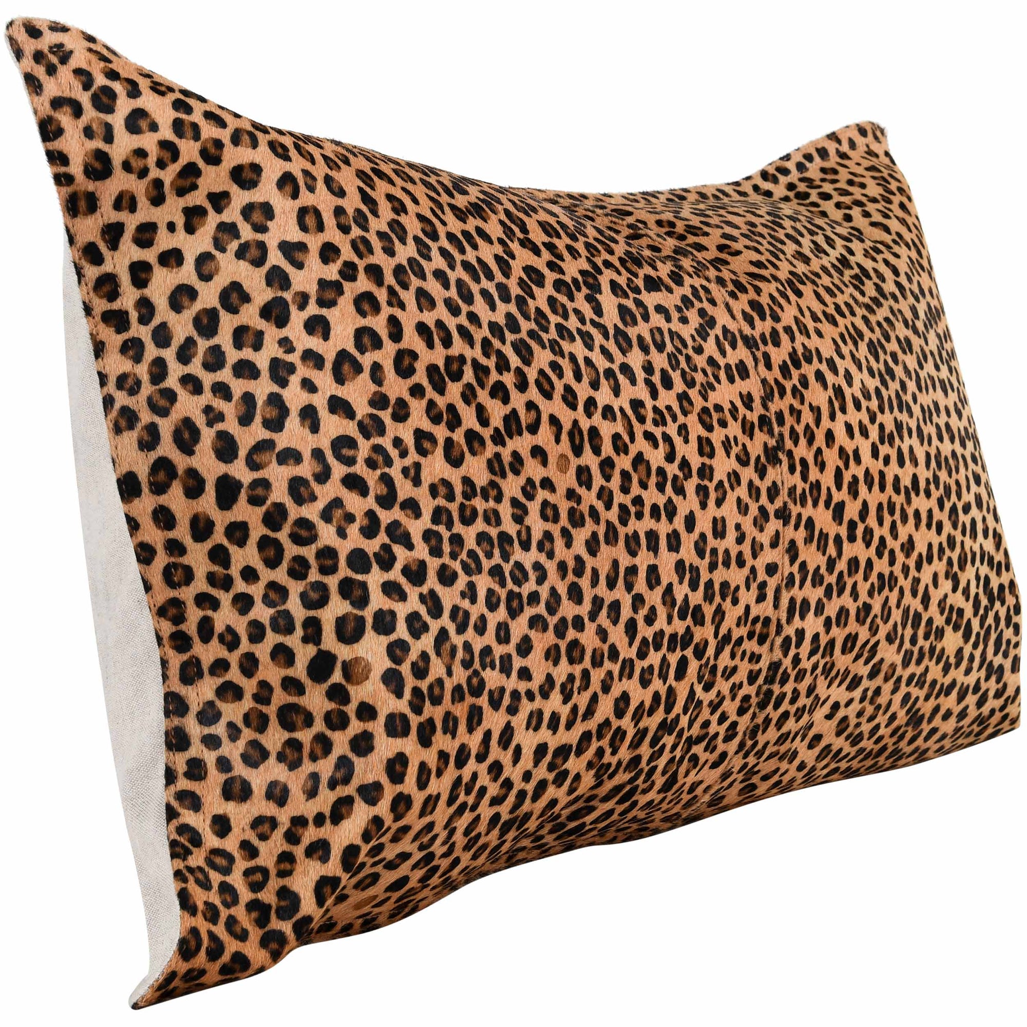 The Leopard Hide Lumbar Pillow, Camel/Black features a bold leopard print crafted from genuine cowhide for an exotic, textured accent. The authentic hair-on-hide front adds visual impact while the cotton-linen blend back offers softness and balance. Its lumbar shape is perfect for layering in both traditional and modern settings.