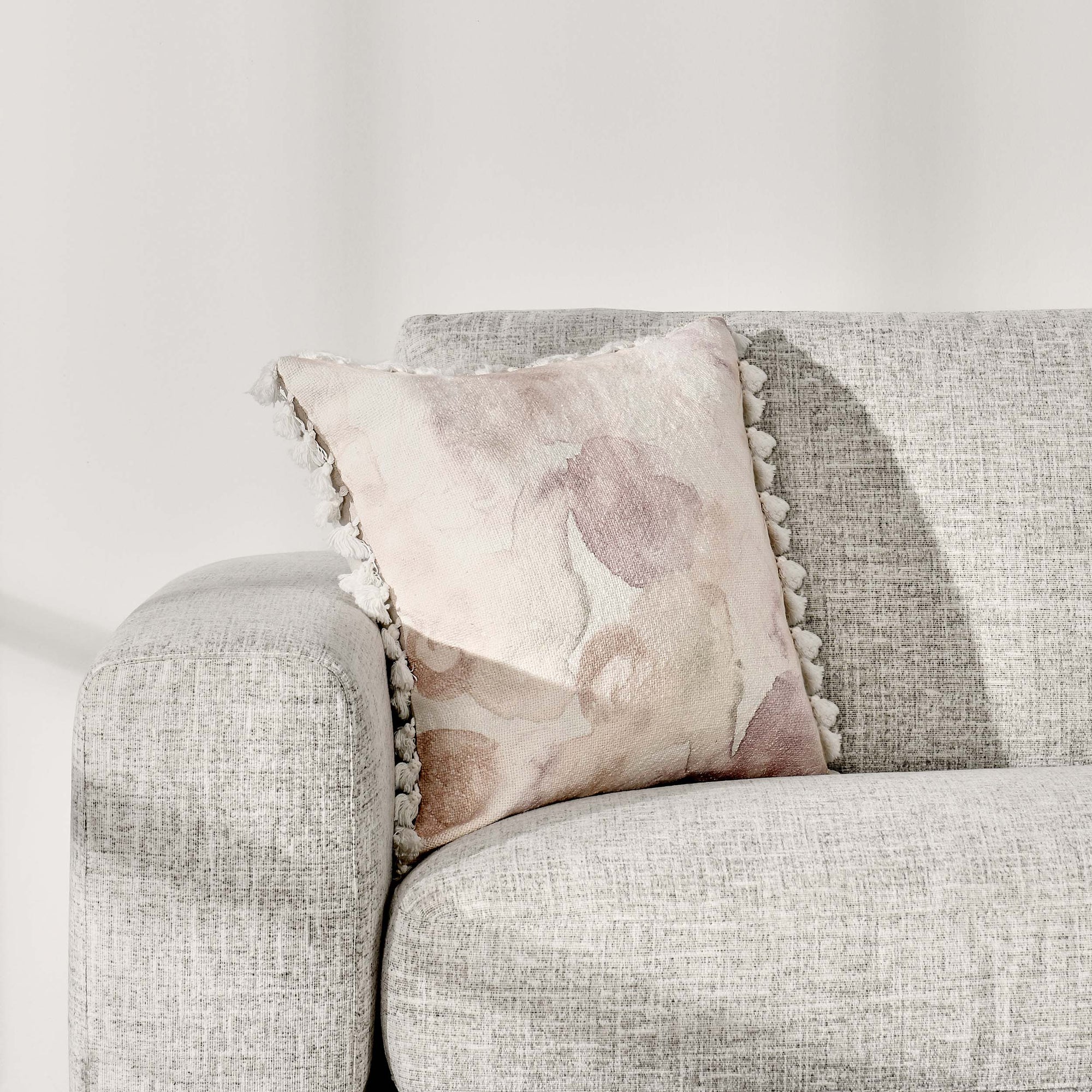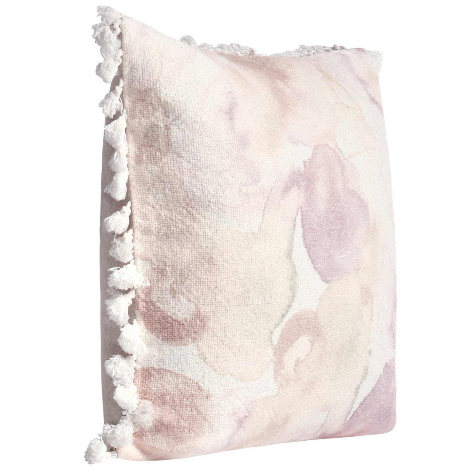 The Lily Peach Pillow, Pink Multi, is framed with tiny tassels and features a digitally printed watercolor design in soft, rosy tones that blend into peach and gray. Its charming composition brings a subtle yet evocative flair to traditional spaces, making it a refined accent for beds, sofas, or chairs.