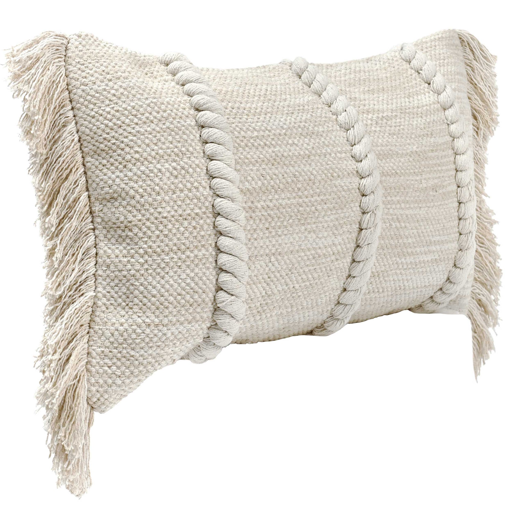 The Lucera Lumbar Pillow features rich texture and an organic tonal palette inspired by a straw harvest bundle. Woven mélange fabric and rope details add visual interest, while fringe edges provide movement and playful, touchable appeal.