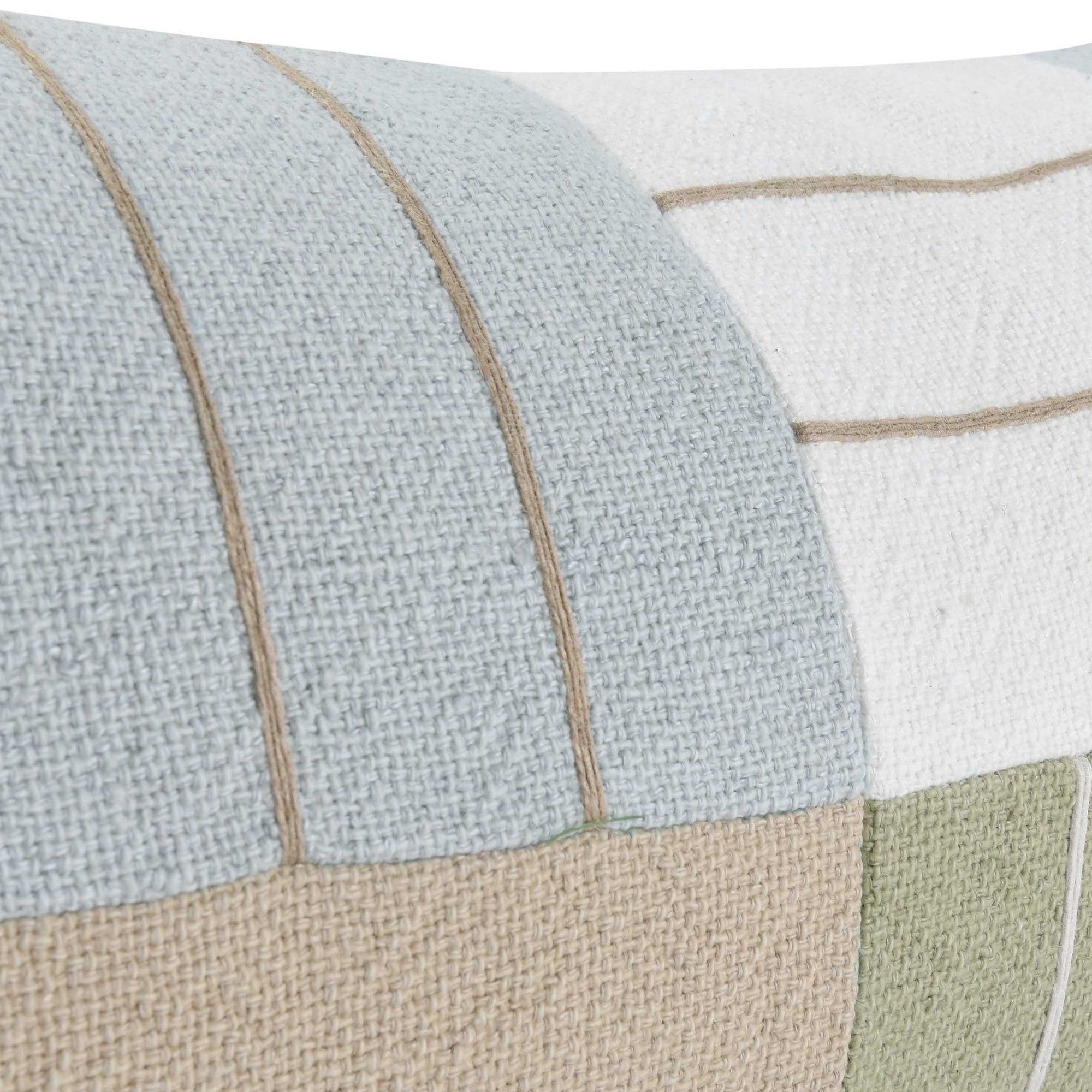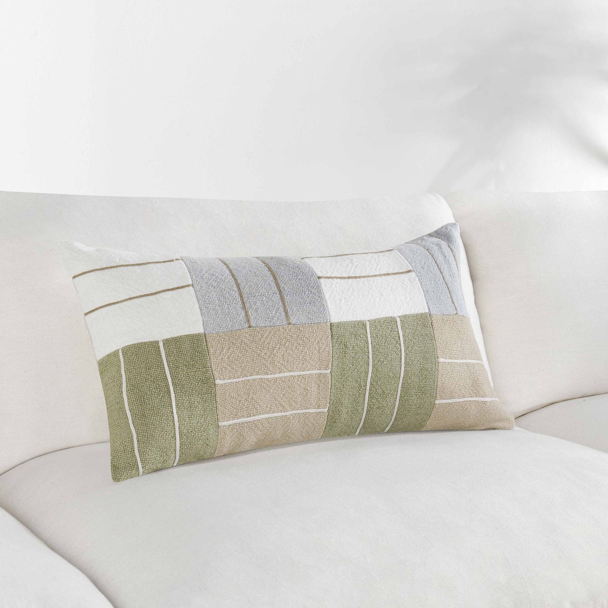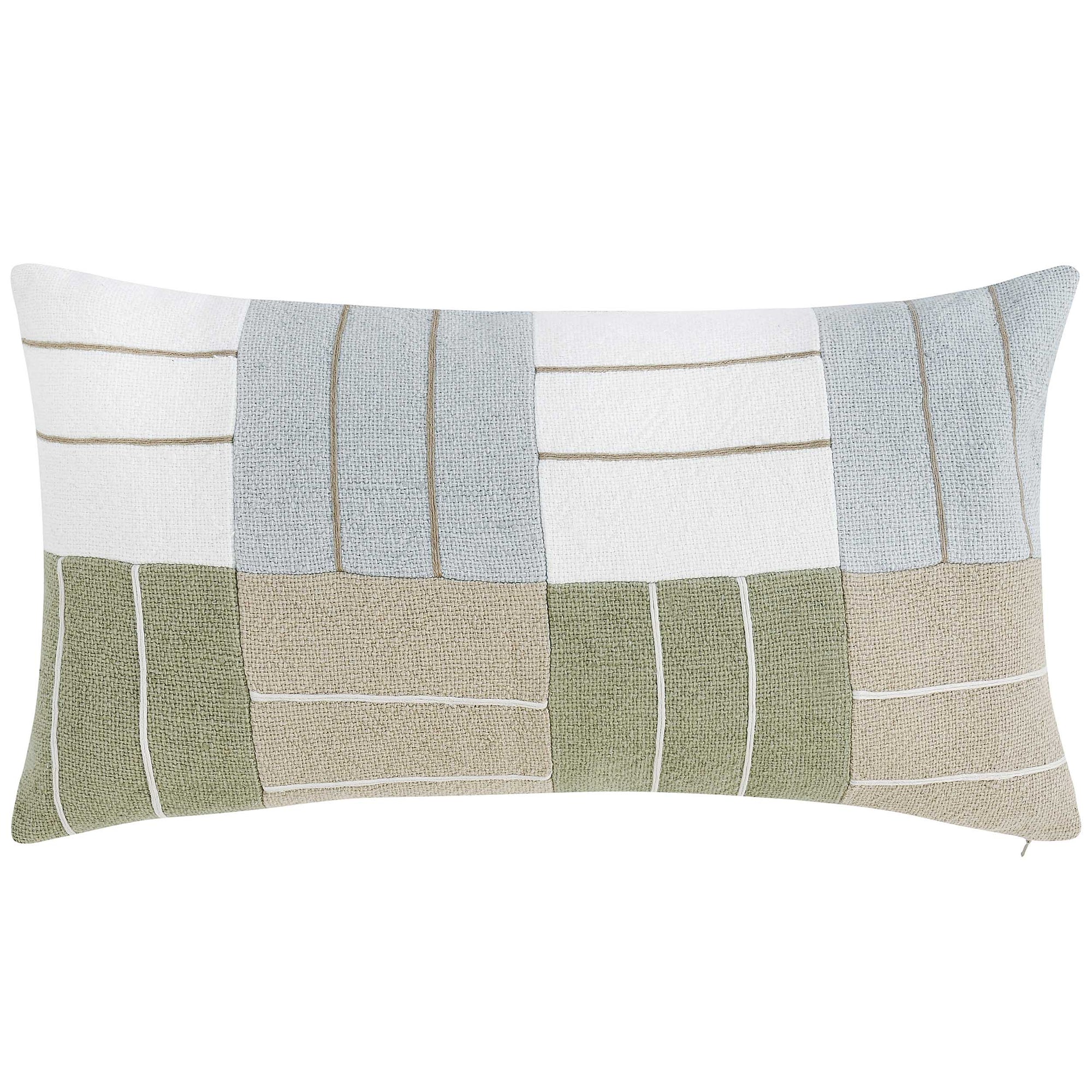 The Niya Lumbar Pillow, Wheat Green Multi, is crafted from a dyed cotton-linen blend and accented with jute embroidery, offering a patchwork design that brings texture, color, and dimension to any setting. Its elongated shape makes it ideal for layering with other pillows or adding comfort and style to a chair or bench.
