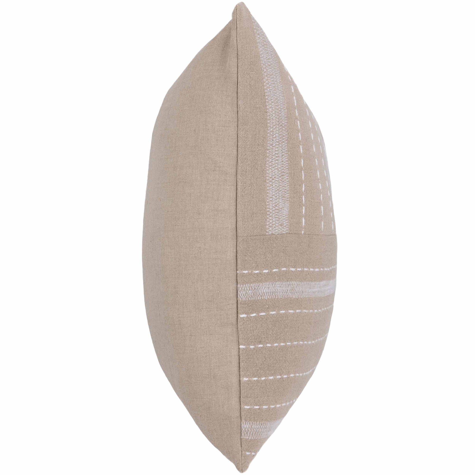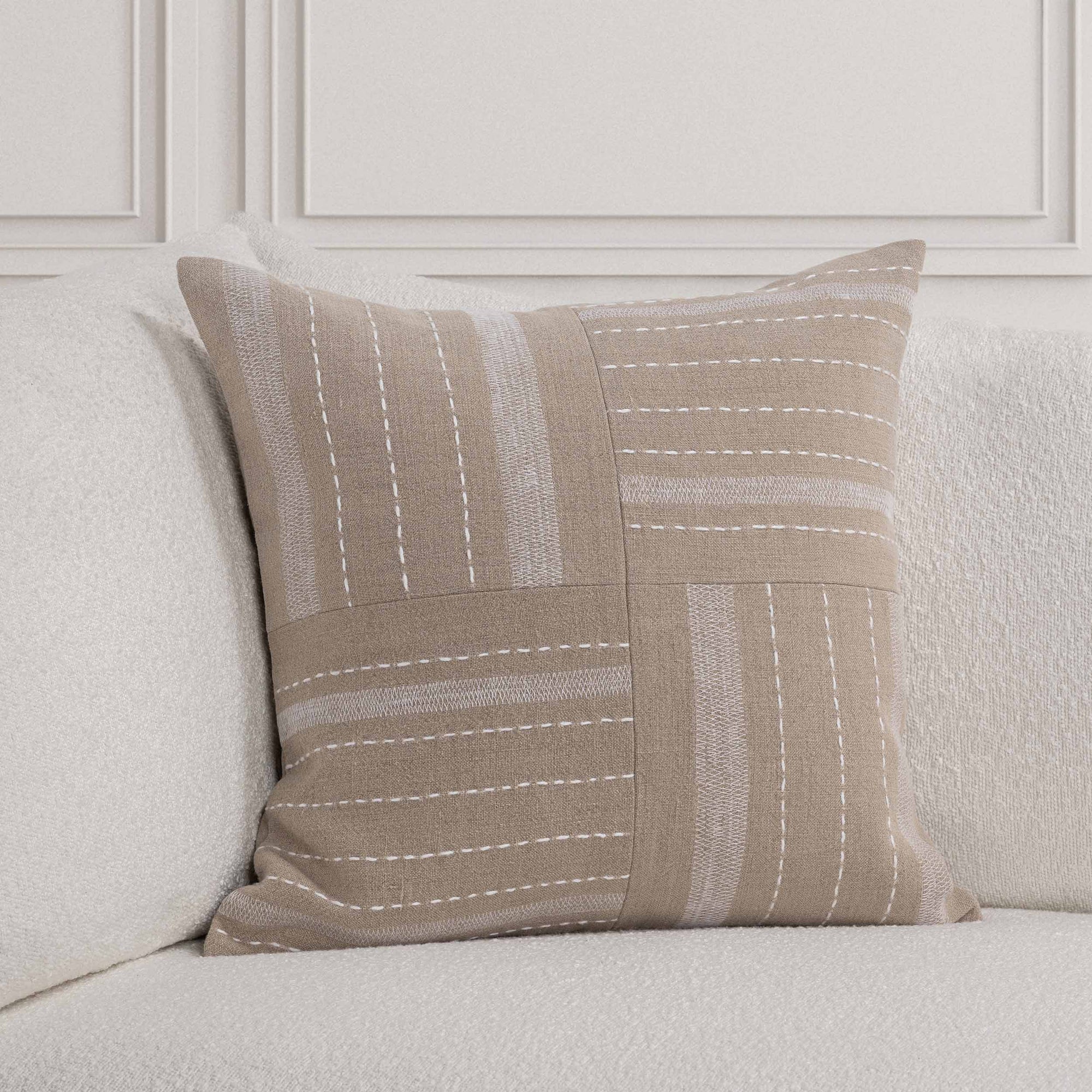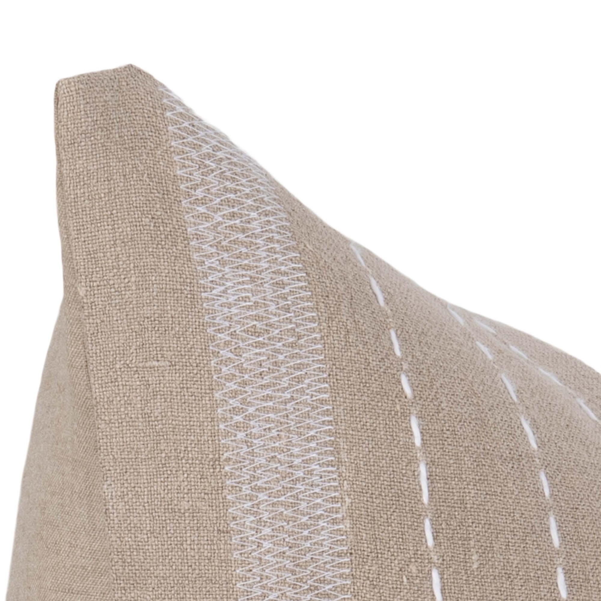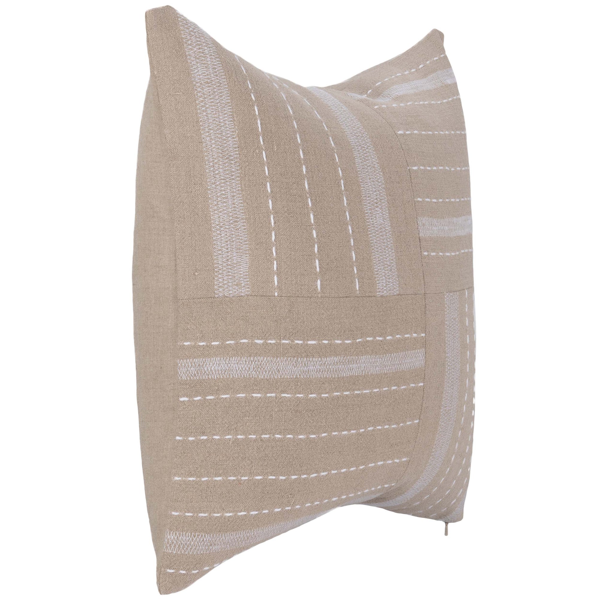 The Origin Pillow, Natural is crafted from dyed and stonewashed Belgian flax linen, offering a casual vintage feel. Hand embroidery adds subtle texture, while the stonewashing process ensures unique variations in color and character for each pillow.