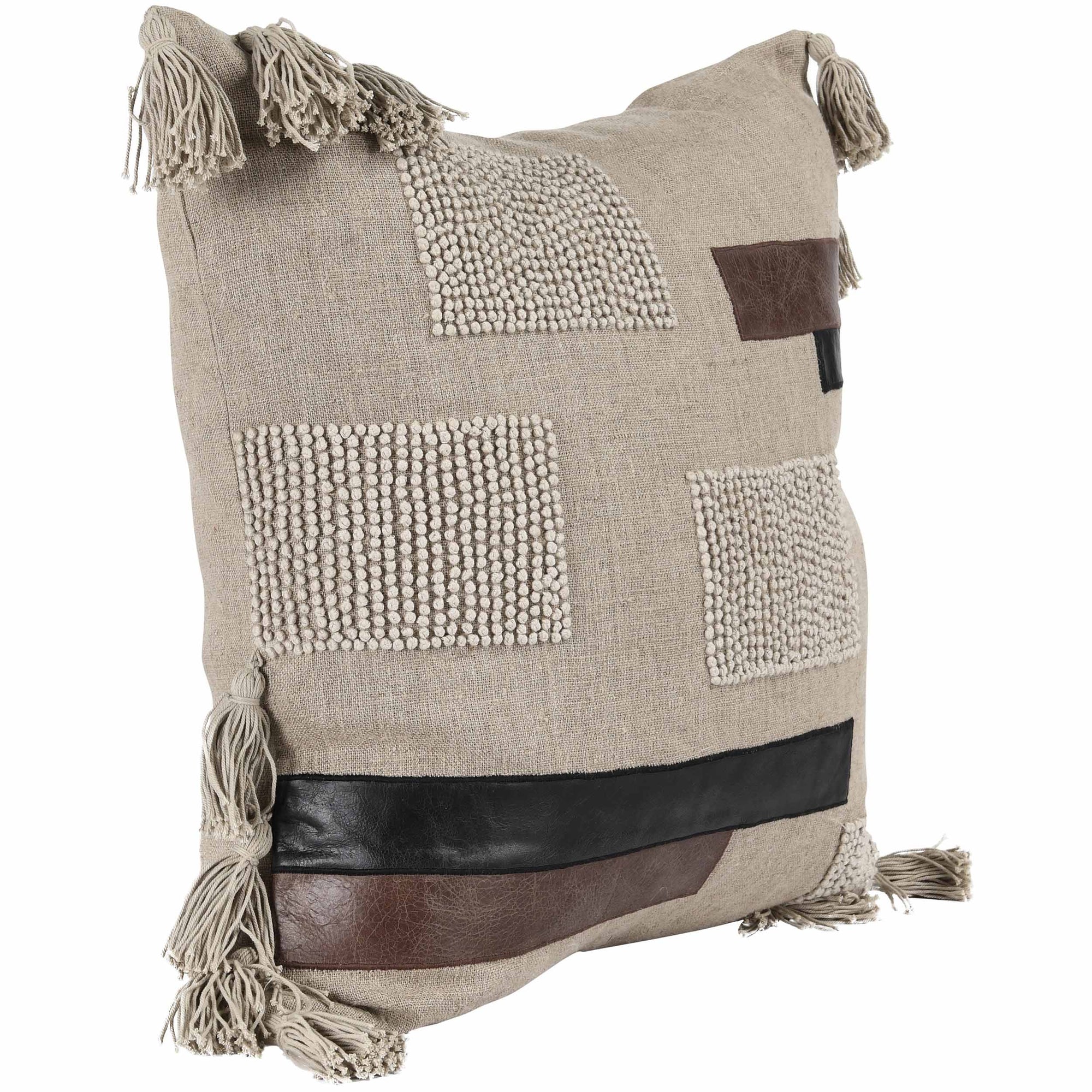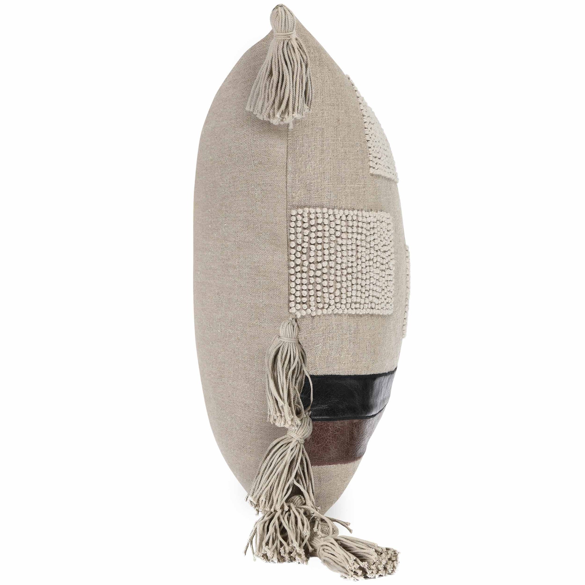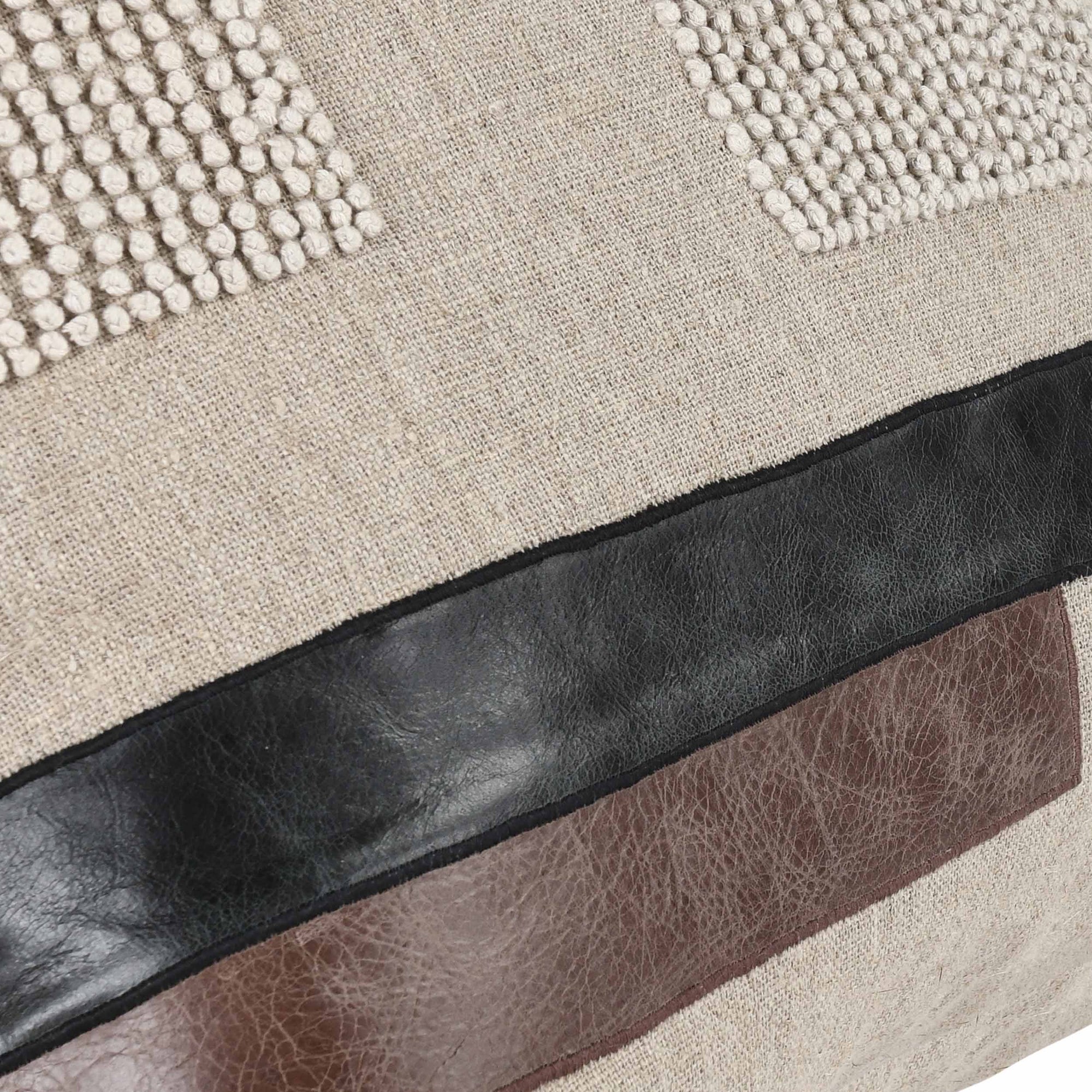 The Packer Pillow, Natural blends neutral tones, textures, and fabrics into a bold yet balanced geometric design. Individually applied leather pieces and hand-knotted embroidery create depth and artisanal appeal, making this handcrafted accent an elevated addition to any space.