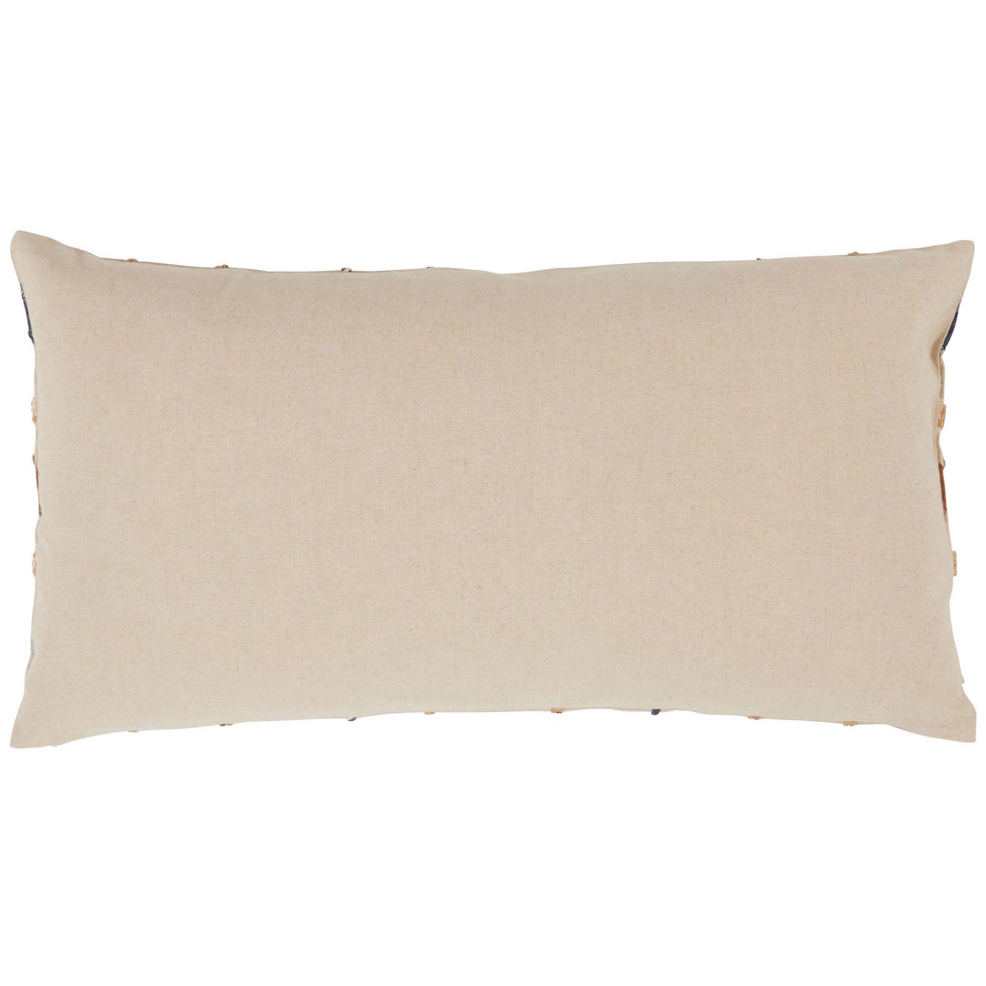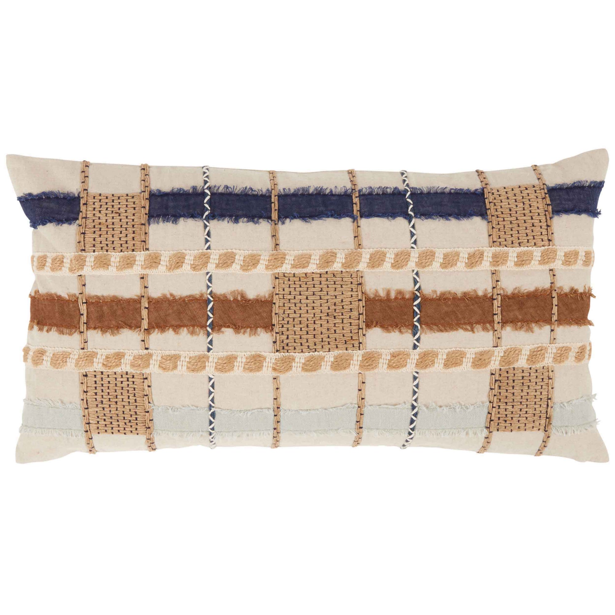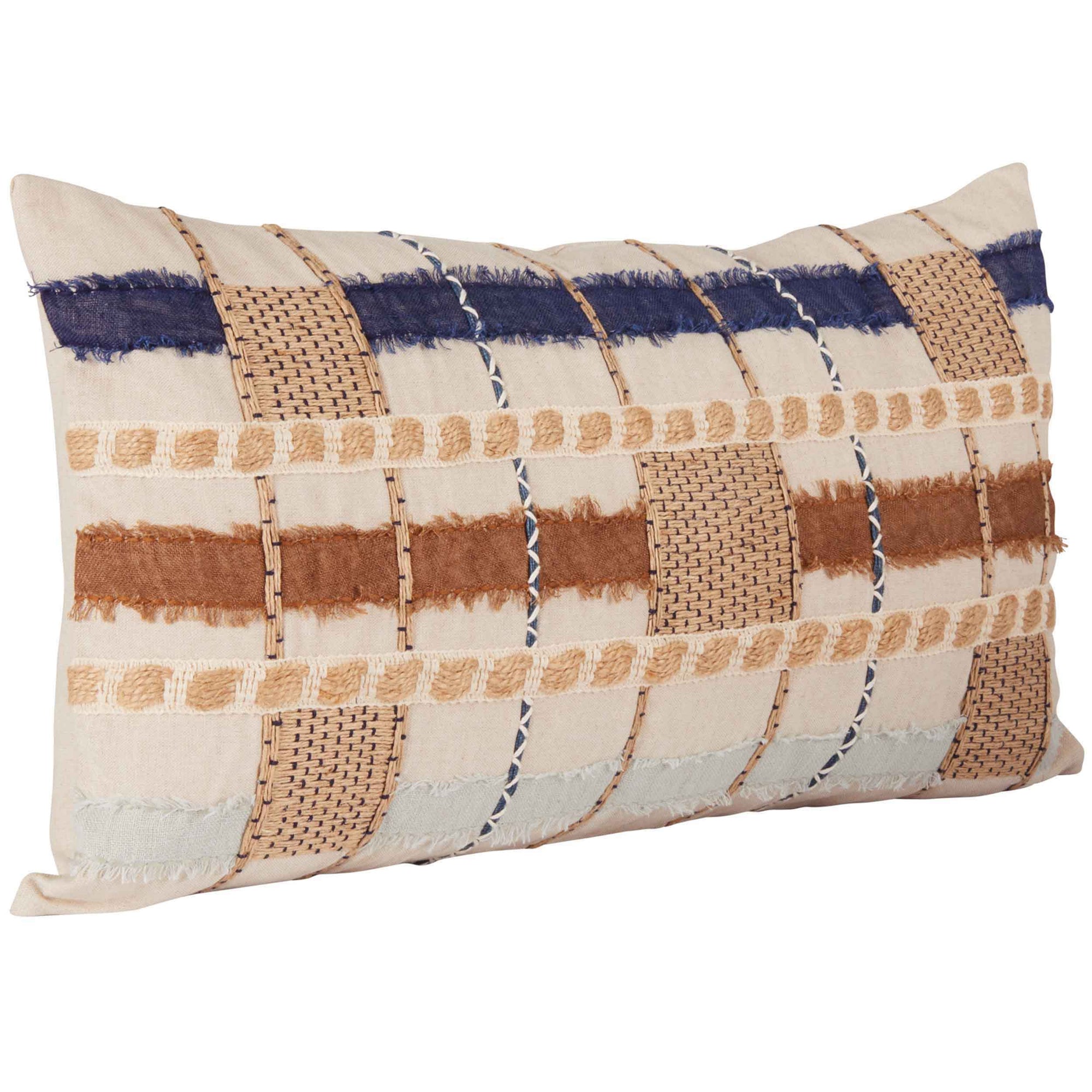 The Stratton Lumbar Pillow features hand-cut and appliqued linen with frayed edging, softening the geometric stripes and squares in its multicolored design. Embroidery and rope detailing add an extra layer of texture, perfect for enhancing a coastal-inspired space.