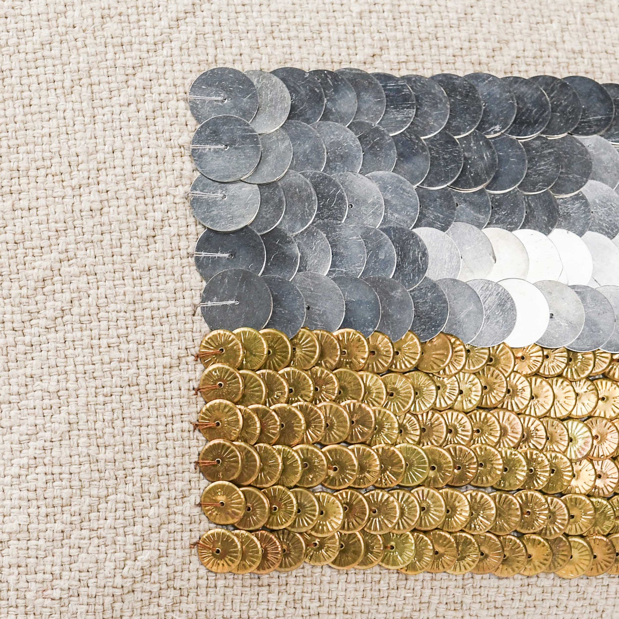 The Tanga Lumbar Pillow features a striking metallic sequin design with handcrafted tassels, delivering a bold statement of style. Over time, the metallic sequins will naturally develop a patina, enhancing the pillow’s unique character and charm. A feather and down insert ensures a lavish, supportive feel, combining beauty and comfort effortlessly.