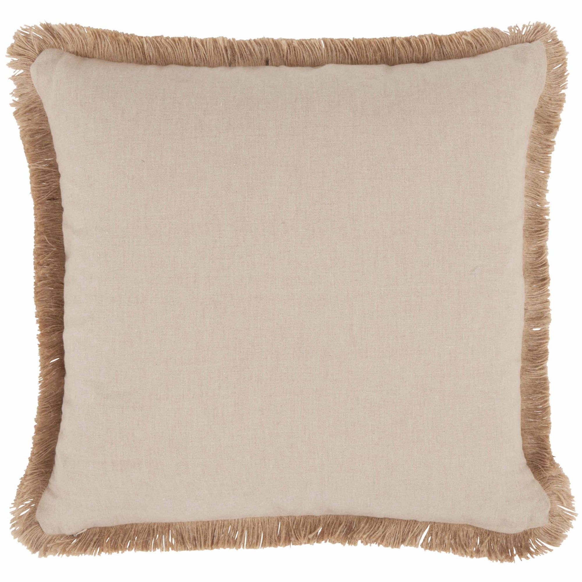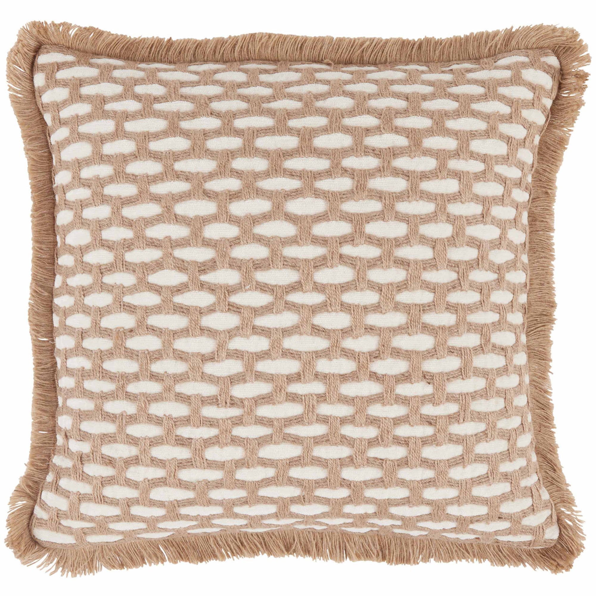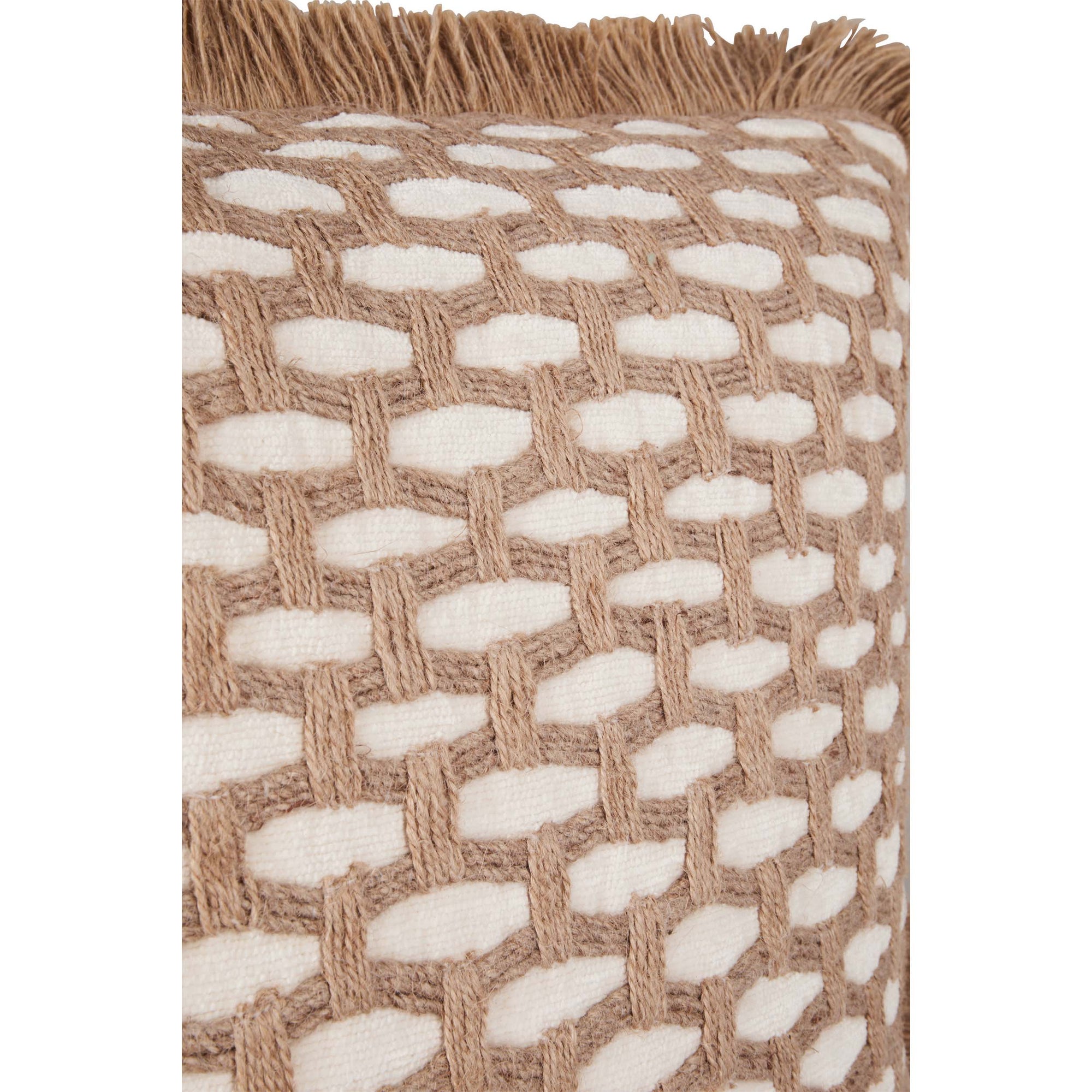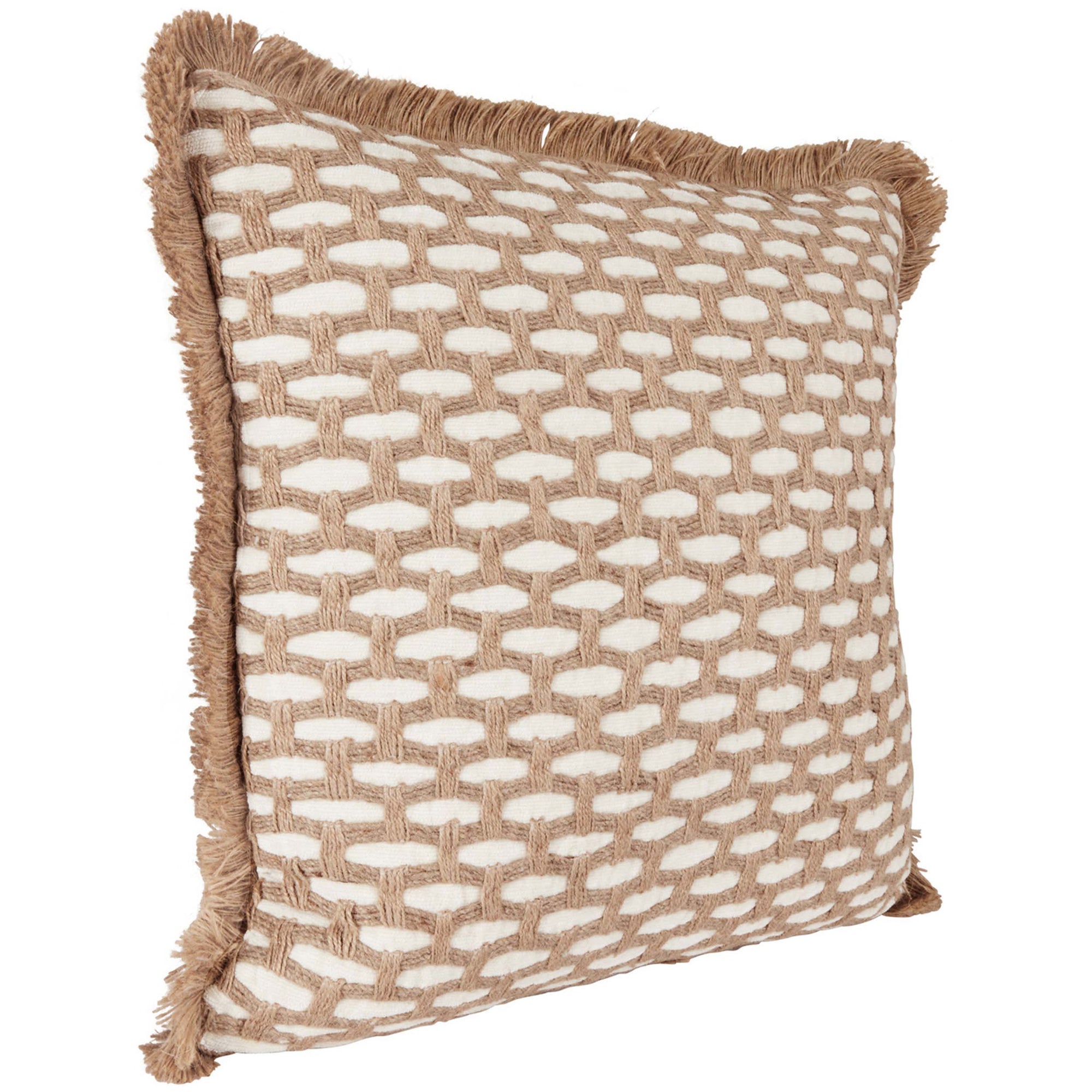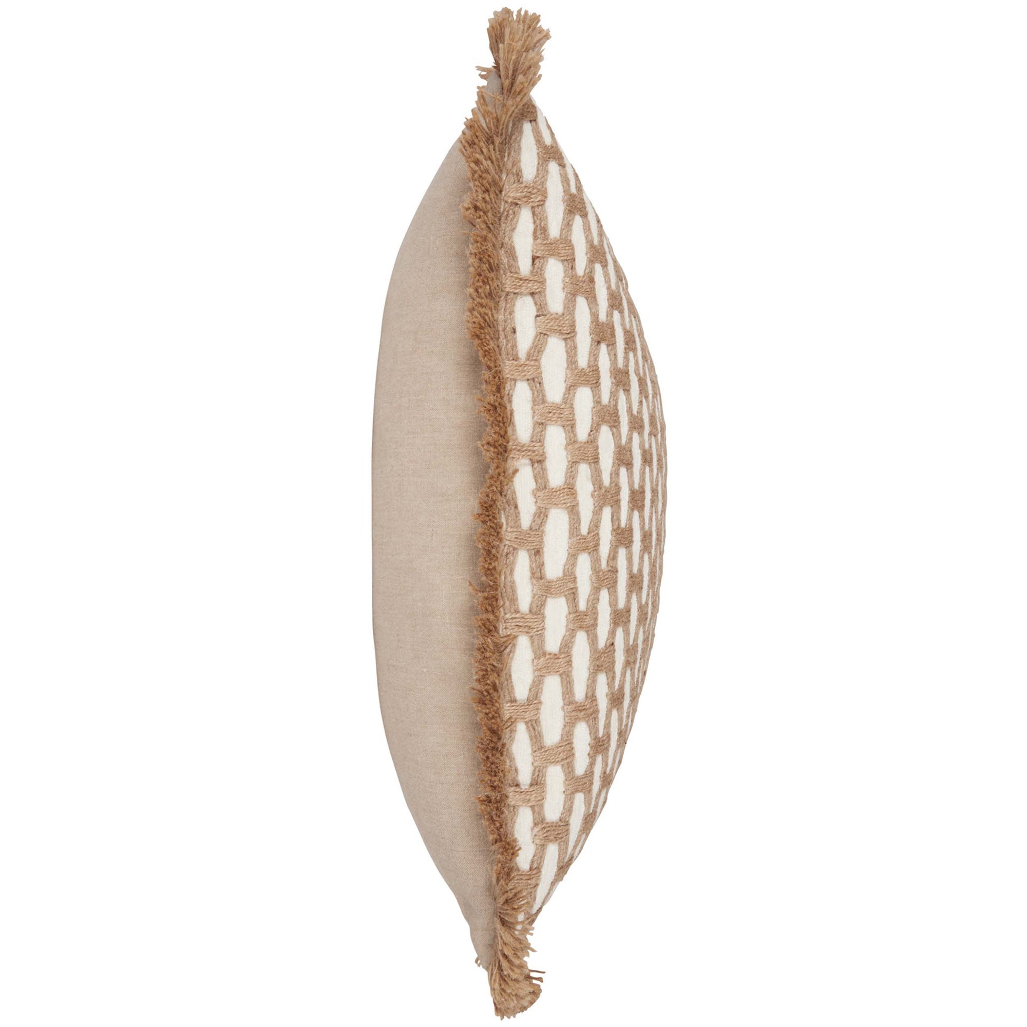 The Timber Pillow, Natural/Ivory, features jute rope embroidery in vertical and horizontal lines that create a casual yet traditional aesthetic. Jute fringe details enhance its classic appeal, while its neutral desert hues effortlessly complement a wide range of color palettes.