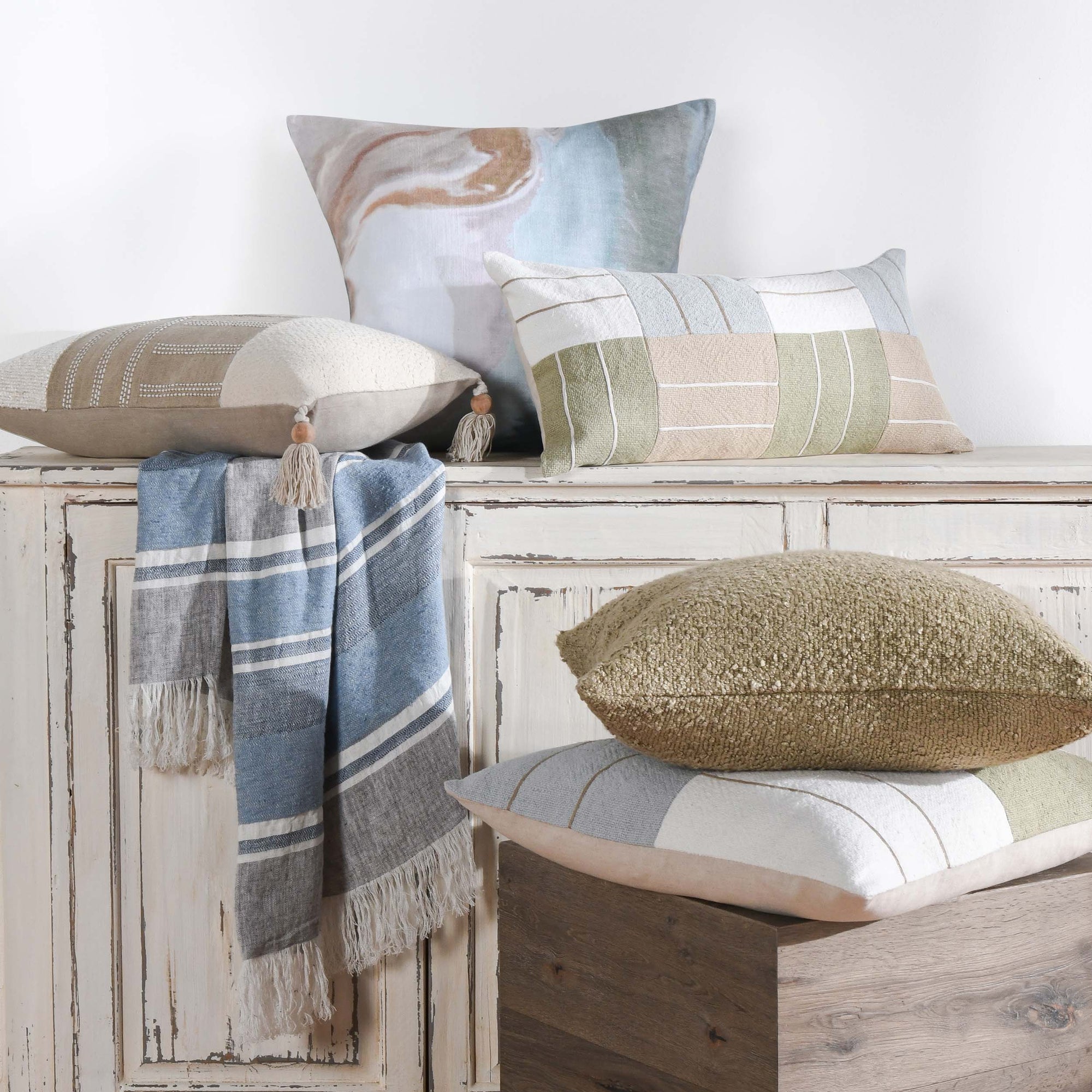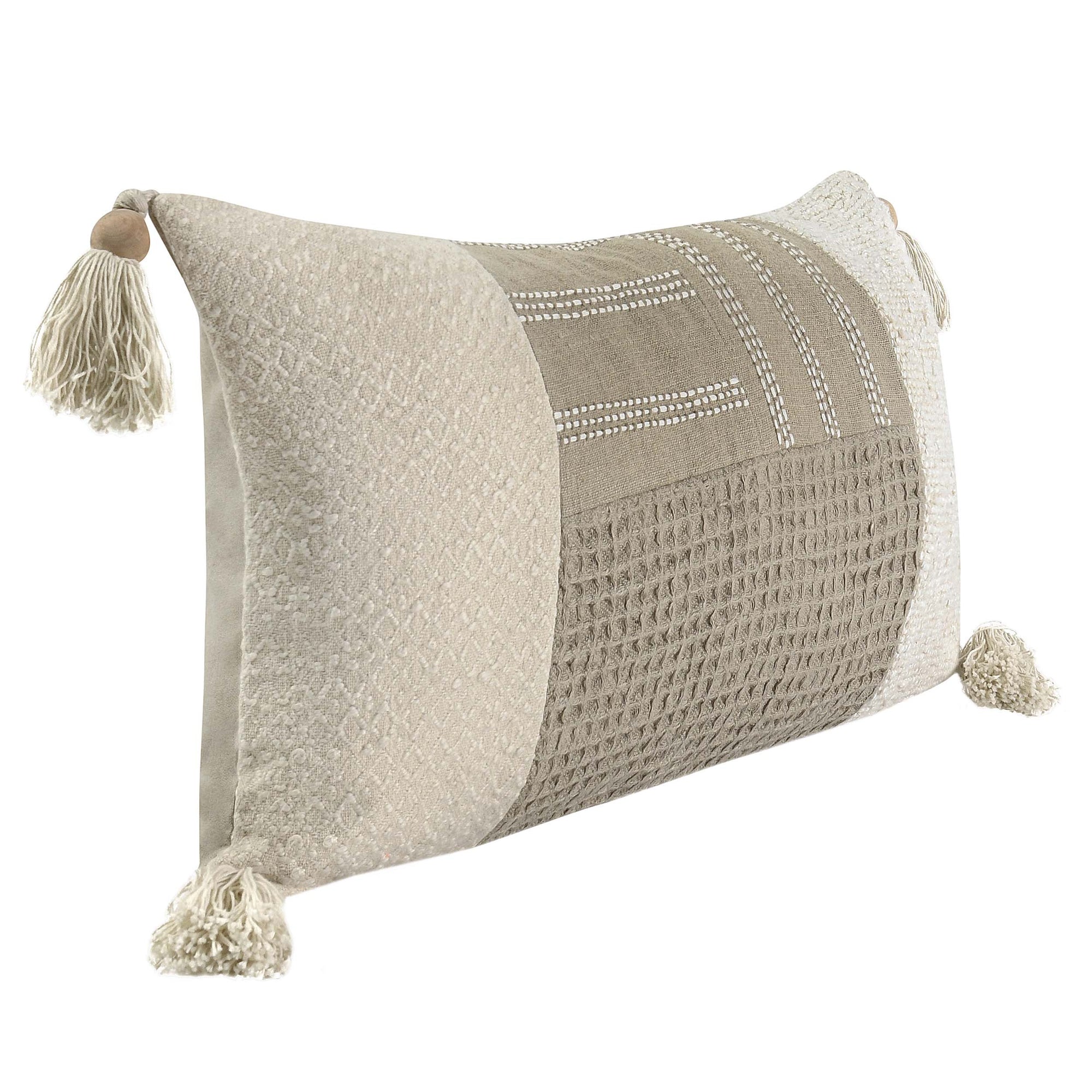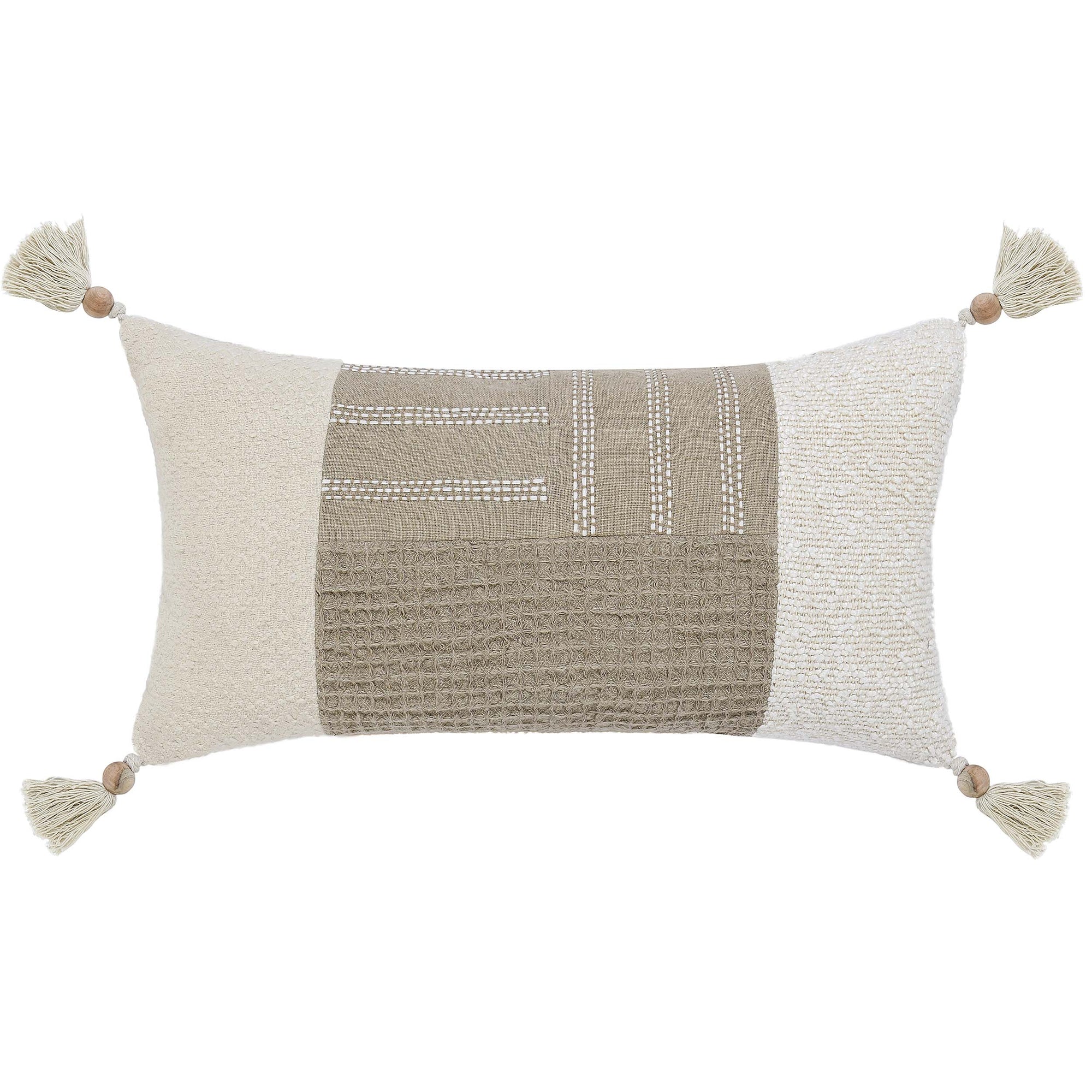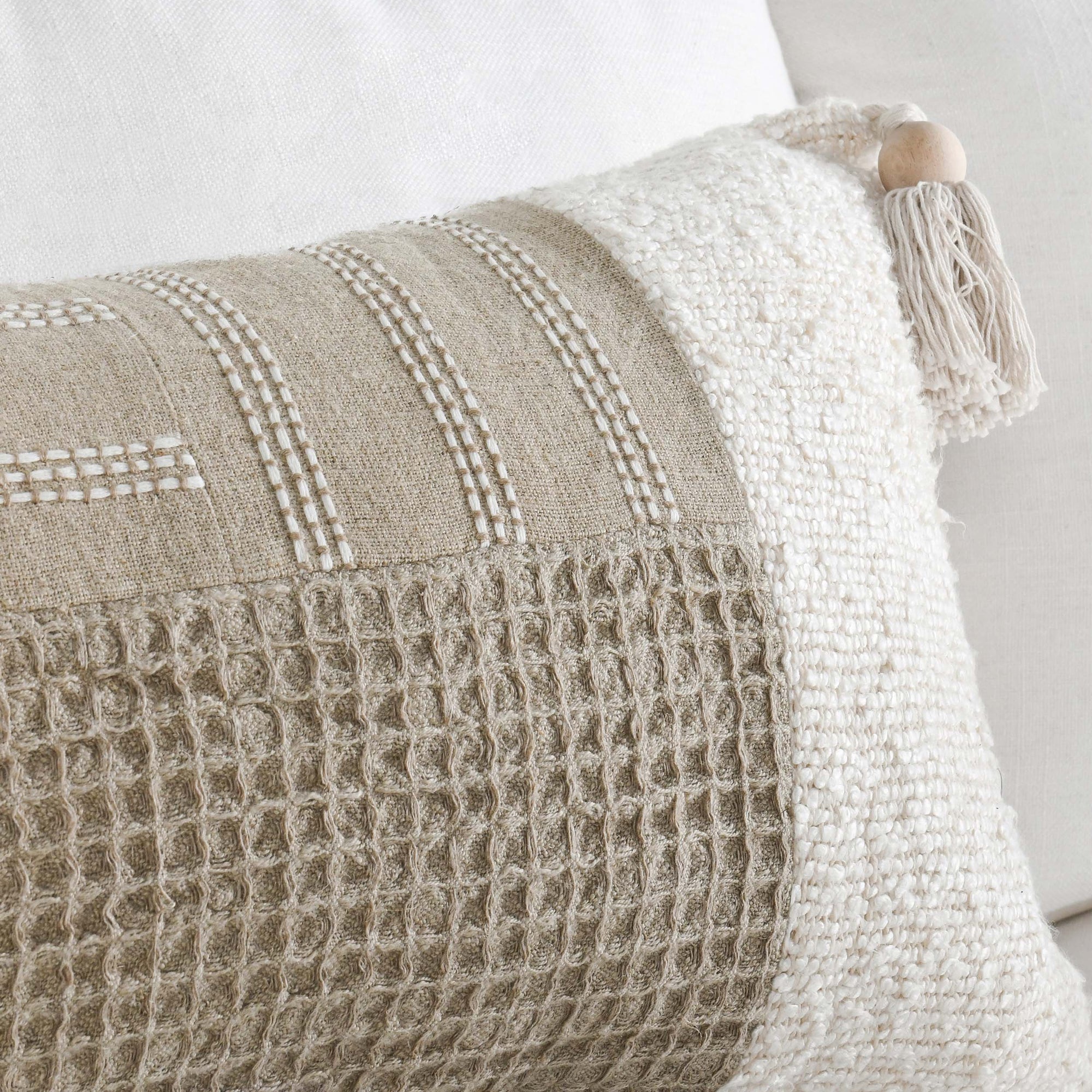 The Yasa Lumbar Pillow, Natural/Ivory features a crisp, subtle texture crafted from Belgian flax linen and cotton, topped with a woven tape applique. Perfect for adding a laidback touch of color and comfort to any space.