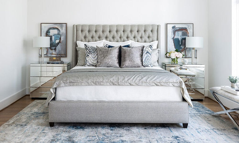 A blissful space in light, silvery tones takes its cue from the towering Amelia Bed. Its practical, high-performance fabric is carefree and long-wearing. Bring on the glam with shimmering accent pillows and modern lines and beveled mirror of the Melrose Nightstand.