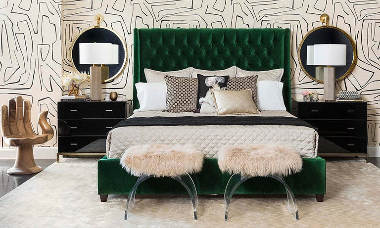 Recline and unwind on the stunning Amelia Bed in velvety Vance Emerald. Balance the find detailing with fur and teakwood accent pieces to create a haven with your style.