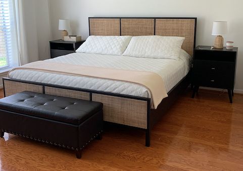 Ordered this bed back in March and waited almost 2 months for it to arrive. But it was worth the wait. The dimensions are just what we were looking for! We ordered a king size bed. The woven headboard is pretty sturdy (since there is actual wood behind the woven cane) and you can lay against it. Totally recommend!