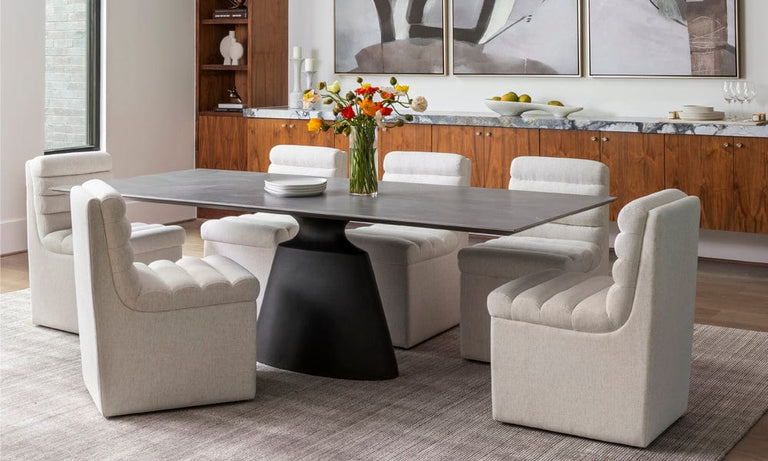 Every meal becomes an occasion. Gather comfy, chic Gabrielle Chairs with casters around an impressive Taji Table.