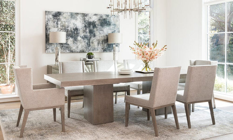 Our grand Linea Rectangular Dining Table soars well beyond the wood dining table of the past. The handsome, hefty structure has a light, washed finish and subtle aluminum trim. Linea Dining Chairs copy its cool, clean lines. The high-style, high-energy Big Bang Entertainment Console is a burst of energy in radiant silver foil.