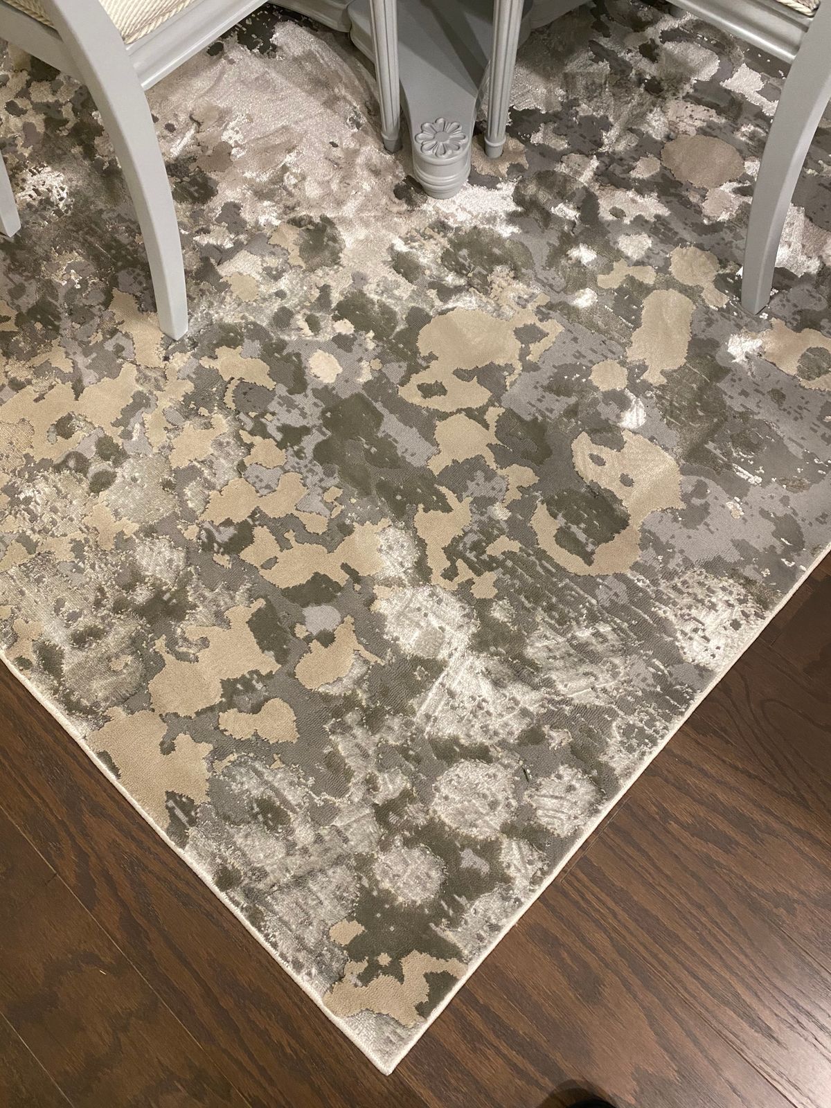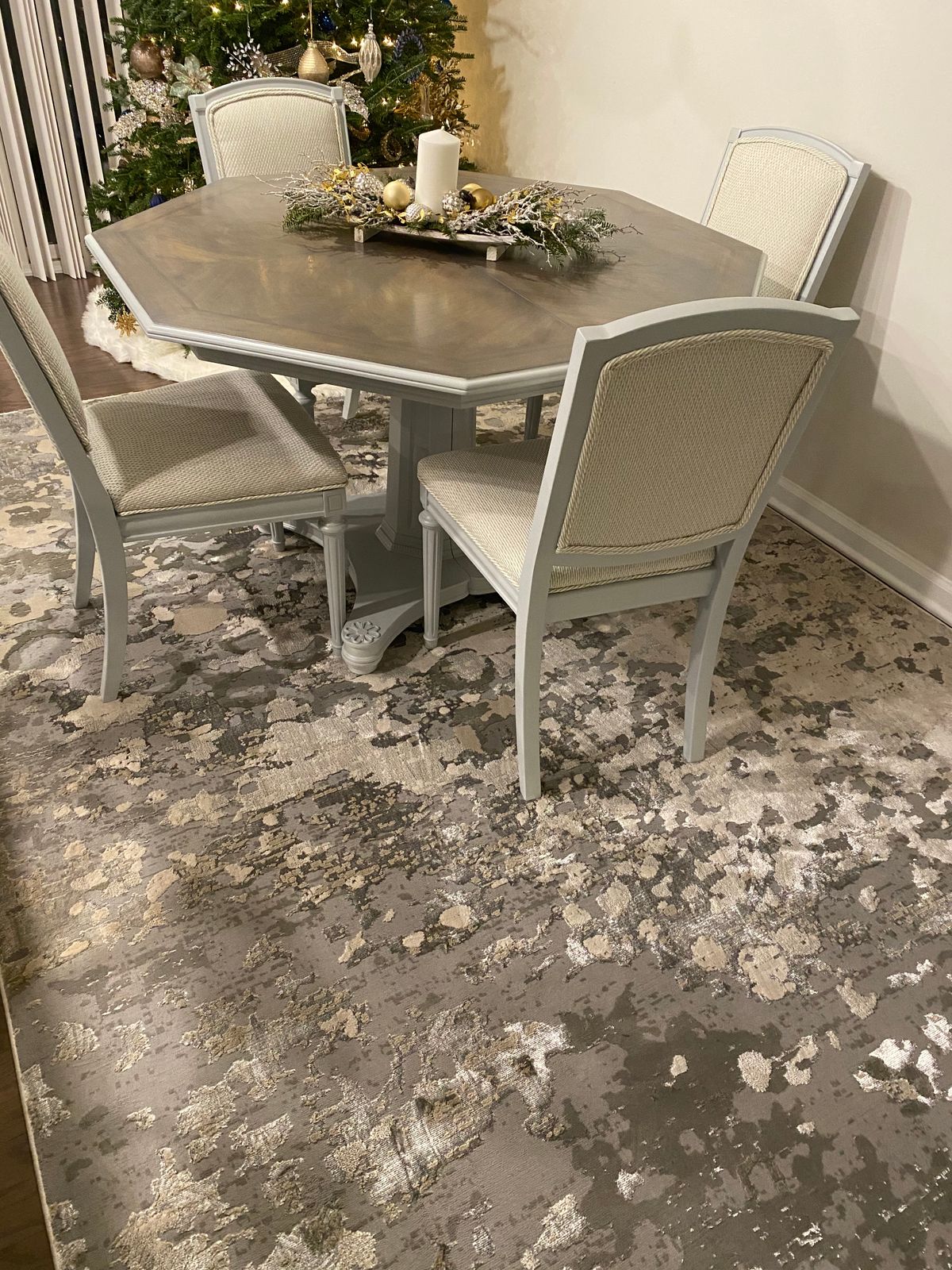 I love my luxurious rug! The silvers and grey are gorgeous. Makes the dining area look and feel extra special!