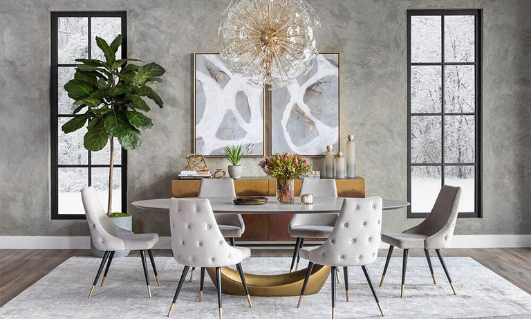 Dining Table is built to impress with a sweeping, golden base and oval, marble-look