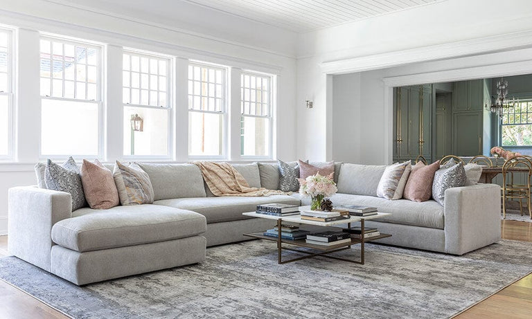 Plenty of space for family and friends to gather on the Salvador Sectional. Over-stuffed and inviting, it's available in 350+ fabrics including this high-performance option. Stash books and board games on the lower shelf of the spacious, marble-topped Olivia Square Coffee Table. For a Retro, Deco vibe, add the Noelle Credenza with limestone top and golden details.