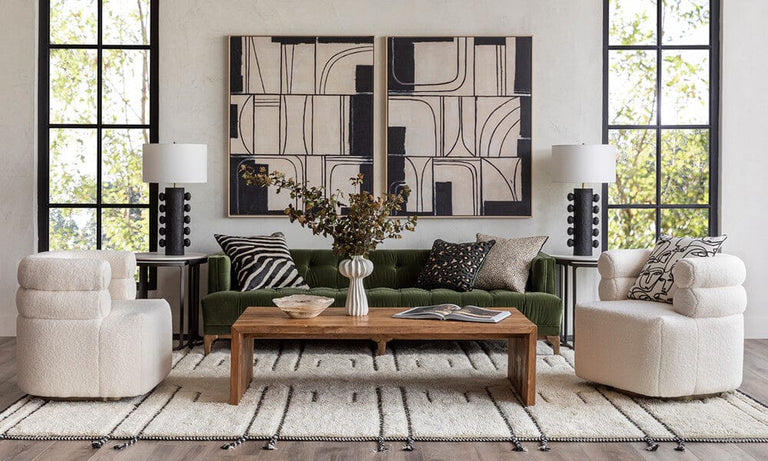 Play with texture for all-out luxe. Deep tufting in dreamy, green velvet delivers the luxury in our Dylan Sofa. To up the opulence, bring in the Jolo Swivel Chair in plush, faux sheepskin. Stylized art strengthens the Deco vibe.