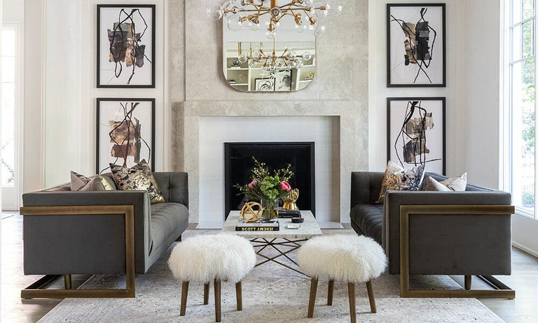 An aligned arrangement makes an impact, yet each piece stands on it own. The button-tufted Ekon Sofa with bronze frame is sleek and substantial. Add lighthearted luxe with the Wellington Ottoman in natural, Mongolian lamb. A striking Skyy Coffee Table of Carrara marble grounds the group.