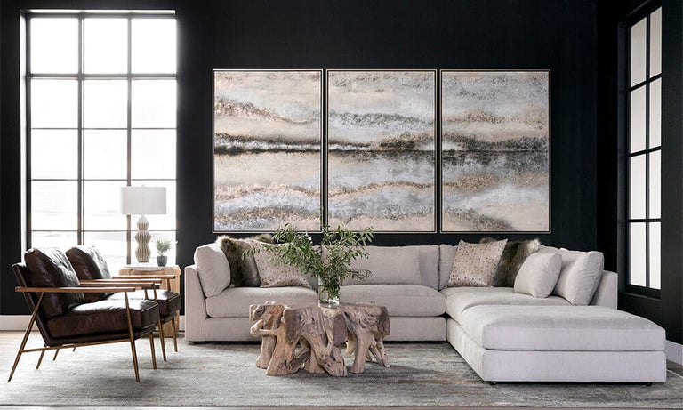 contrast with the smooth, angular Amani End Table. The artful triptych implies a distant horizon.