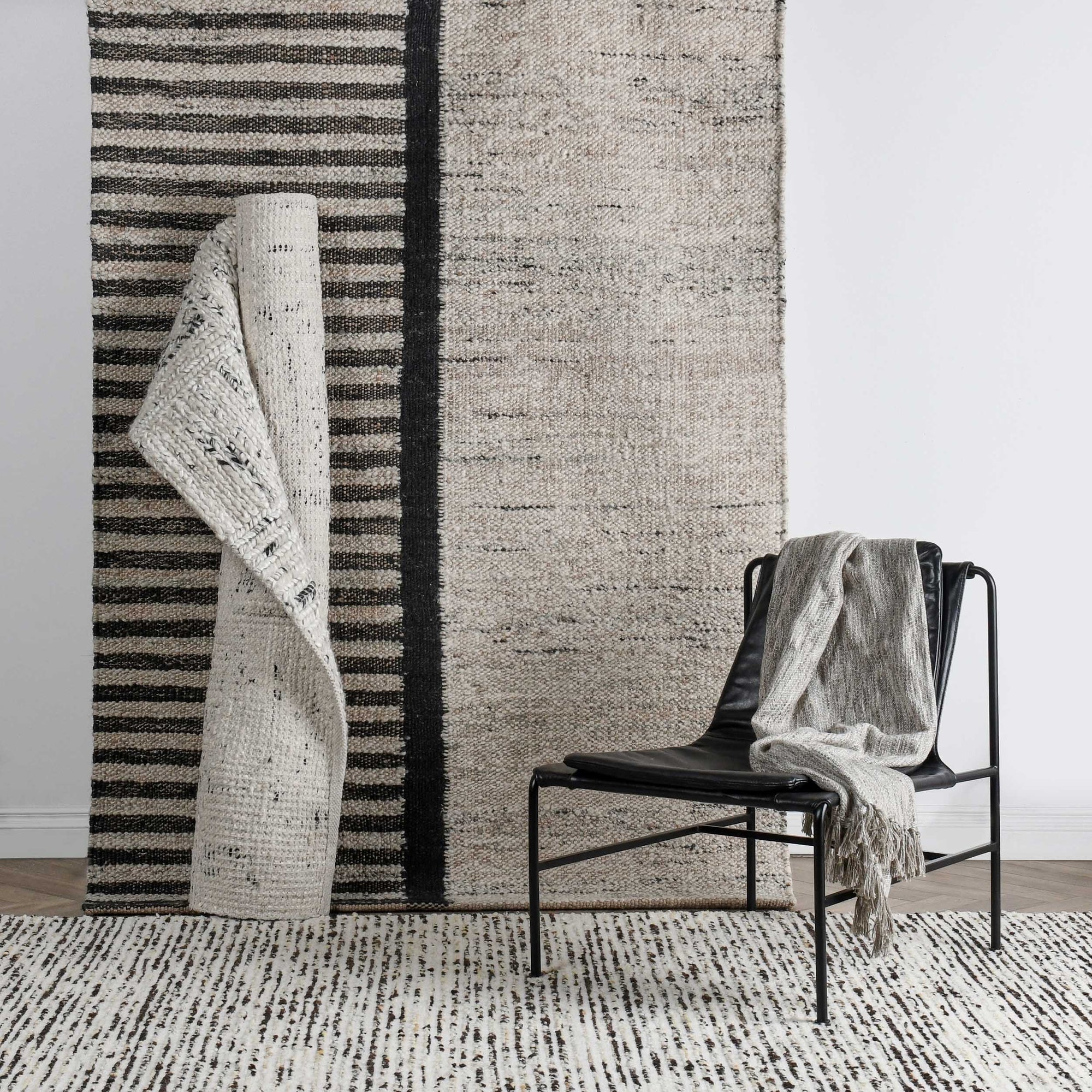 The Kofu Stripe Rug blends soft wool with durable jute to create a striking yet organic design. Bold black striping contrasts gracefully with a natural-toned background, making it an excellent choice for those who appreciate bold simplicity. Handcrafted with sustainable materials and made for medium traffic, this rug adds depth and dimension to any space.