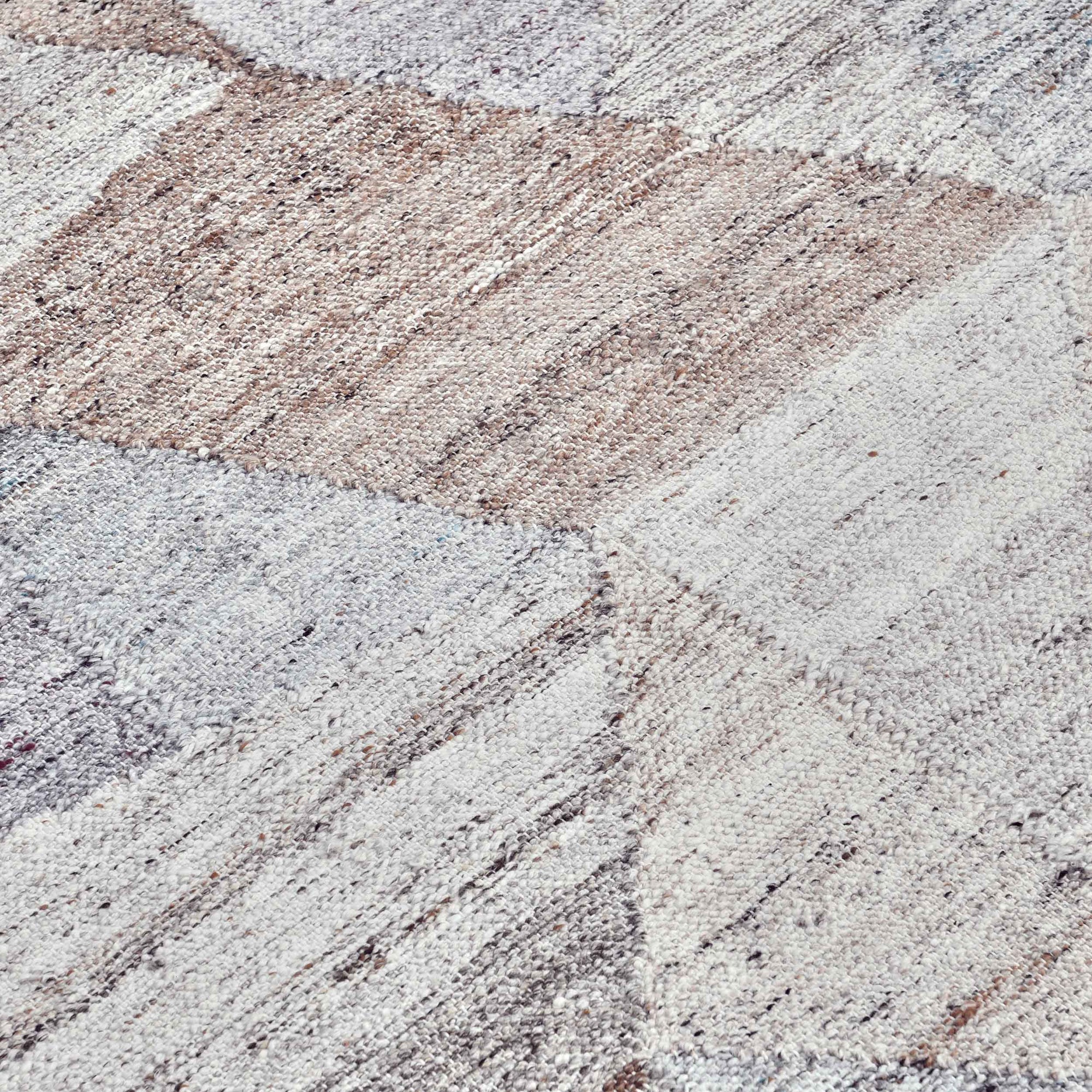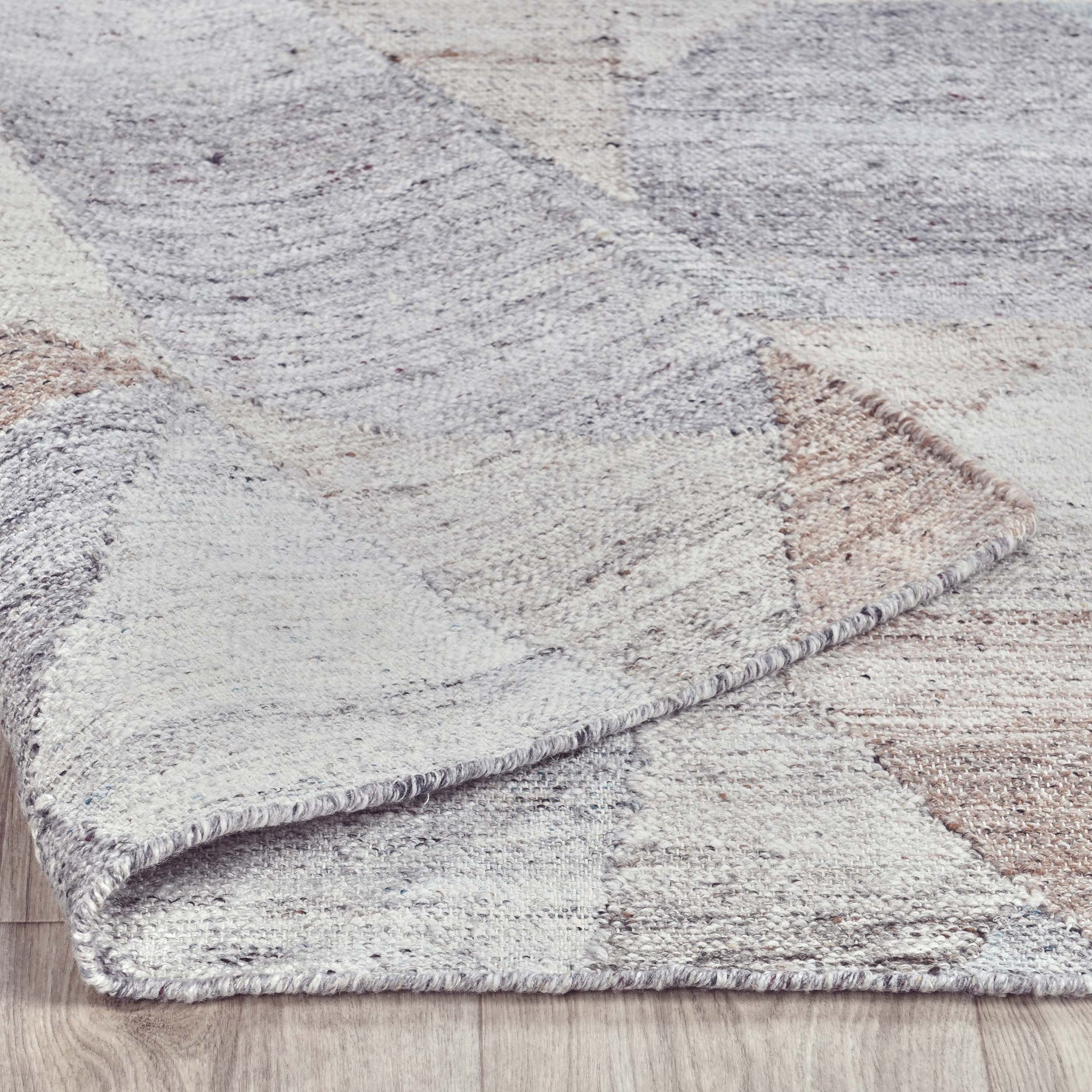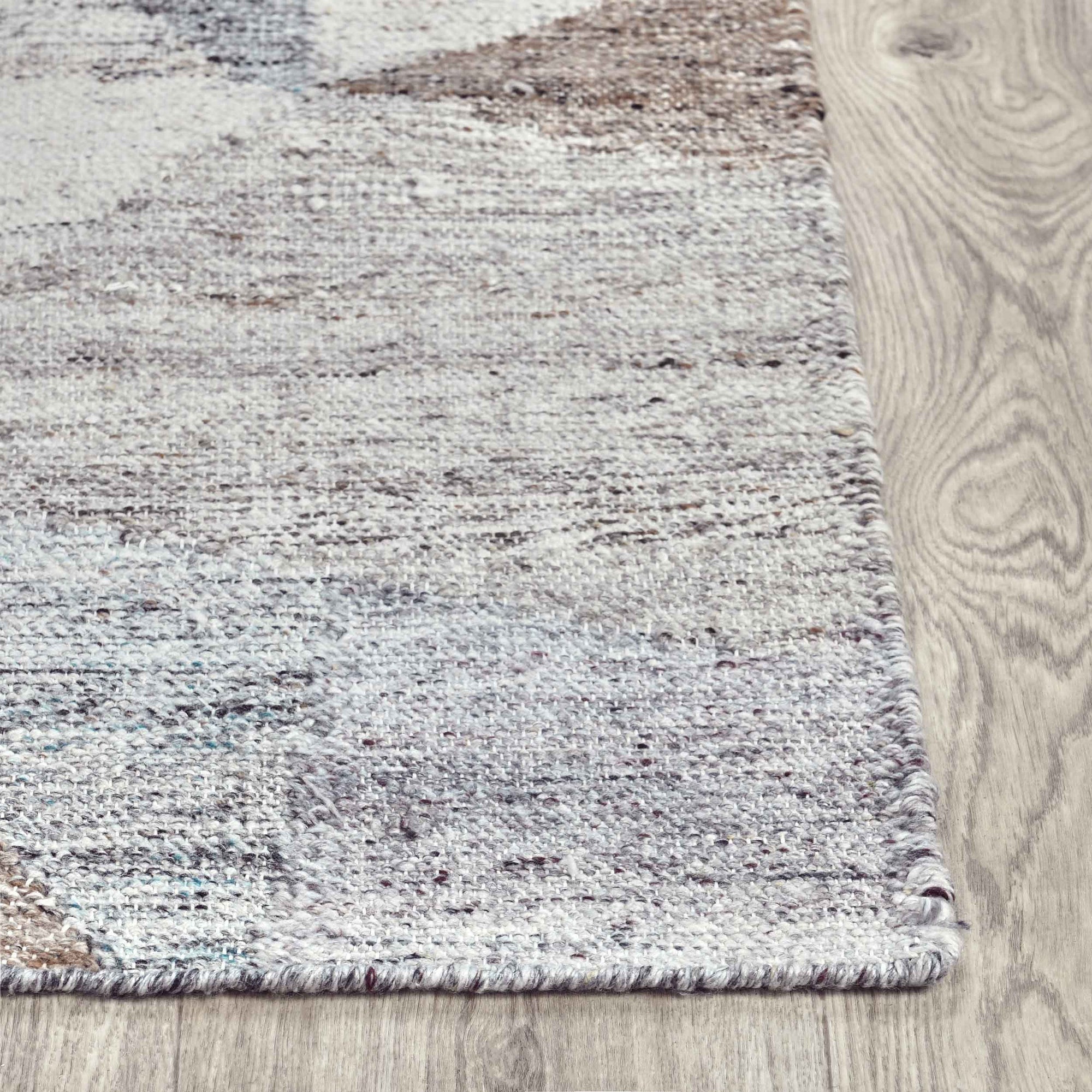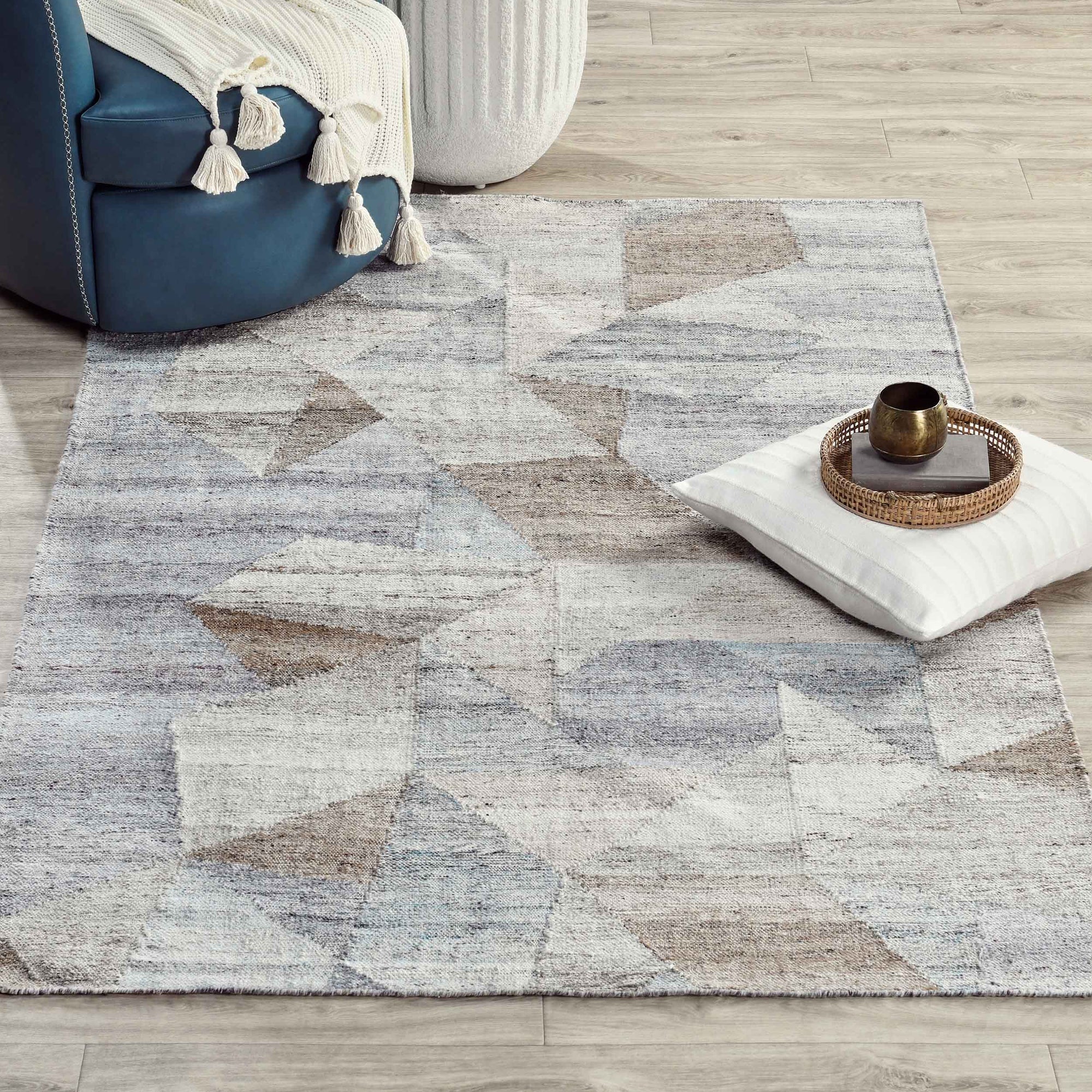 This handwoven outdoor rug brings modern artistry to your space with a geometric pattern and abstract coloration. Sandy neutrals and soft blue-gray tones offer visual interest, while the polyester yarn made from recycled plastic bottles provides sustainable style. Suitable for both indoor and outdoor settings, this durable and textured rug brightens any area with artisanal charm.