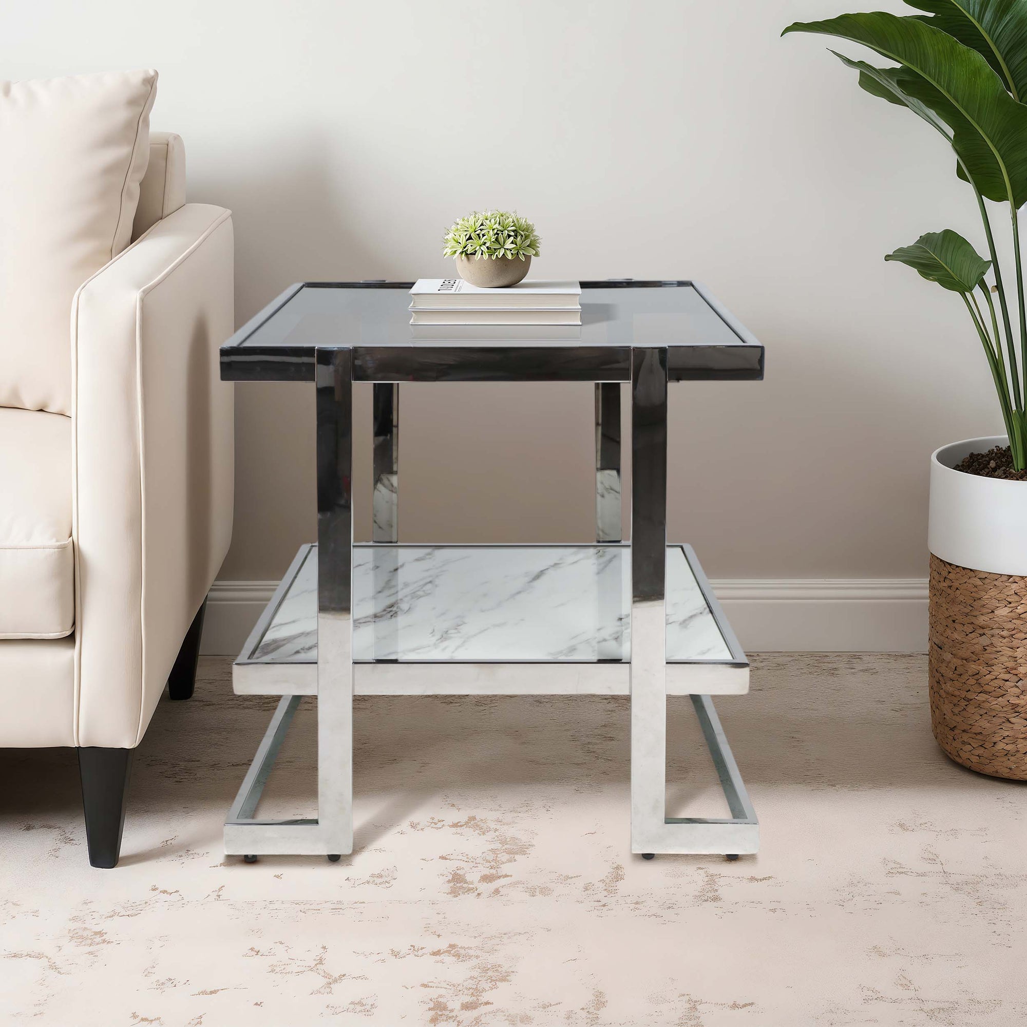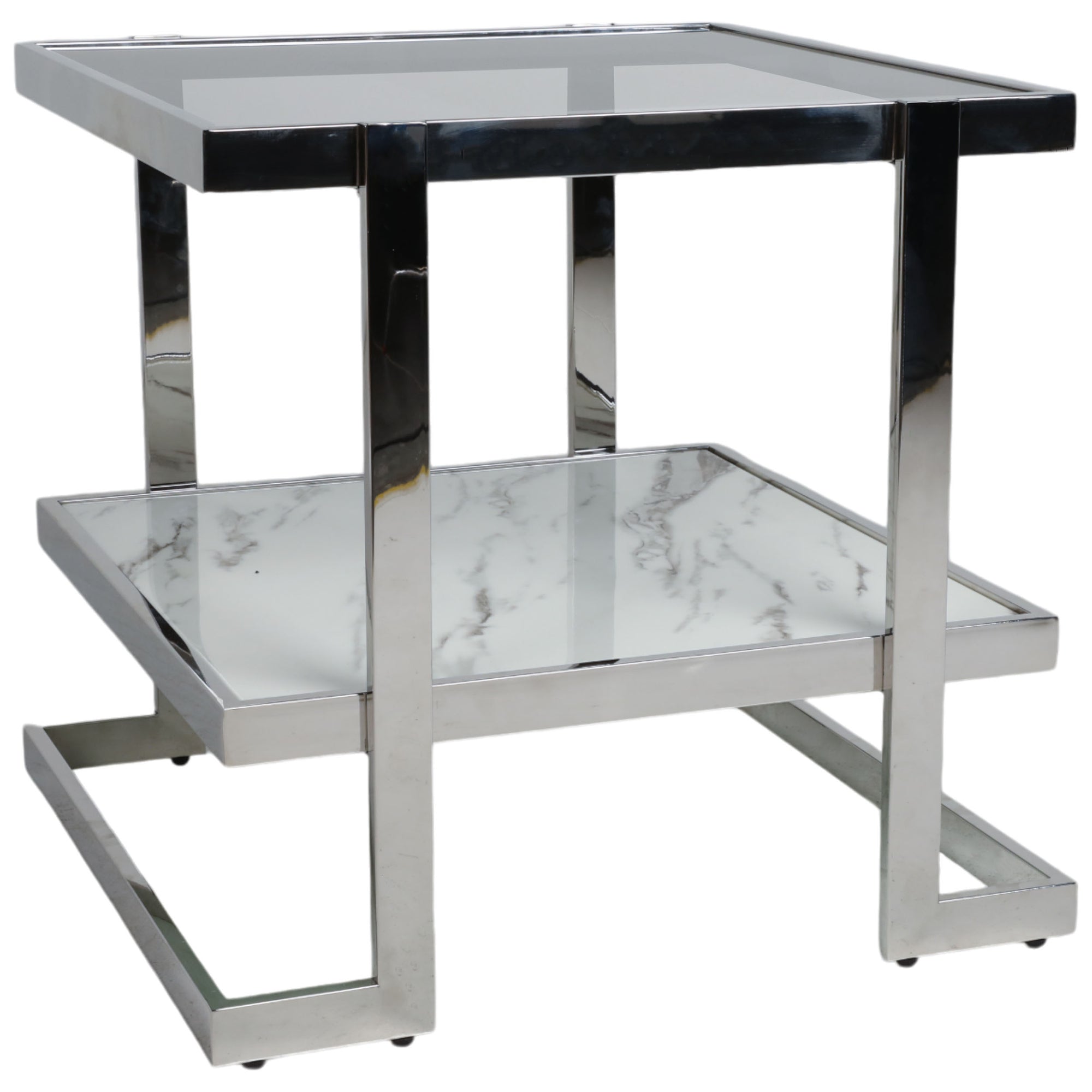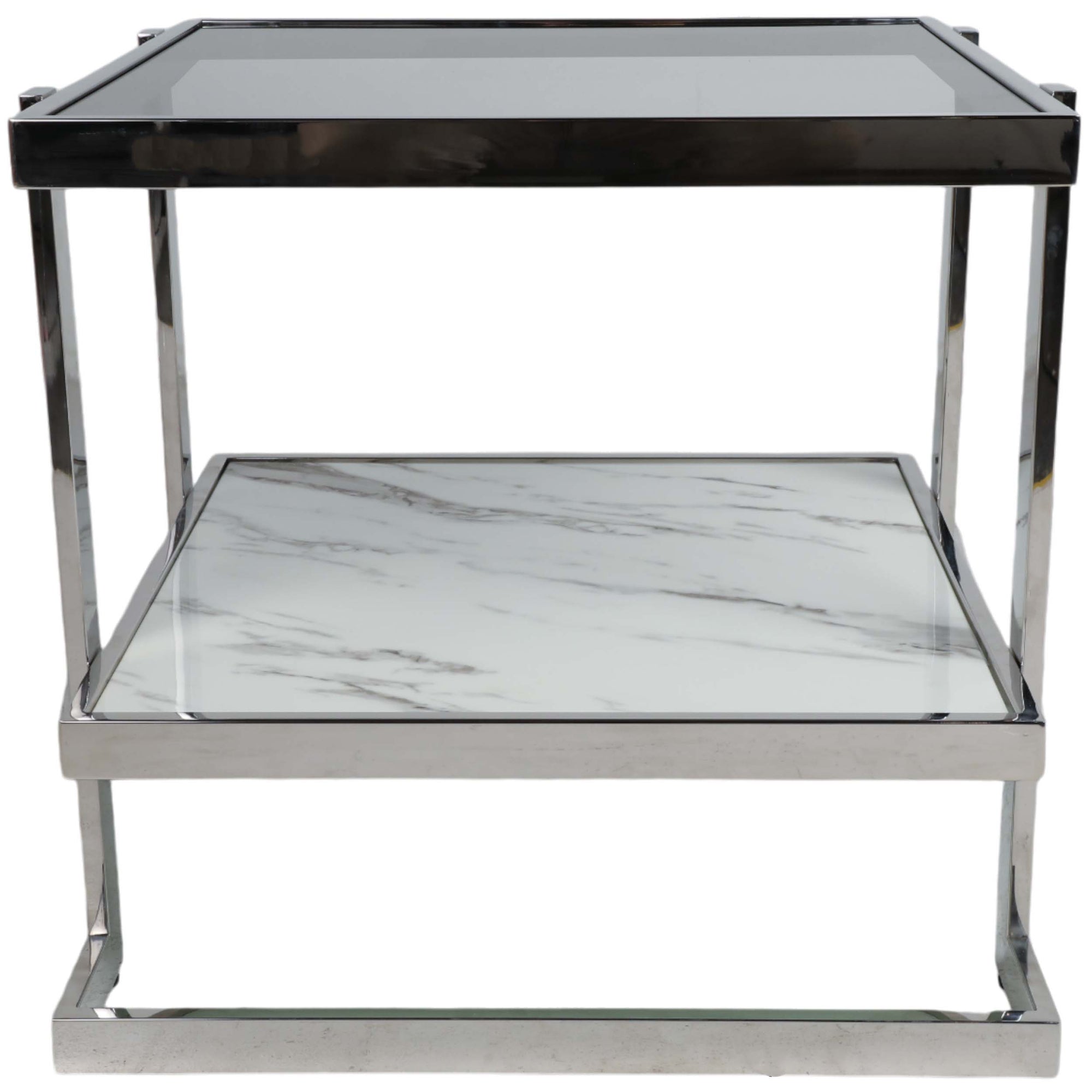 The 2-Tier Marble Top Side Table is a striking blend of modern design and practical functionality. Featuring a unique geometric silhouette, it adds a stylish accent to any living room, bedroom, or office space. Crafted from stainless steel with a marble glass top, this table offers durable construction while remaining lightweight and easy to move. The two tiers provide versatile surfaces for displaying décor, holding drinks, or organizing everyday essentials, making it perfect as a side table or even a compact coffee table. Its sleek combination of metal and marble glass brings contemporary elegance, while the geometric design adds visual interest and sophistication. This versatile piece effortlessly enhances both modern and transitional interiors, delivering style, functionality, and long-lasting quality in one chic package.