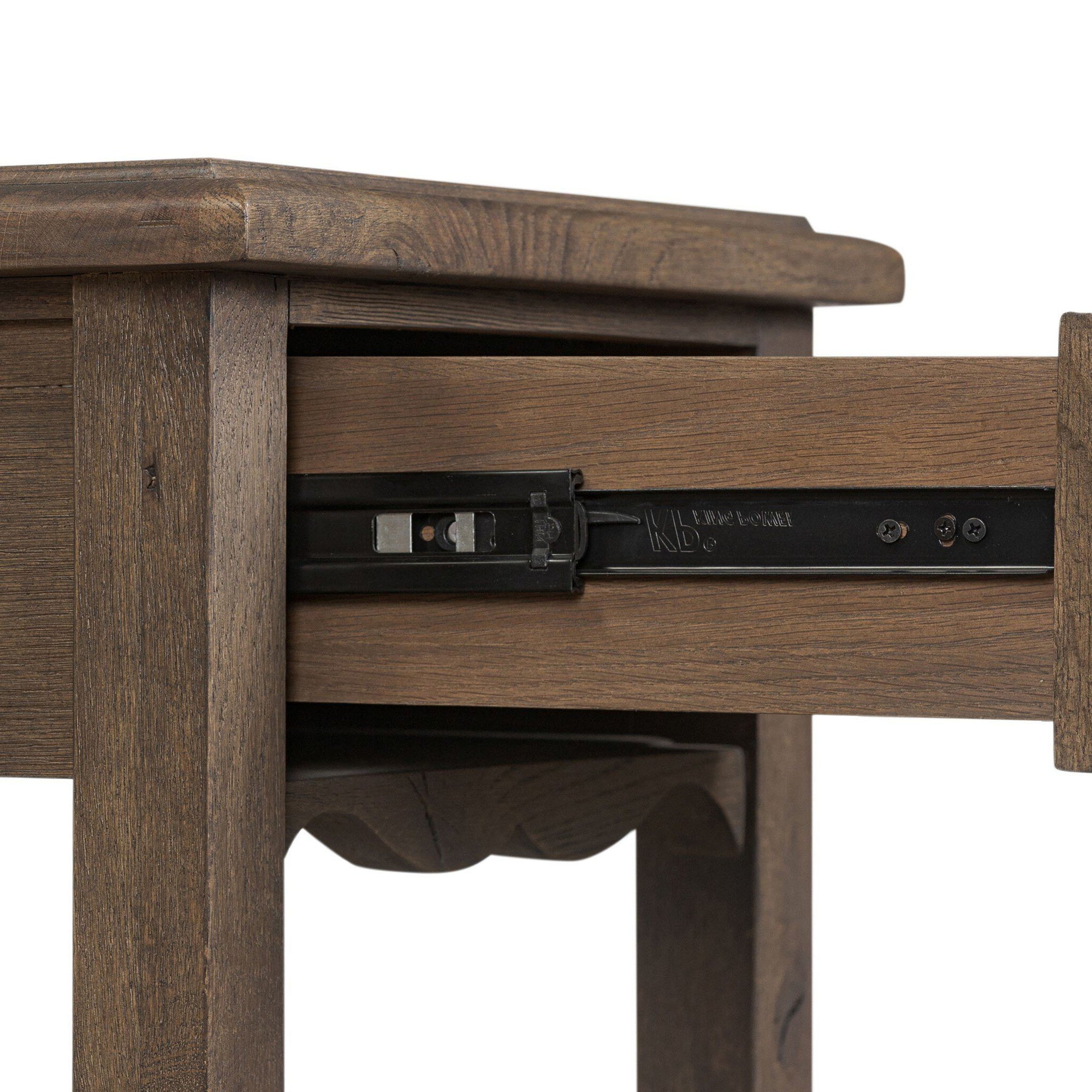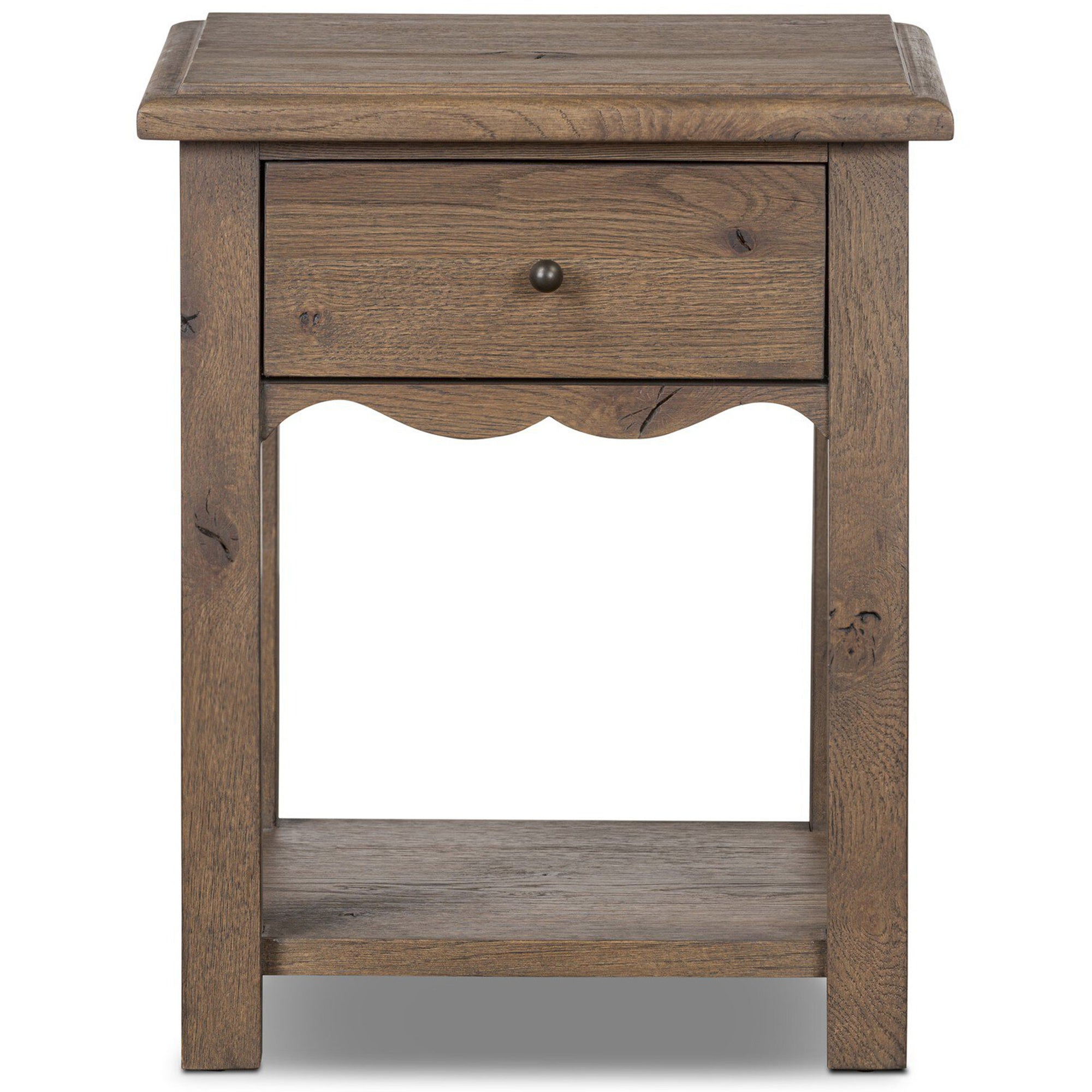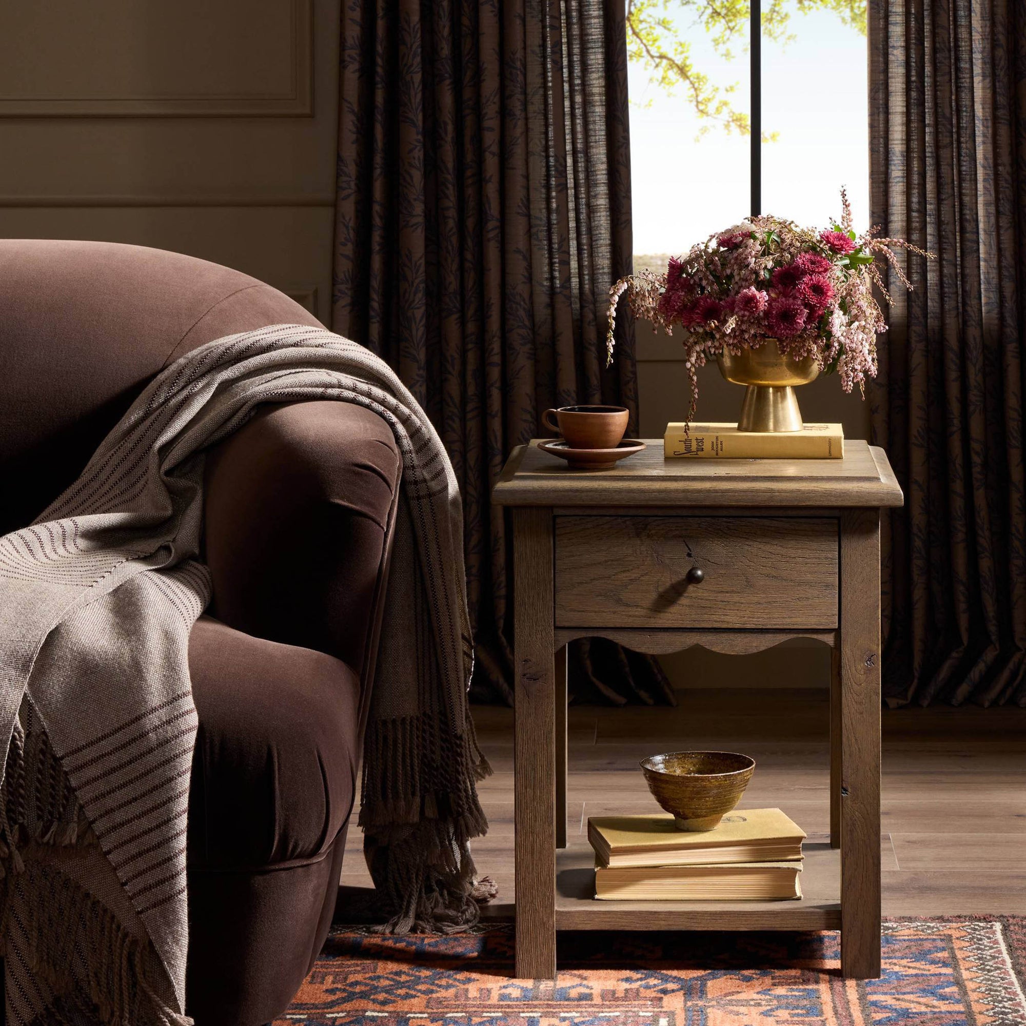 The Bayla End Table brings timeless character to smaller spaces. Crafted from solid and veneered oak in a weathered finish, it features an overhang top, a decorative apron, and a single drawer with metal glides for smooth operation. A lower shelf provides additional storage or display space, blending functionality with refined, classic style.